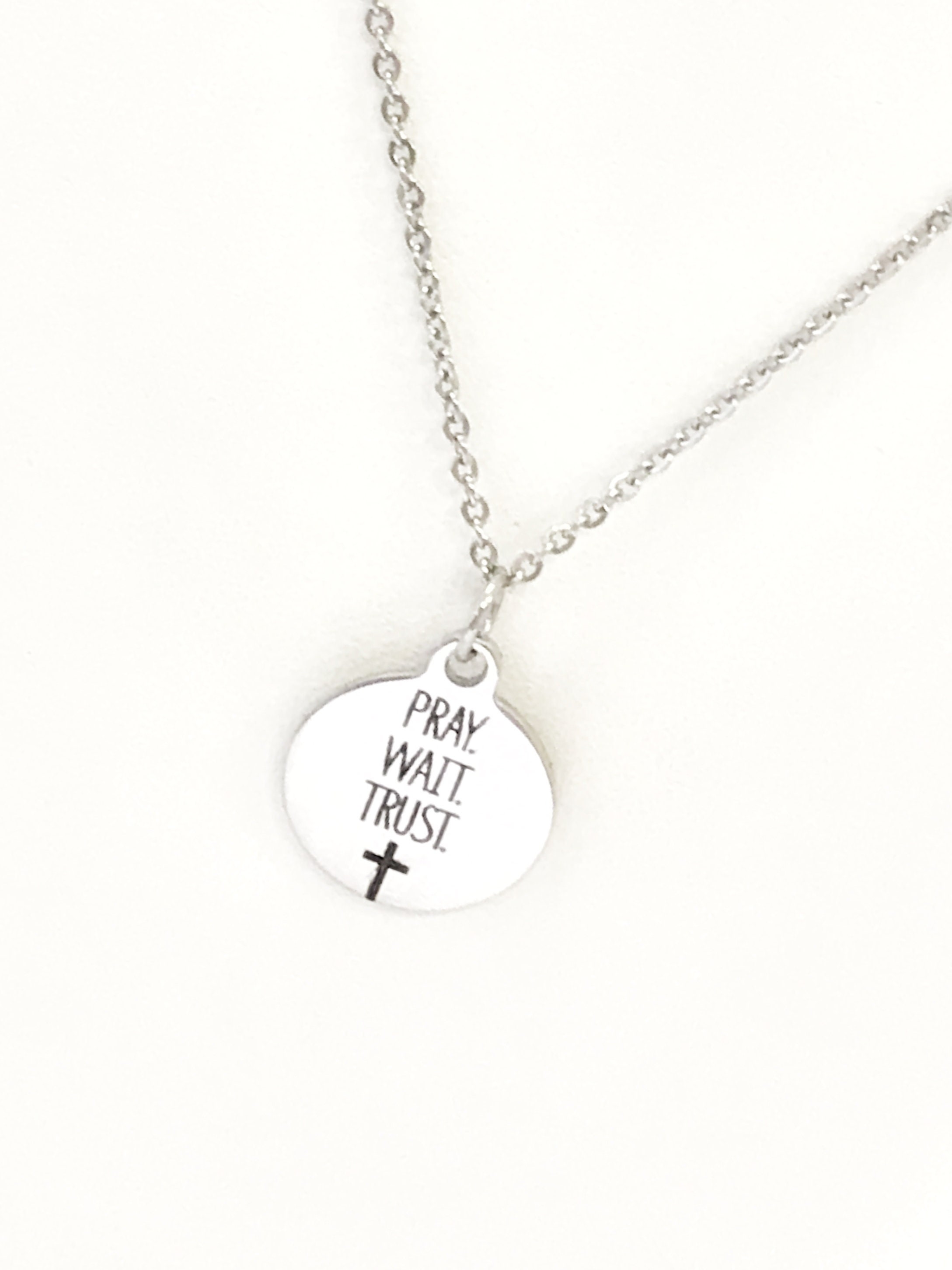 This is a simple but Christian gift pendant necklace. The pendant is a stainless steel laser engraved charm that has “Pray Wait Trust” on it. This pendant is available on your choice of 16, 18, 20, 22, 24, 26, 28 or 30 inch chain. The pendant is also available for individual purchase if you have another chain on which you would like to wear it.