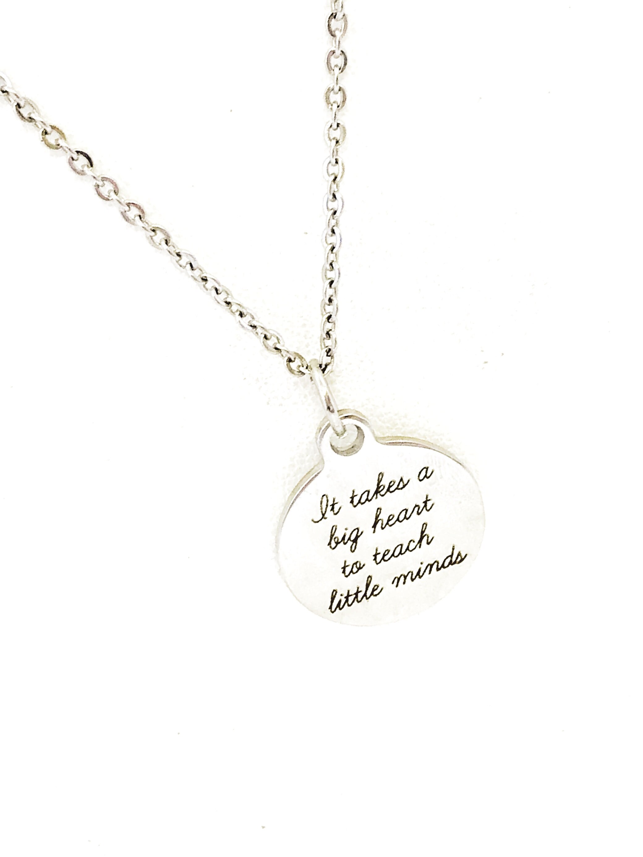 This beautiful necklace gift would make a great gift for a new teacher or a back to school gift for the teachers in your life. The pendant is a stainless steel laser engraved pendant that has “It takes a big heart to teach little minds” on it.