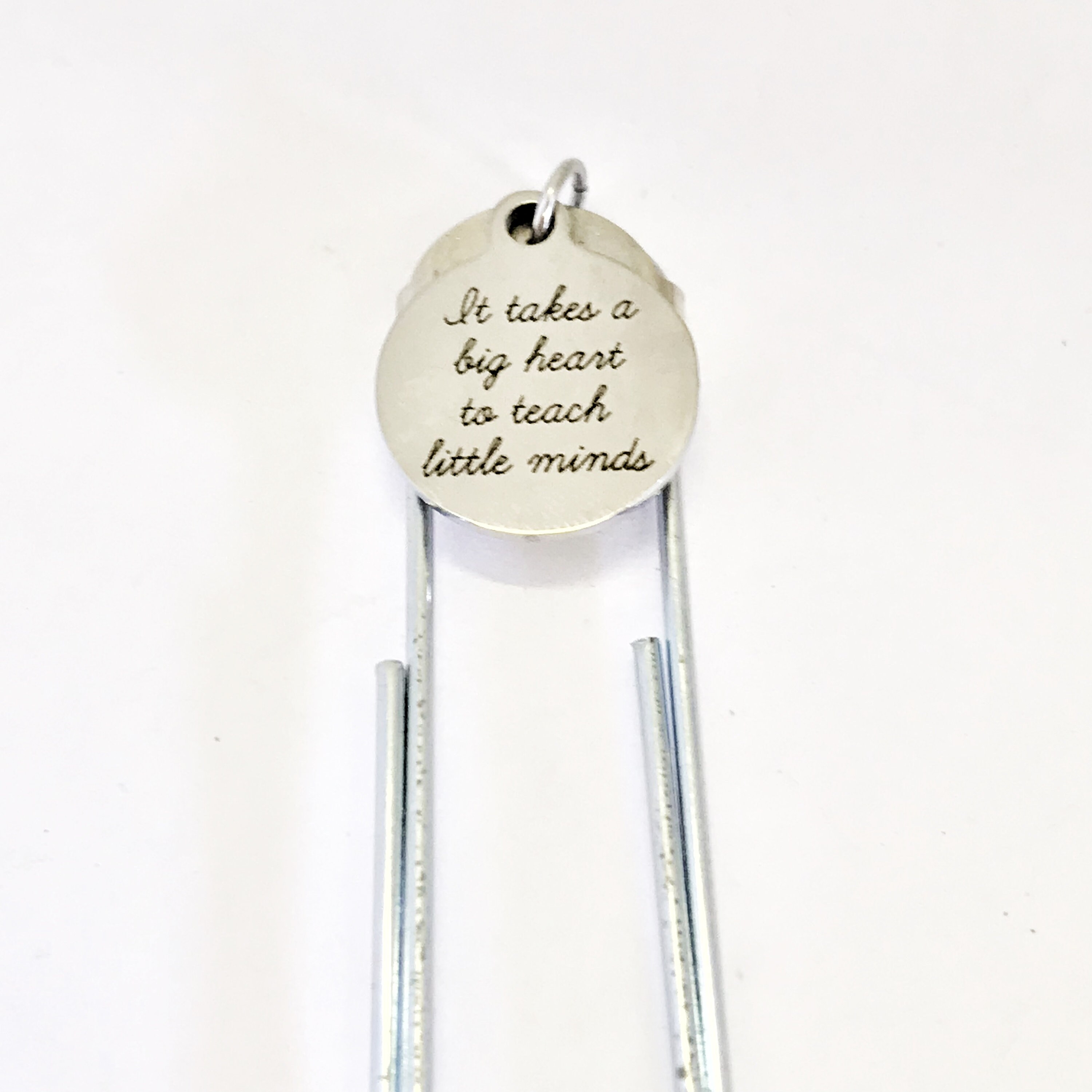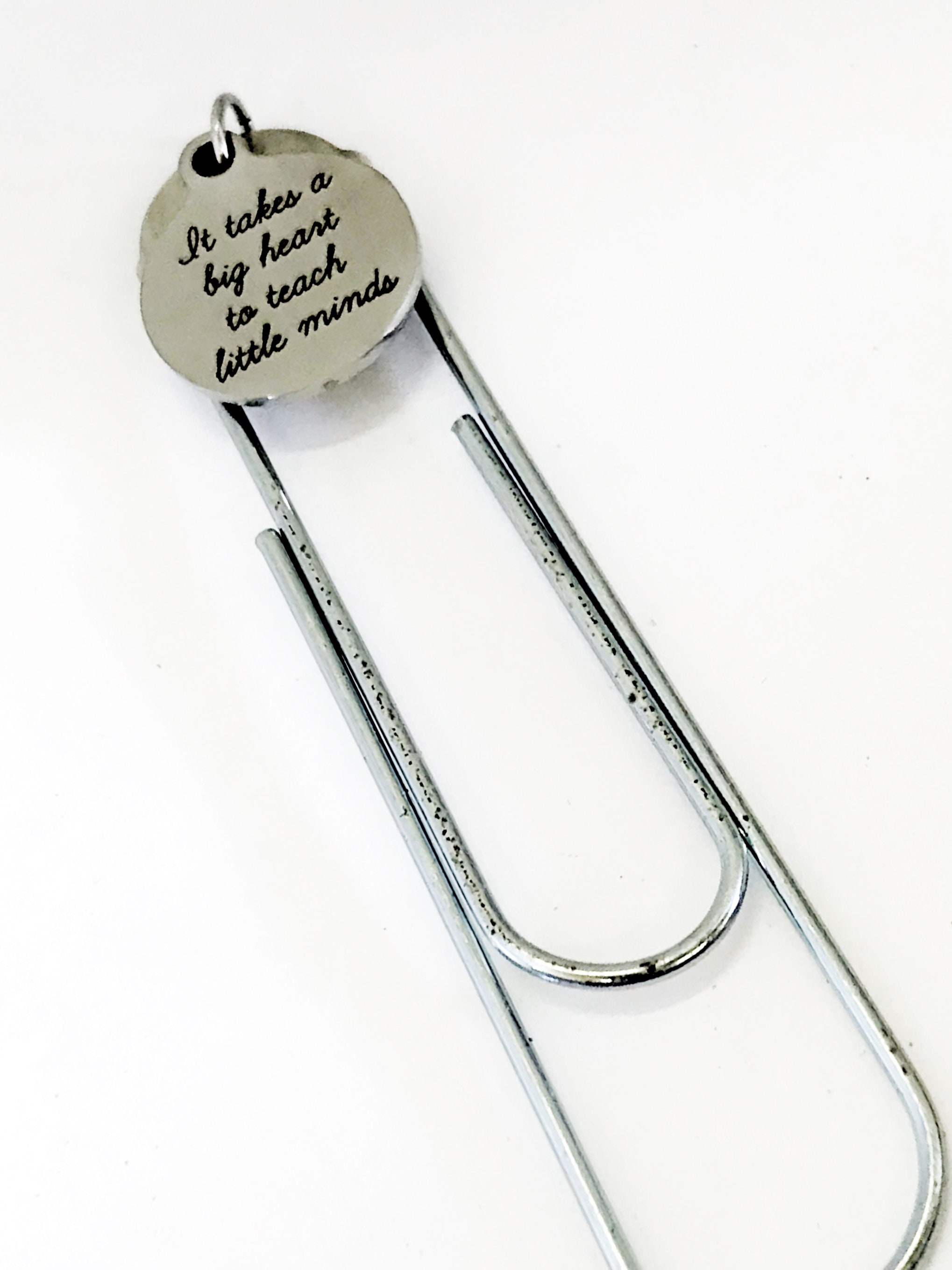 This is a great planner paper clip bookmark that would make a great gift for the teachers in your life. This paper clip bookmark has a stainless steel laser engraved charm with “It takes a big heart to teach little minds” on it.