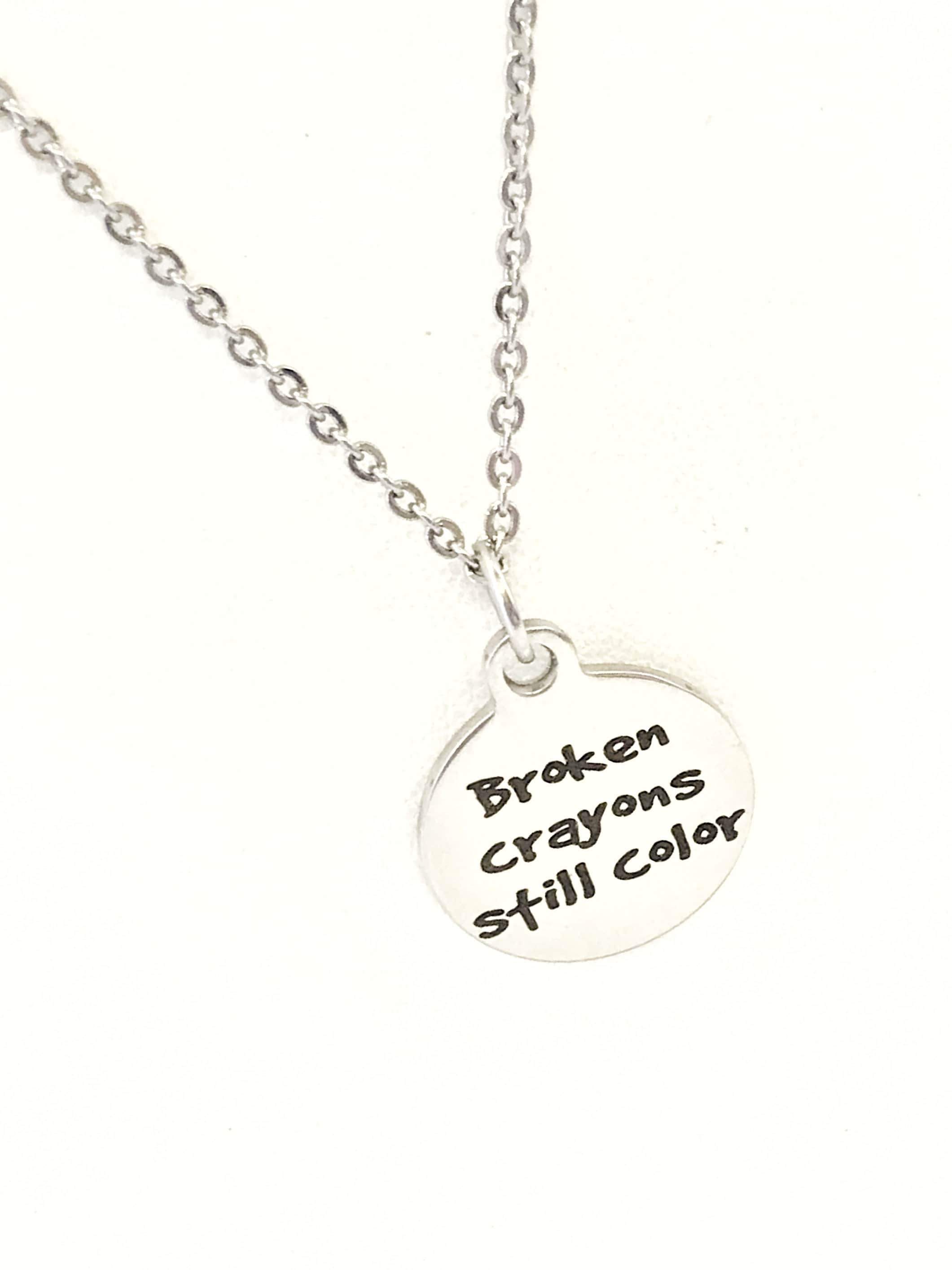 This beautiful necklace would make a great motivation gift to encourage someone going through a difficult time. The pendant is a stainless steel laser engraved pendant that has “Broken crayons still color” on it.