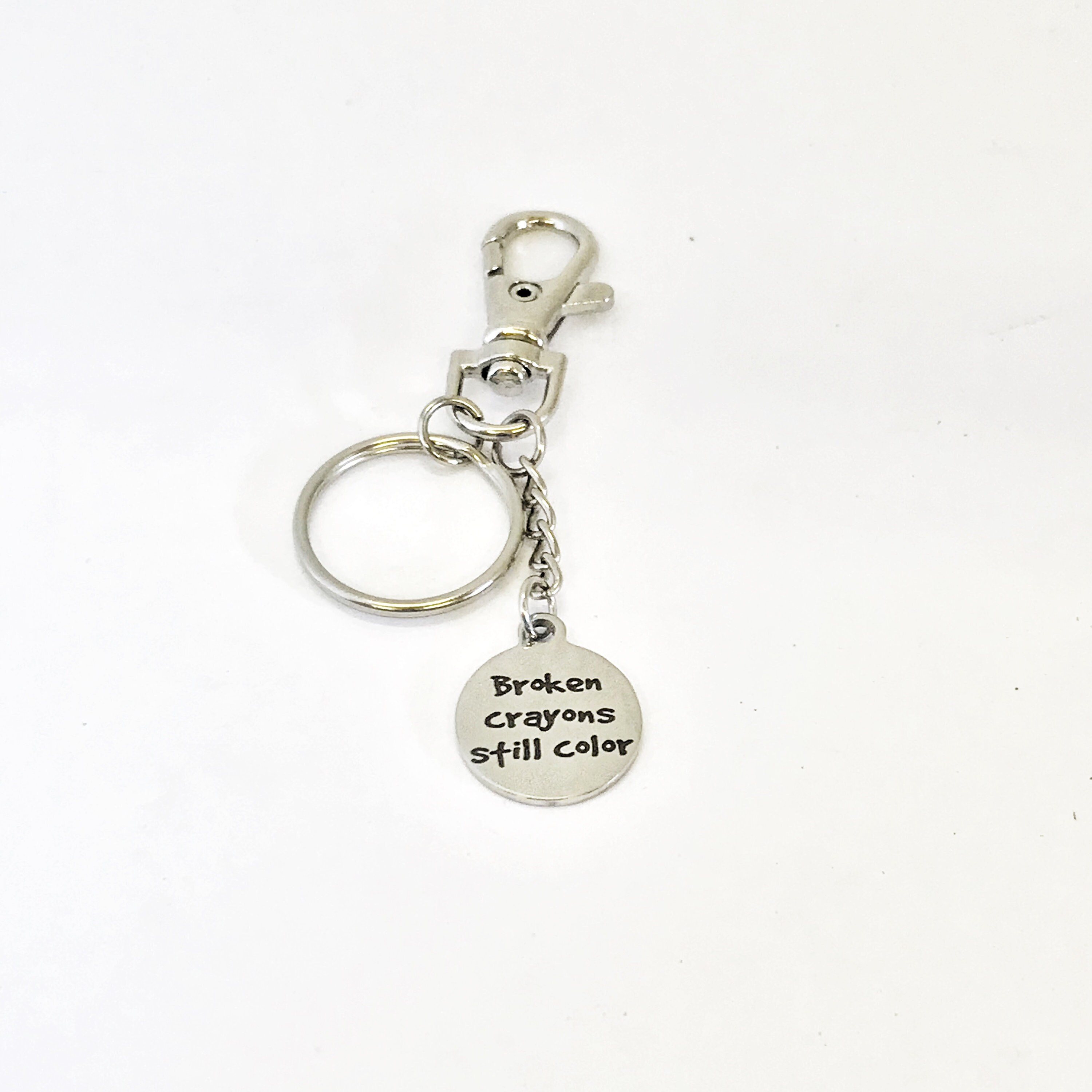 This is a great keychain gift with a motivating quote. It has a stainless steel laser engraved charm with “Broken crayons still color” on it.