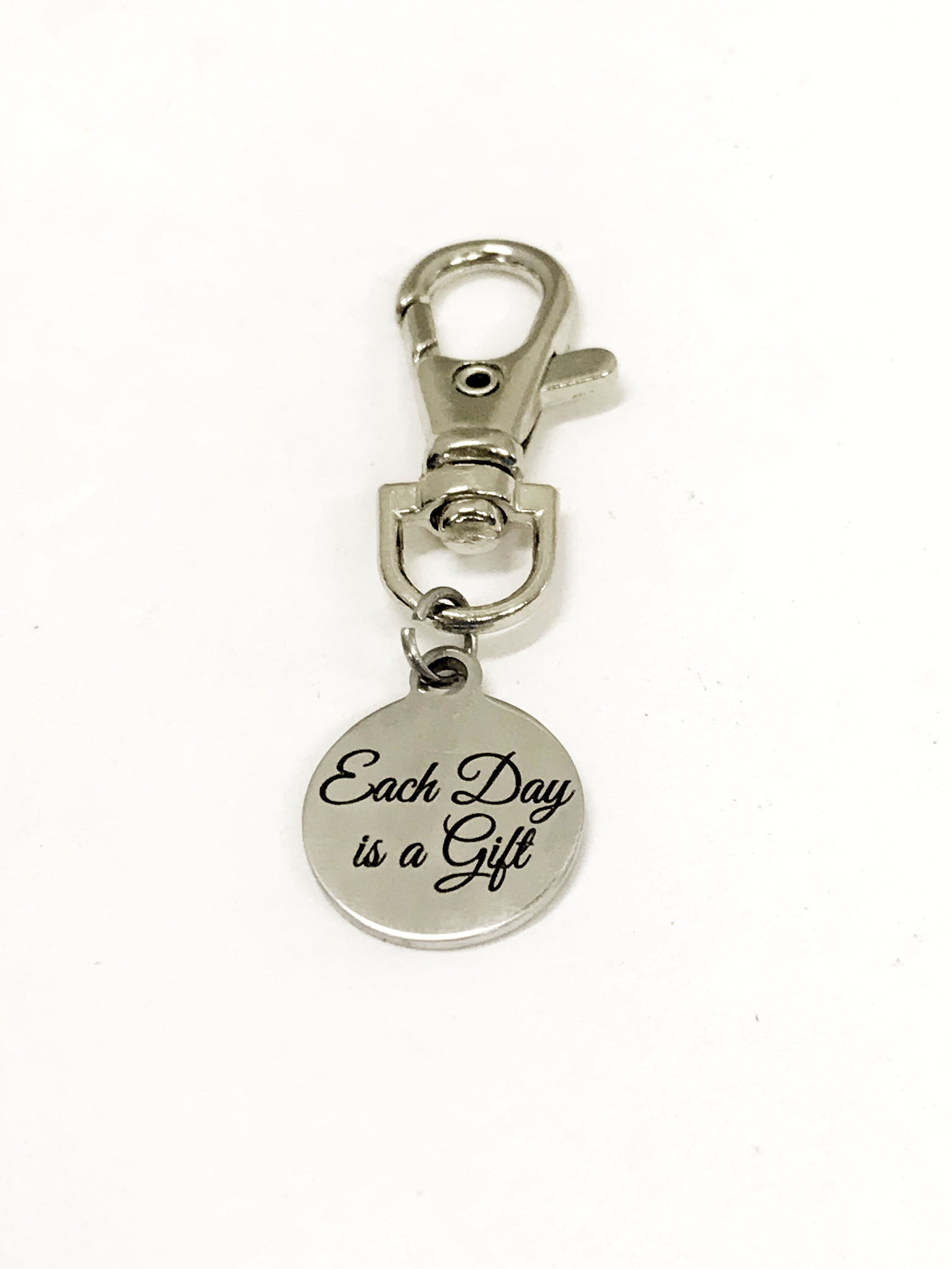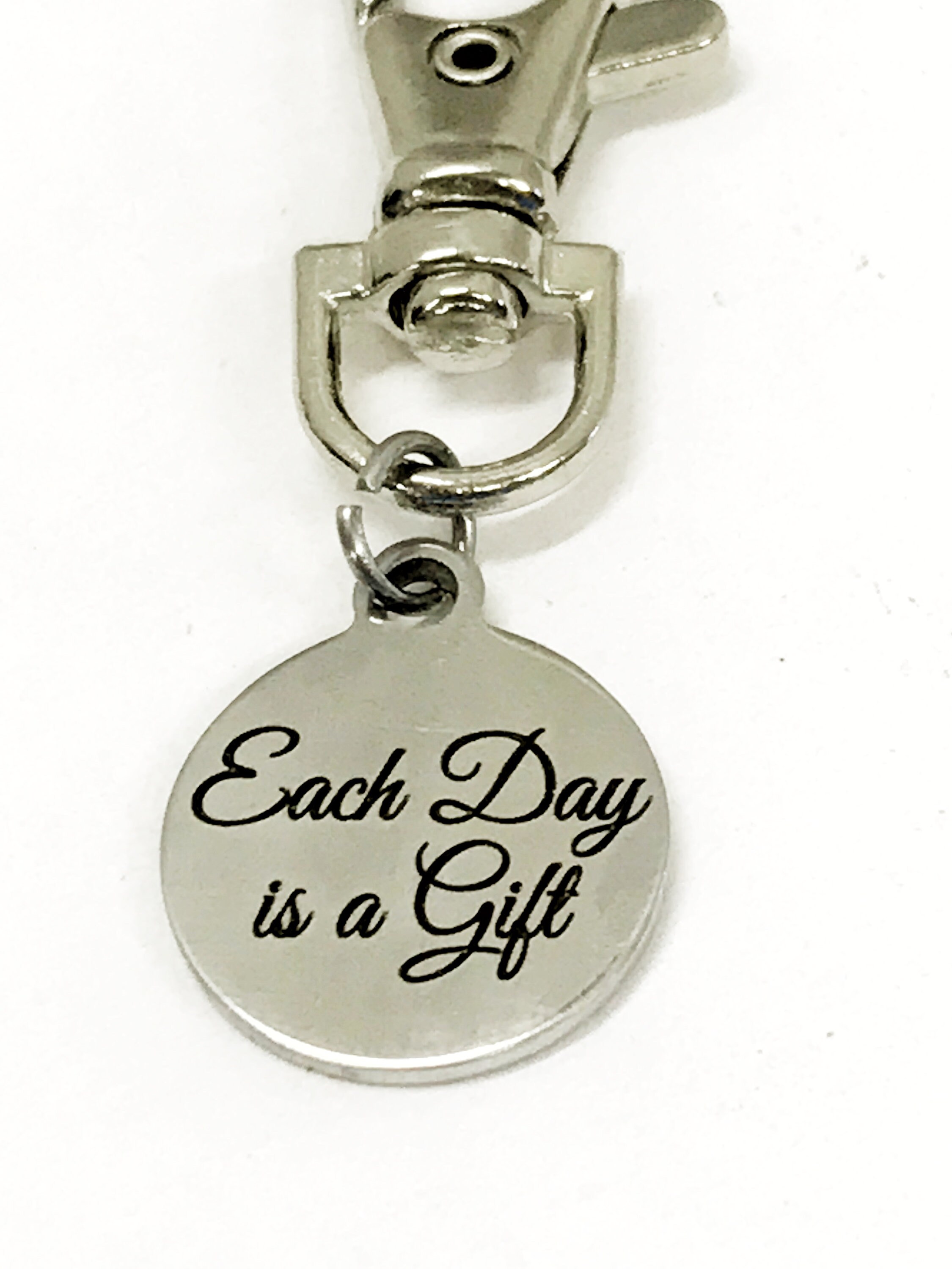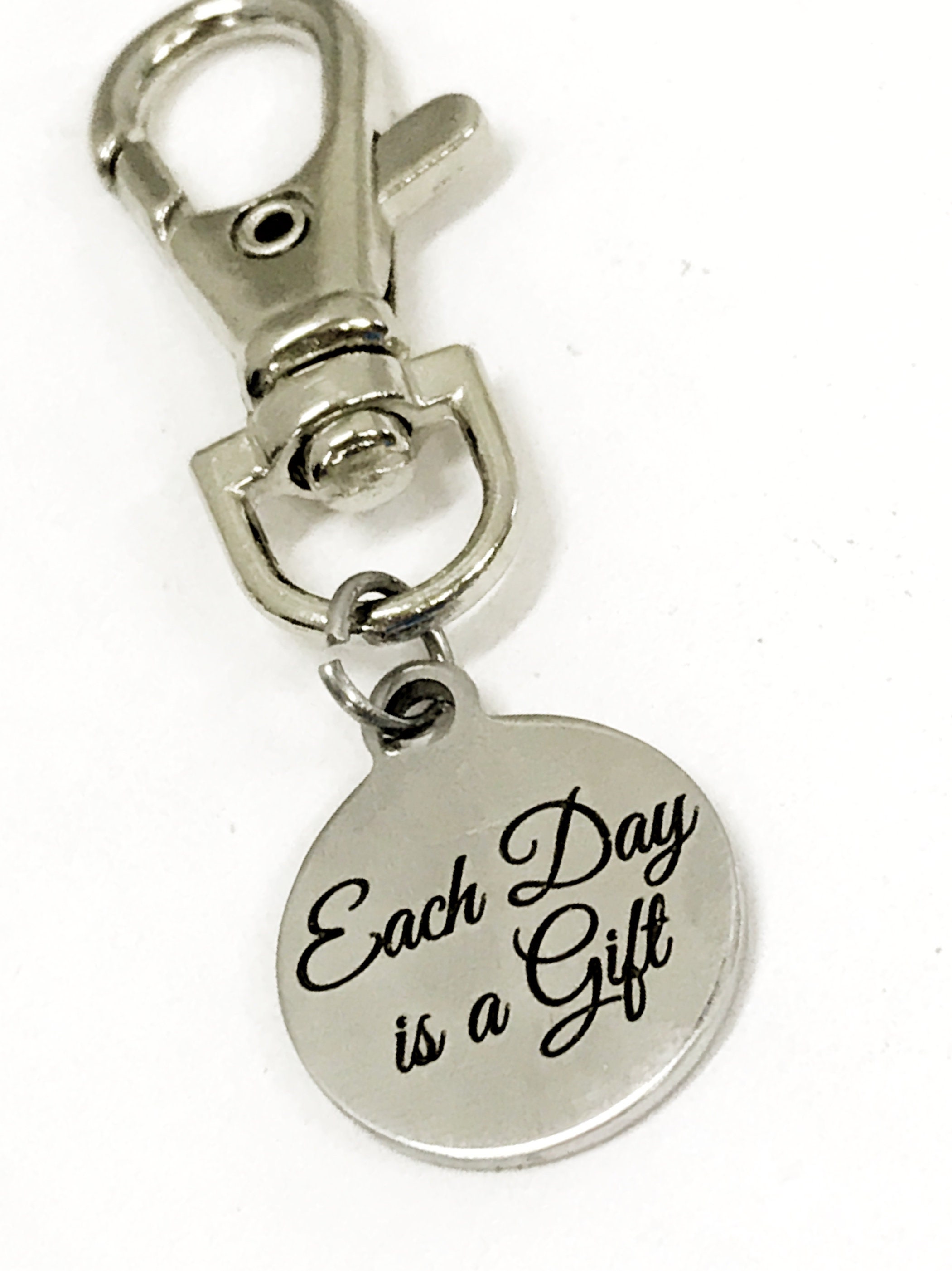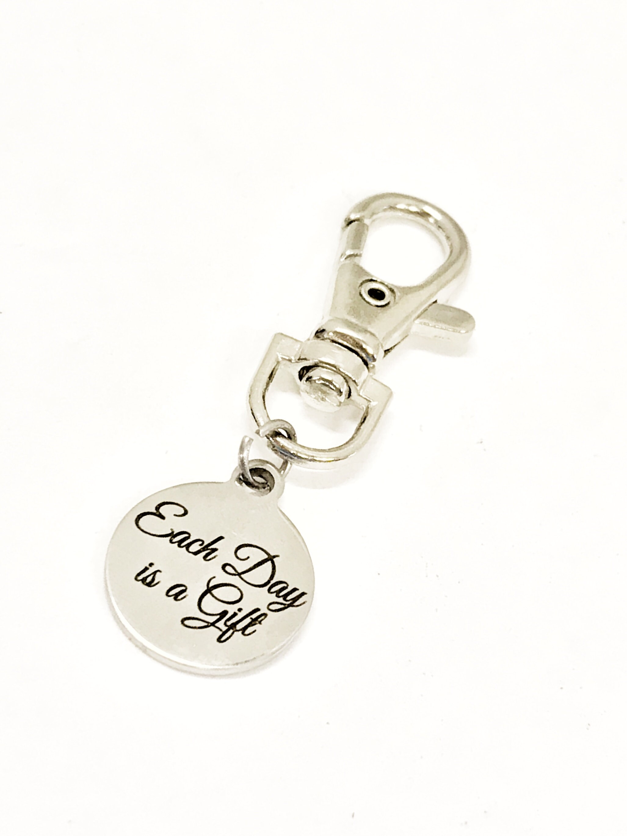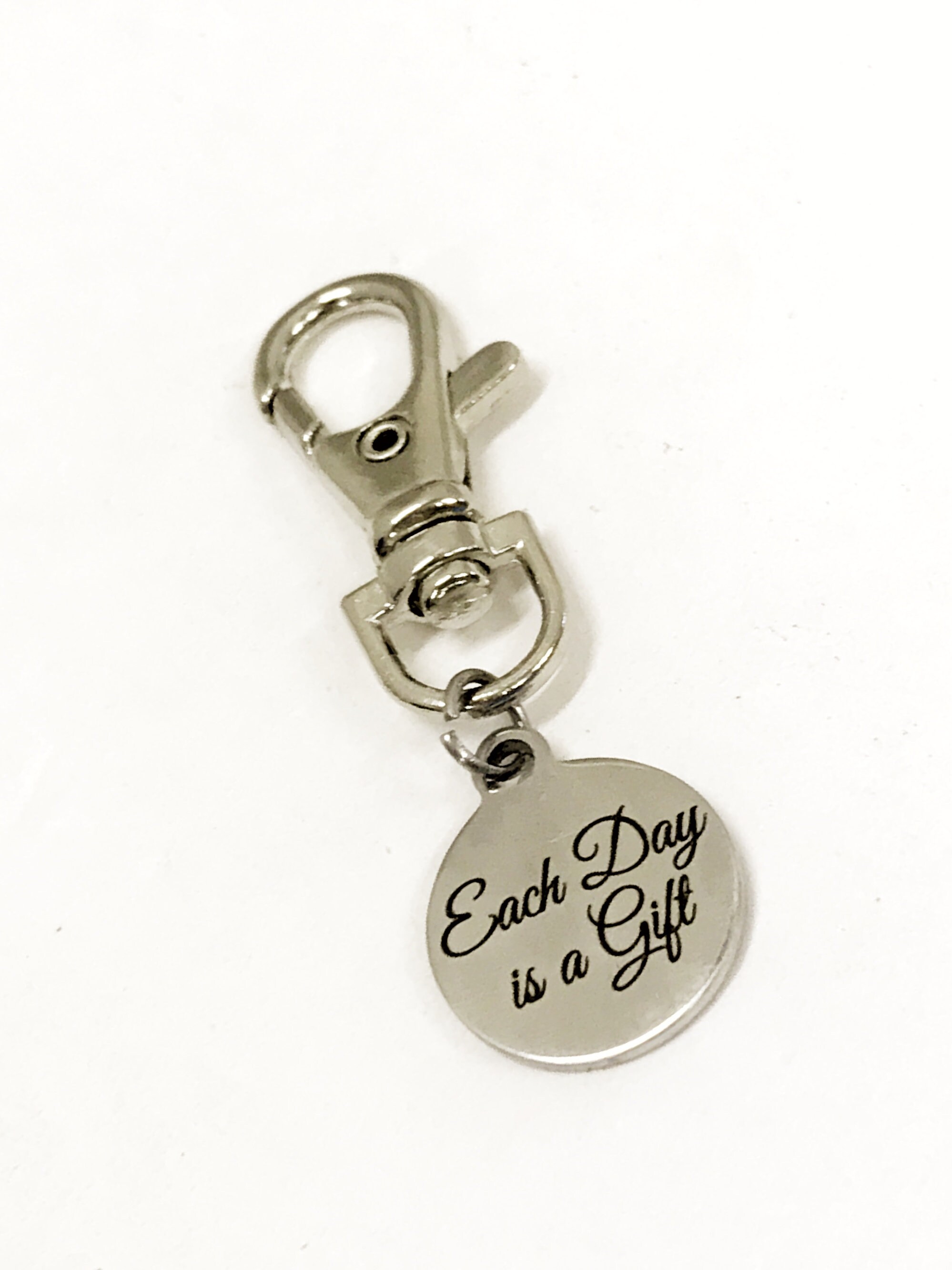 This is a great encouraging gift zipper pull or purse charm with “Each day is a gift” on it. This would be a great gift to remind someome that no matter what happens in life, each day is a gift to start fresh.