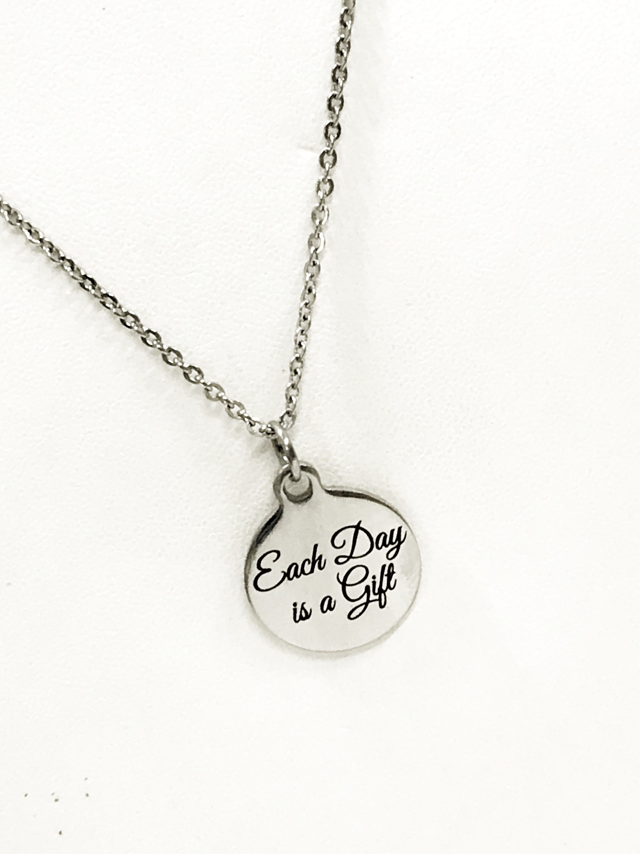 This beautiful encouraging jewelry necklace gift would make a great motivational gift. The pendant is a stainless steel laser engraved pendant that says “Each Day is a Gift”. The pendant comes on a stainless steel link chain. This pendant is available on your choice of 16, 18, 20, 22, 24, 26, 28 or 30 inch chain. The pendant is also available for individual purchase if you have another chain on which you would like to wear it.