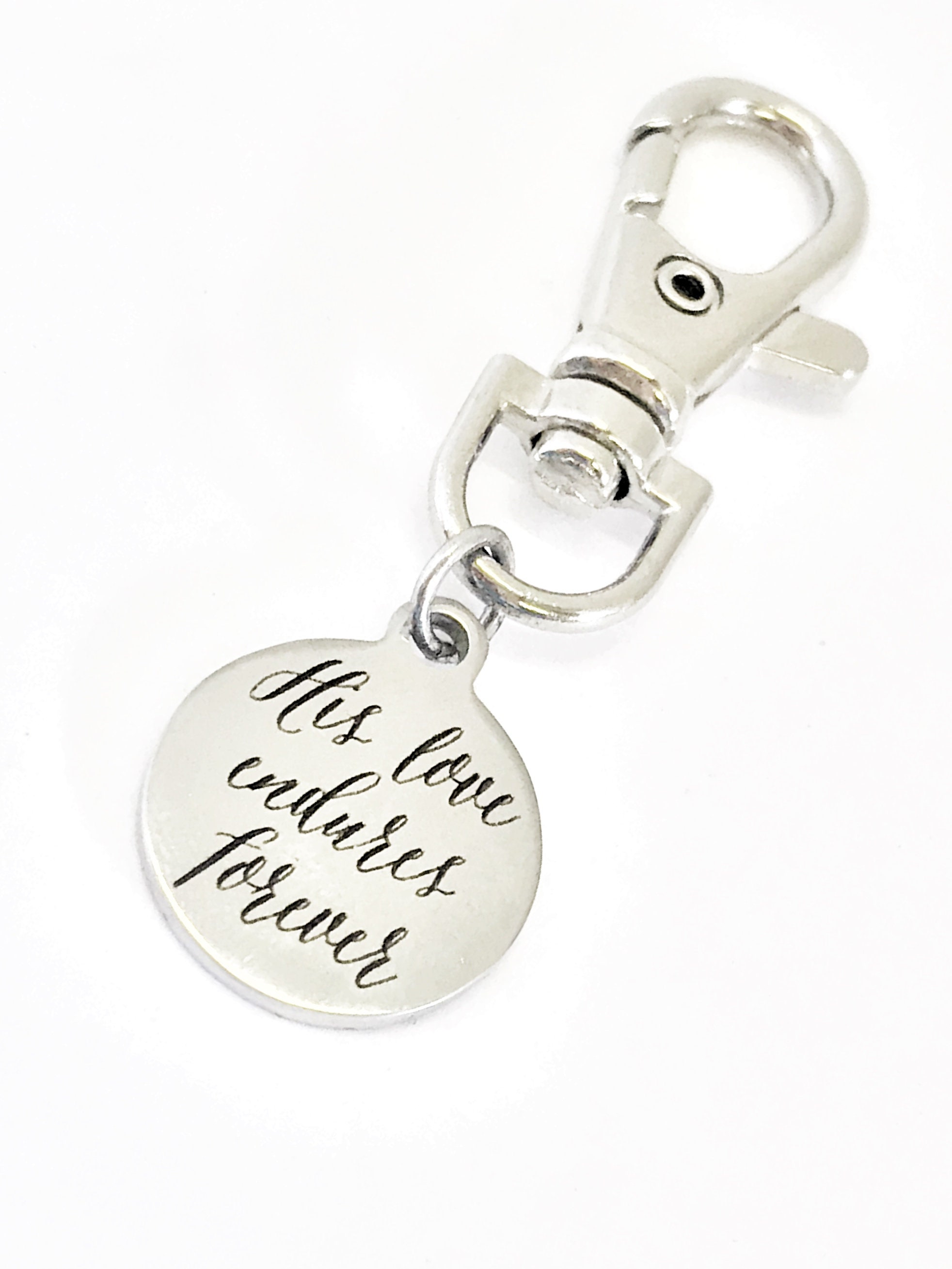 This is a great zipper pull or bag charm gift that would be perfect for someone going through a difficult time where everyone seems to be against them. It has “His love endures forever” from Psalms 136 on it.