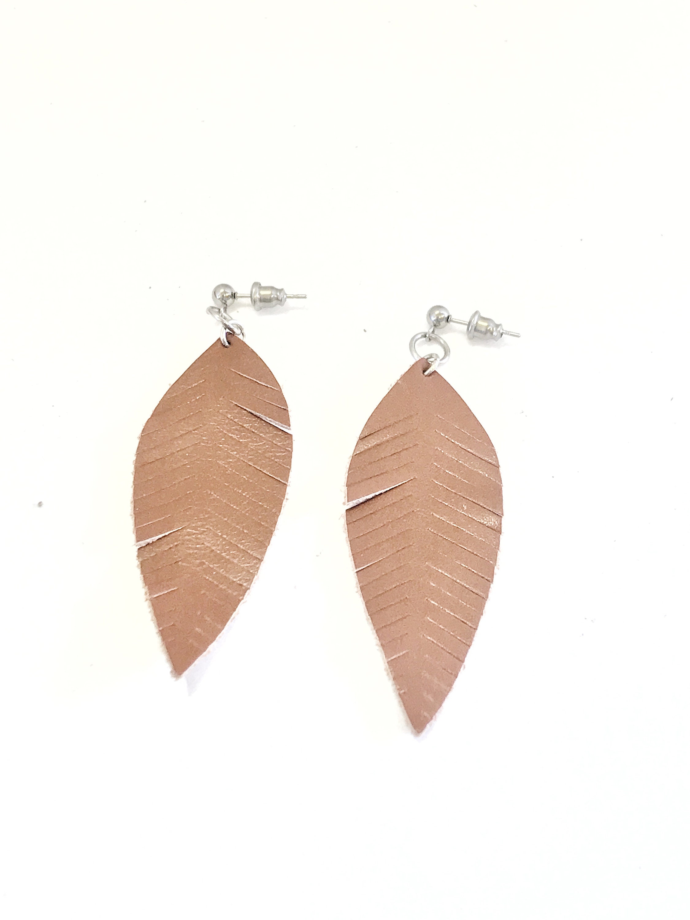 This is such a great set of brown leaf leather earrings. They are approx. 2 1/2 iInches long and are on stainless steel posts.