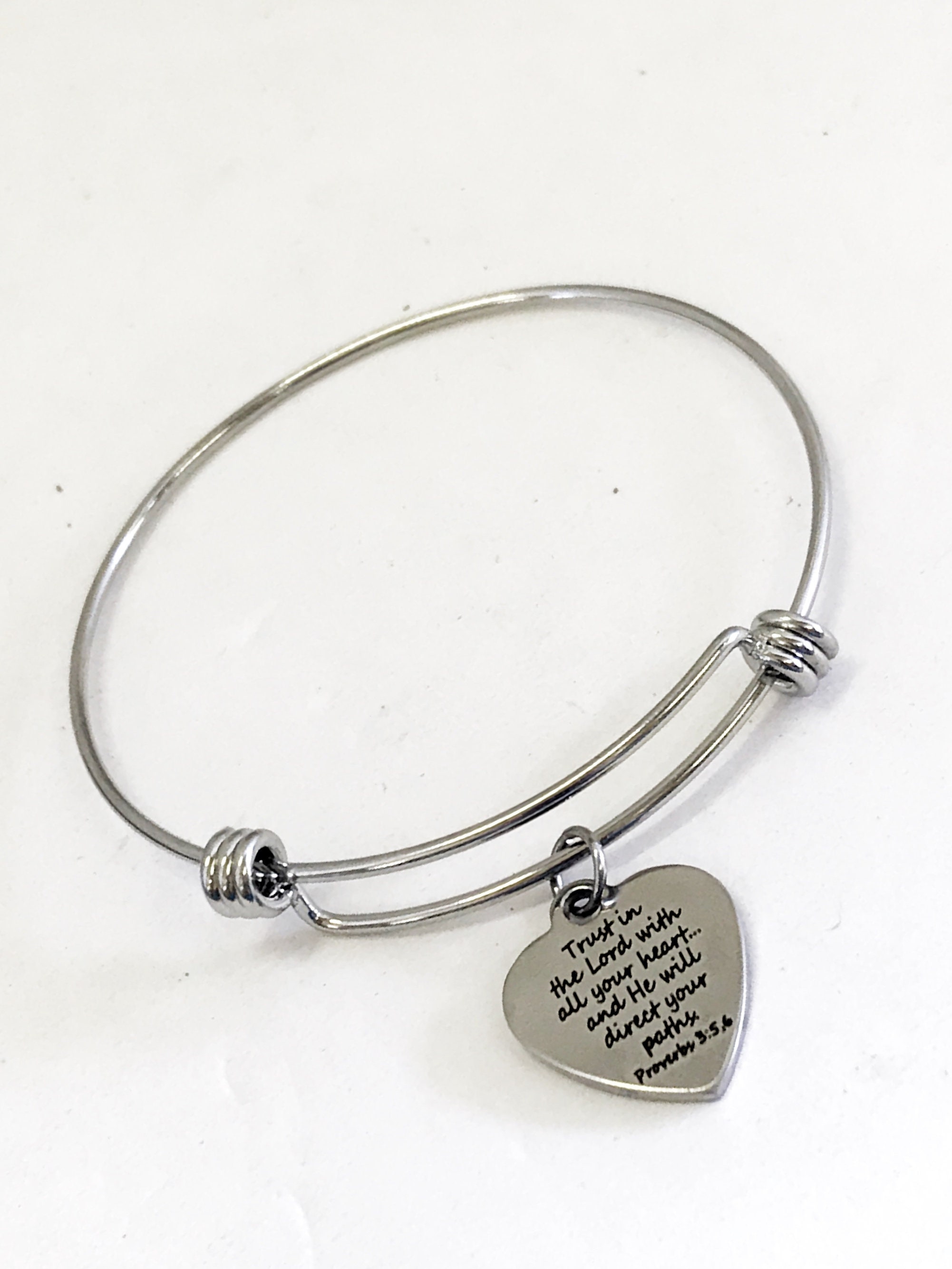 This Christian bracelet would be a great gift for your daughter or any woman. It has a stainless steel laser engraved charm that says "Trust in the Lord with all your heart... and He will direct your paths" from Proverbs 3 verses 5 and 6 on it.