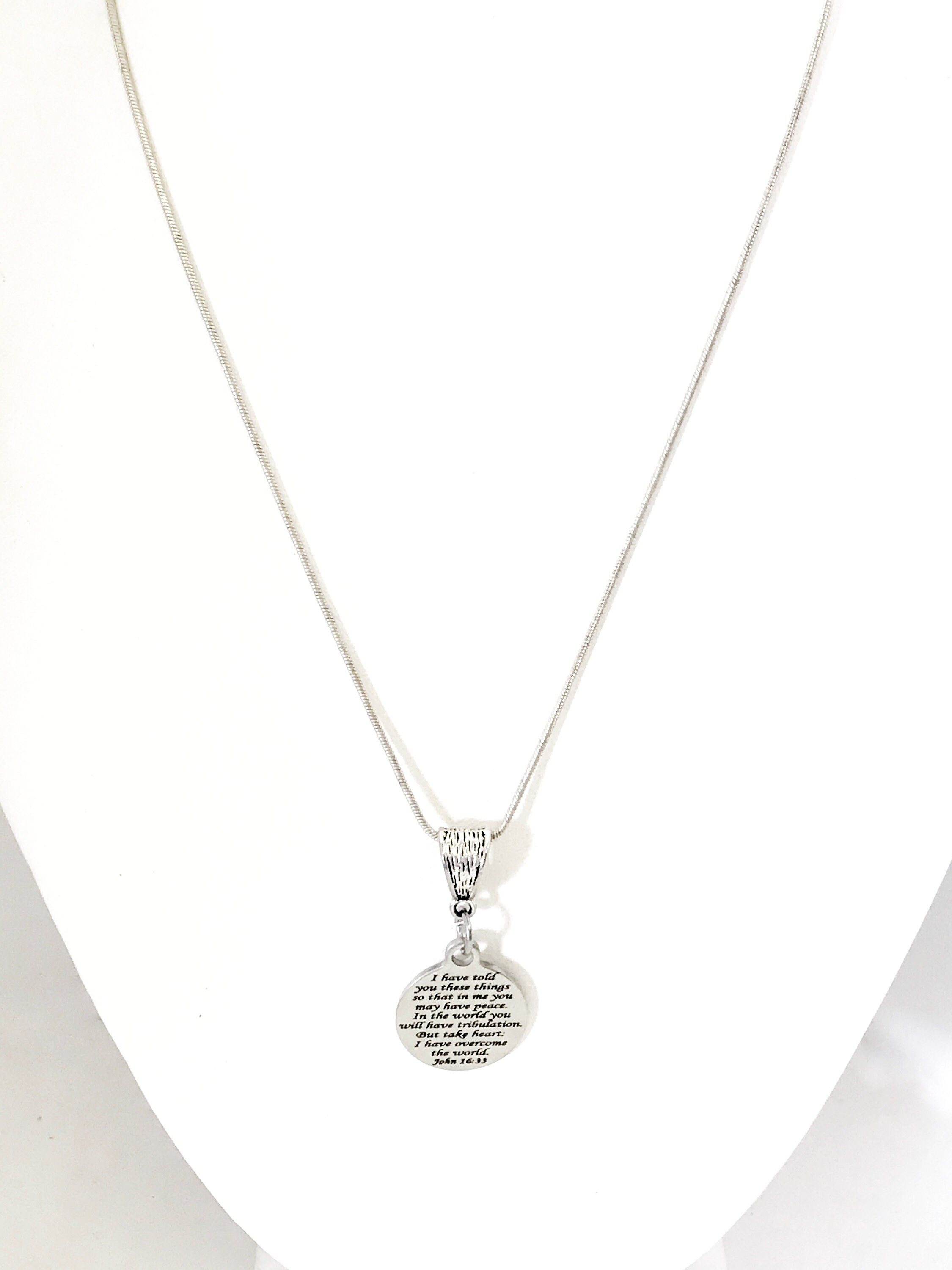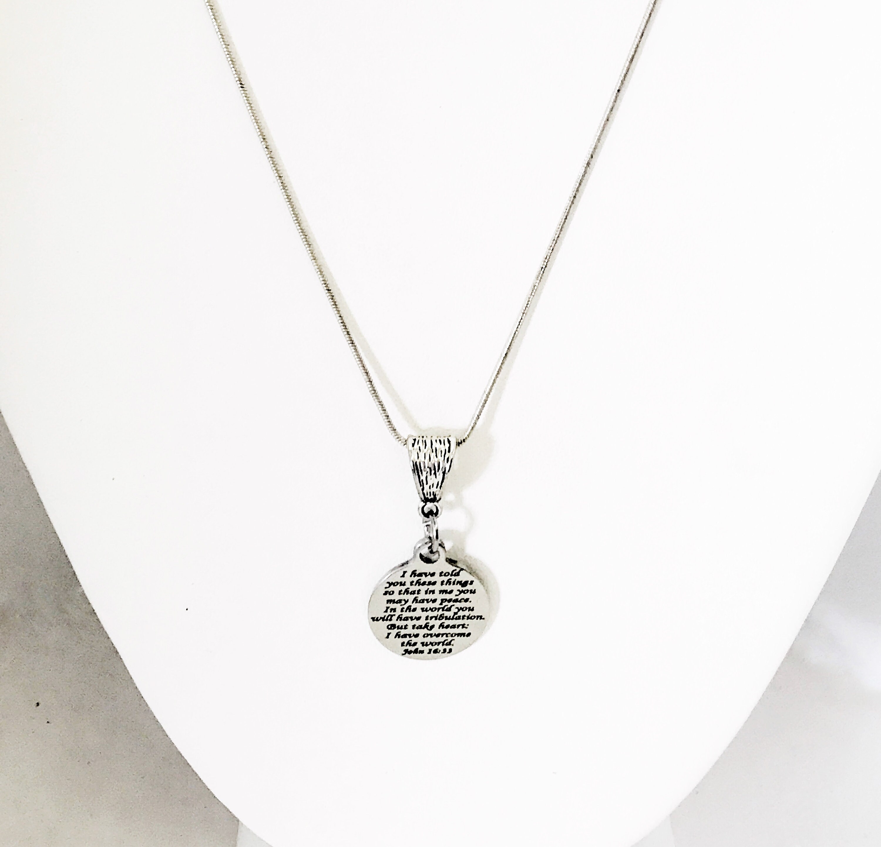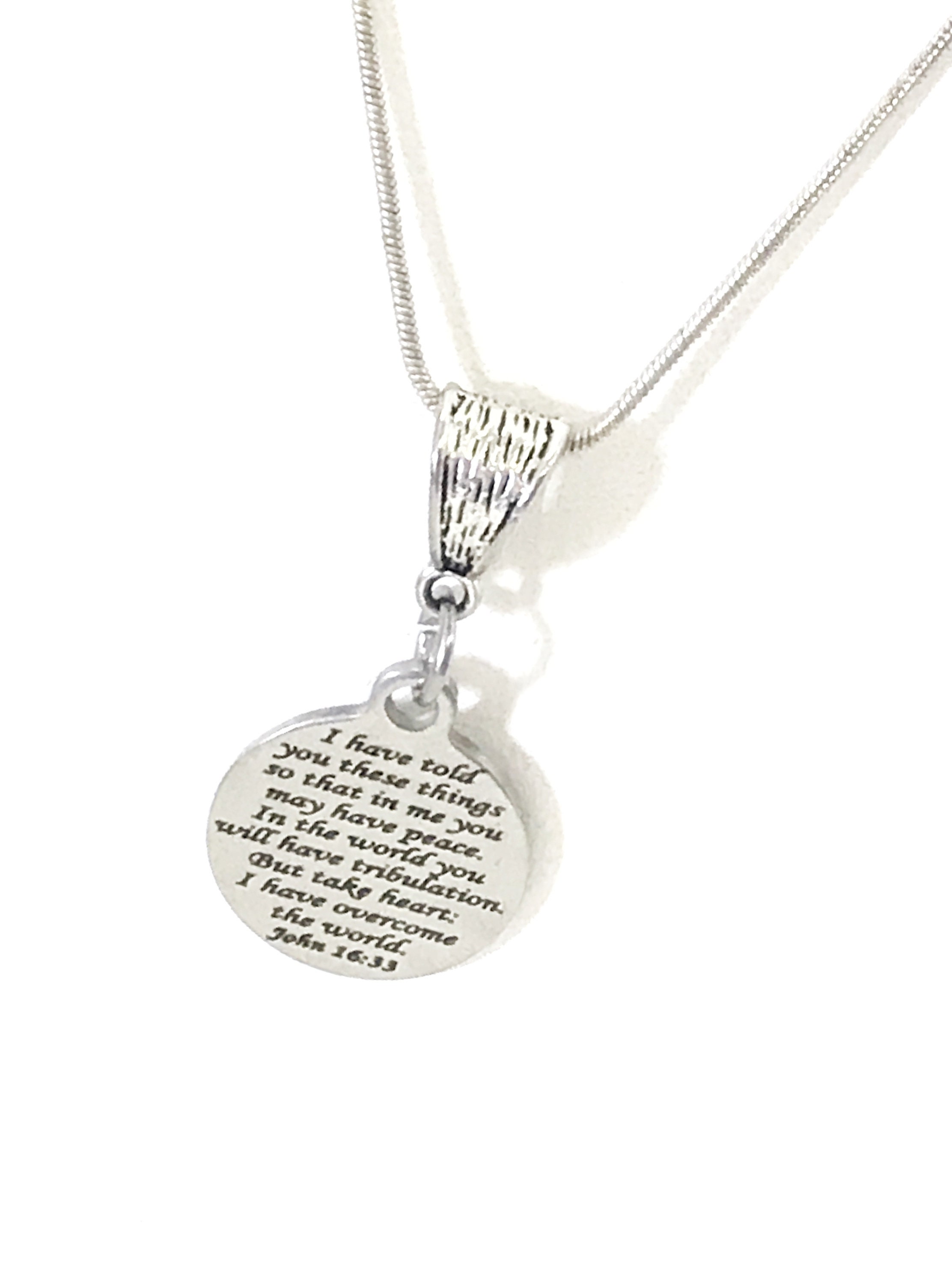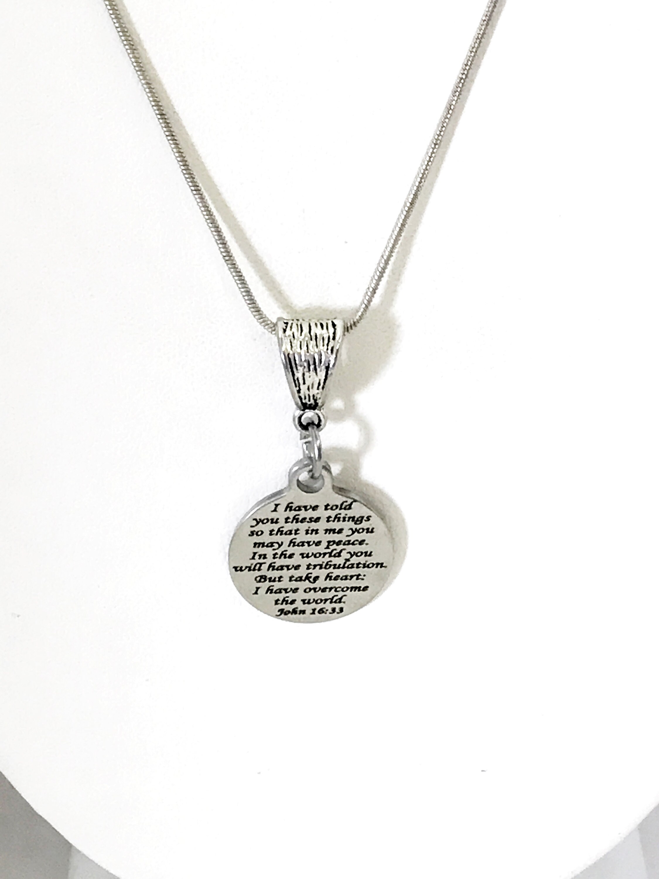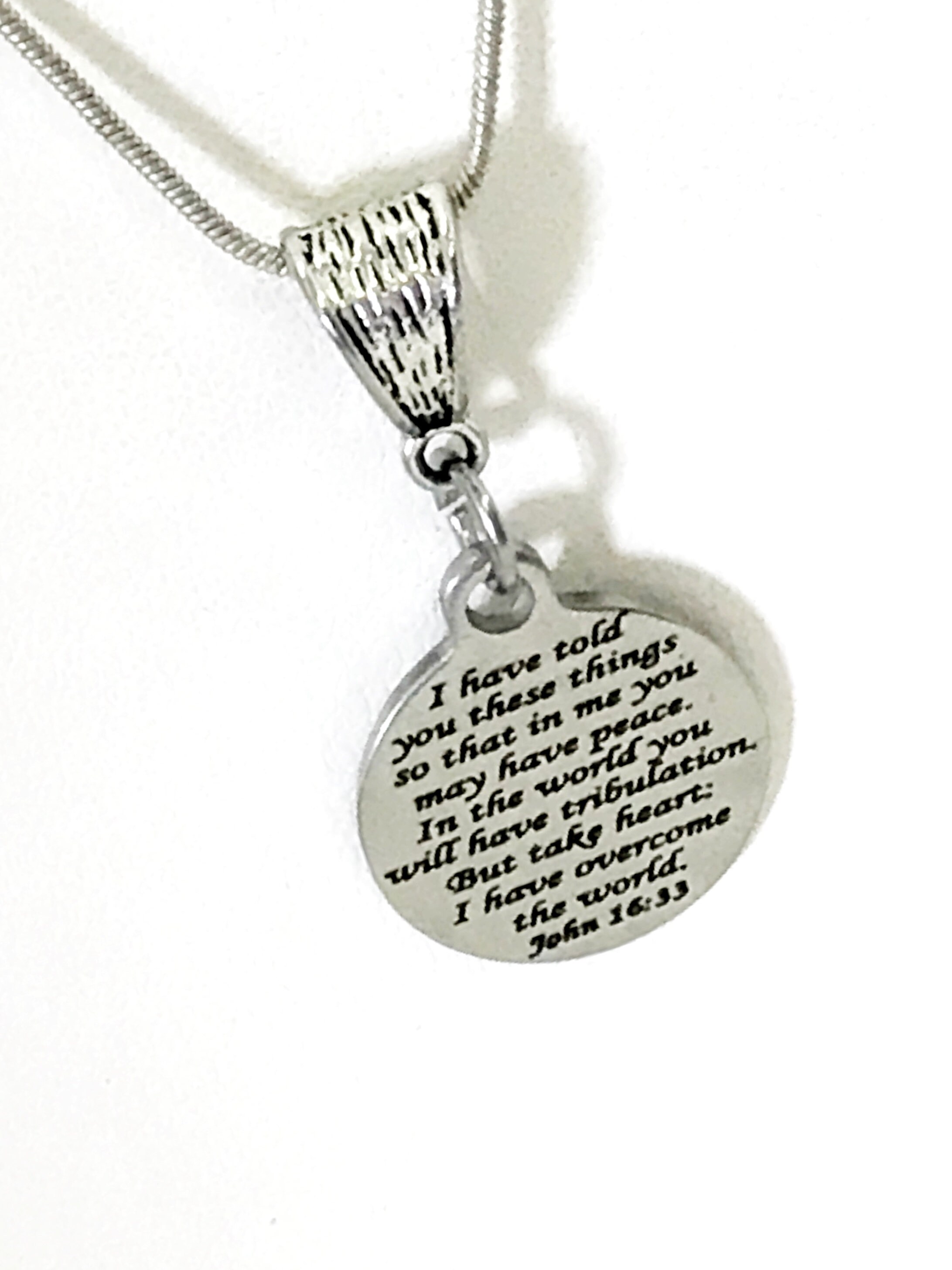 This is a beautiful encouraging necklace jewelry gift. It has a stainless steel laser engraved charm with the Bible Verse of John 16:33 on it.