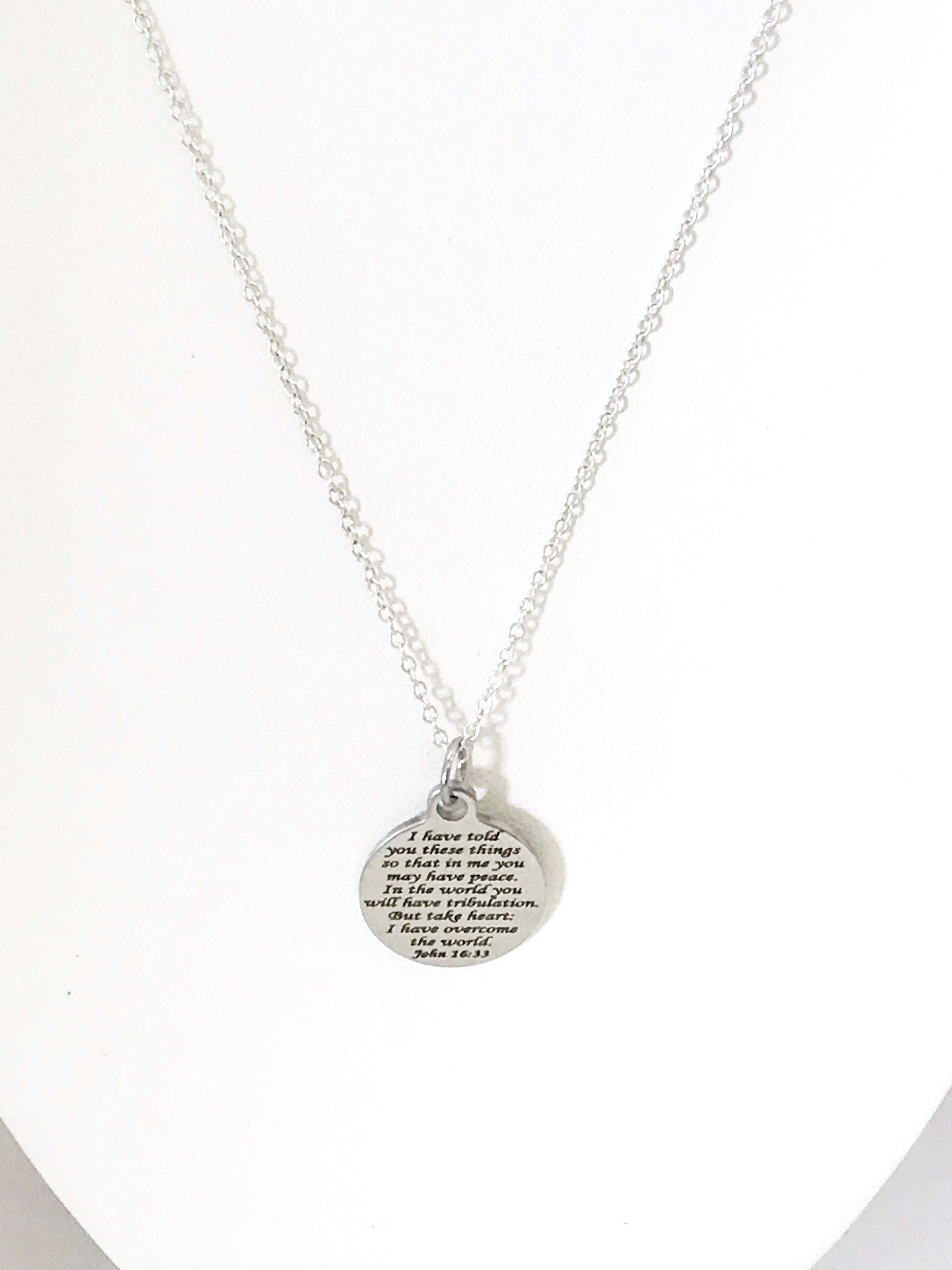 This beautiful scripture jewelry necklace would make a great gift of encouragement. The pendant is a stainless steel laser engraved pendant with the following Bible verse from John 16:33 on it: