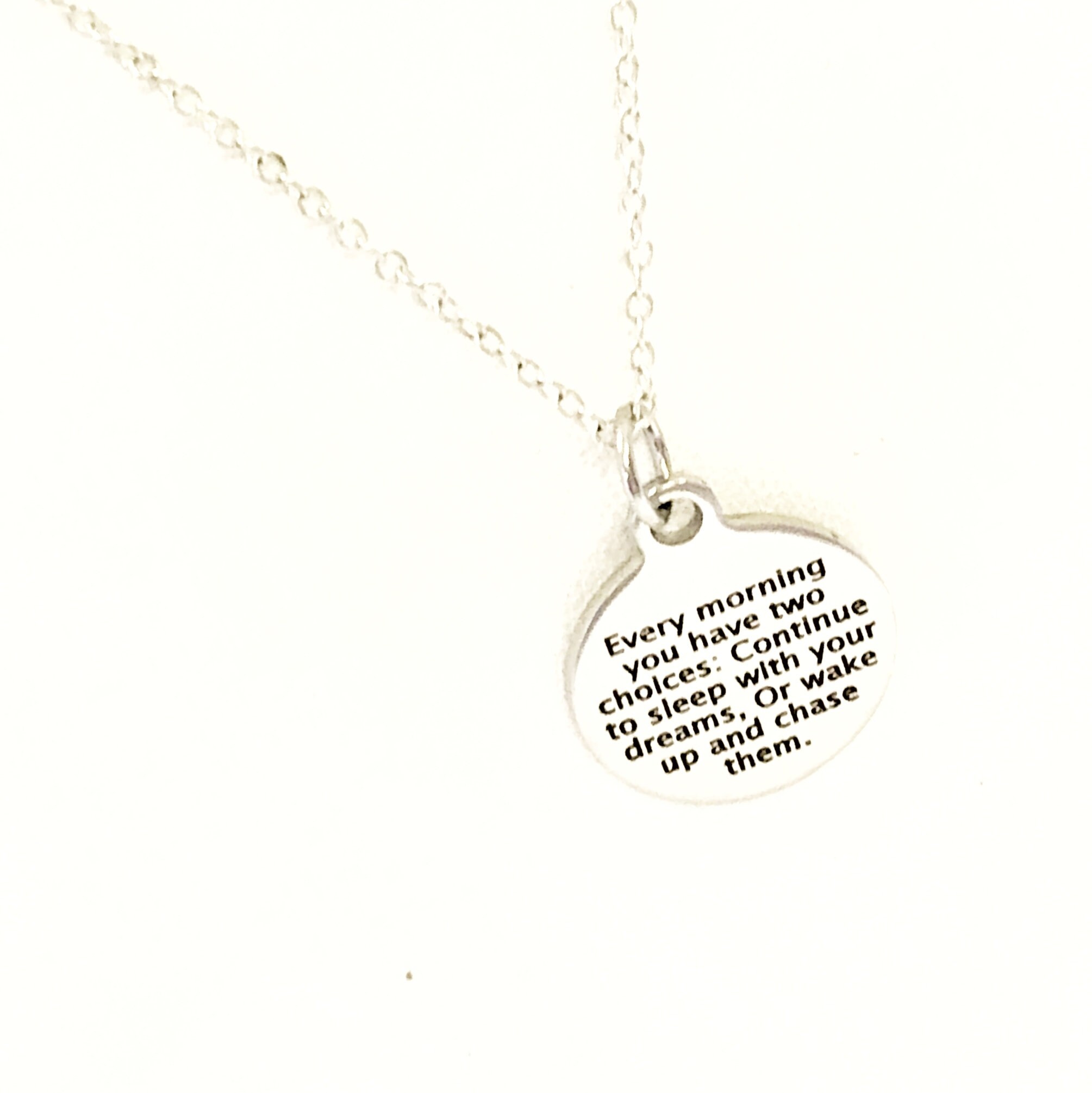 This beautiful necklace would make a great gift to encourage someone to chase their dreams of success. The pendant is a stainless steel laser engraved pendant with “Every morning you have two choices: Continue to sleep with your dreams, Or wake up and chase them” on it.