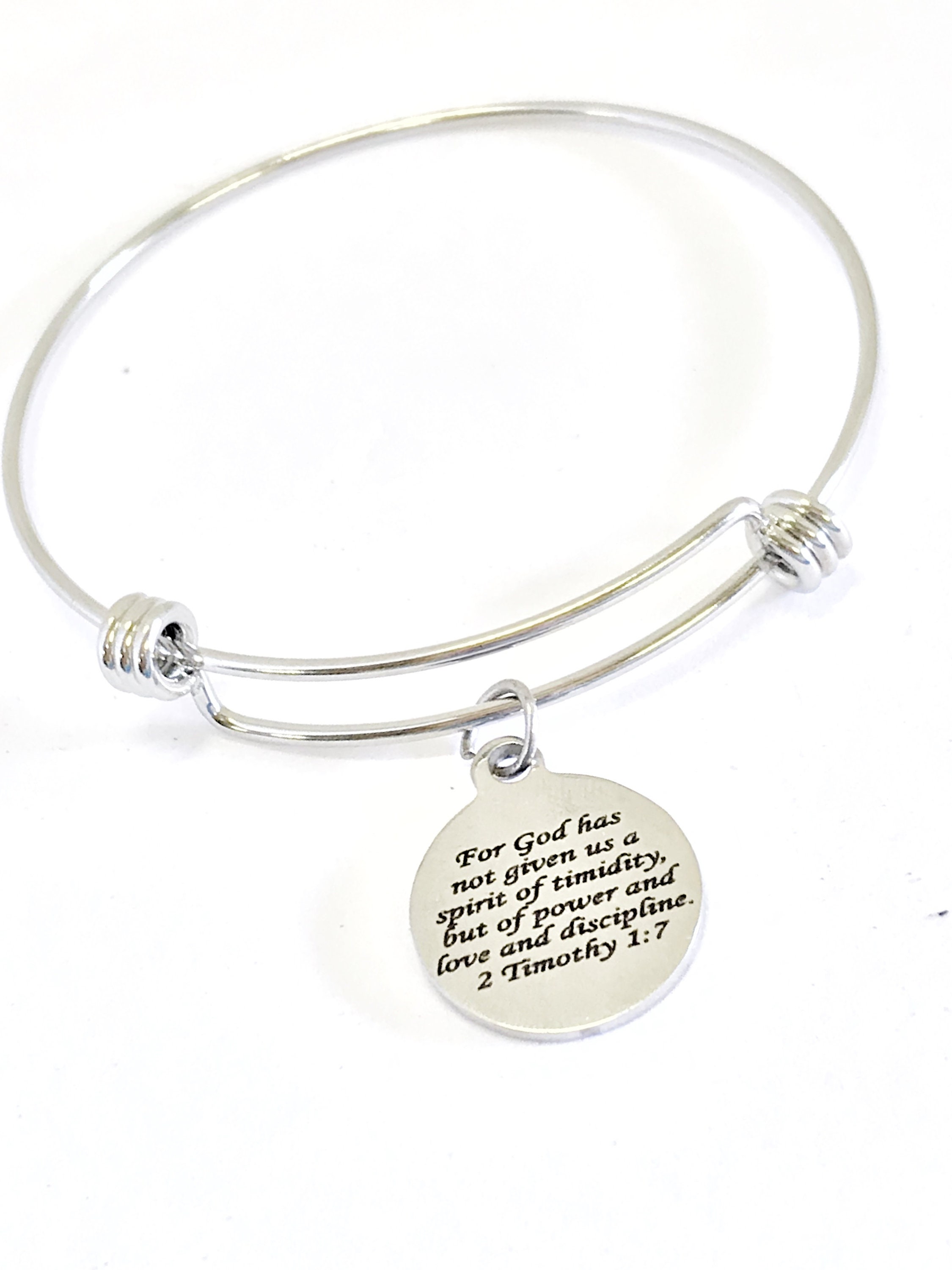 This expanding bangle charm bracelet would make a wonderful Christian bible verse gift. This is a beautiful bangle bracelet with a laser engraved stainless steel charm that has “For God has not given us a spirit of timidity, but of power and love and discipline” from 2 Timothy 1:7 on it.