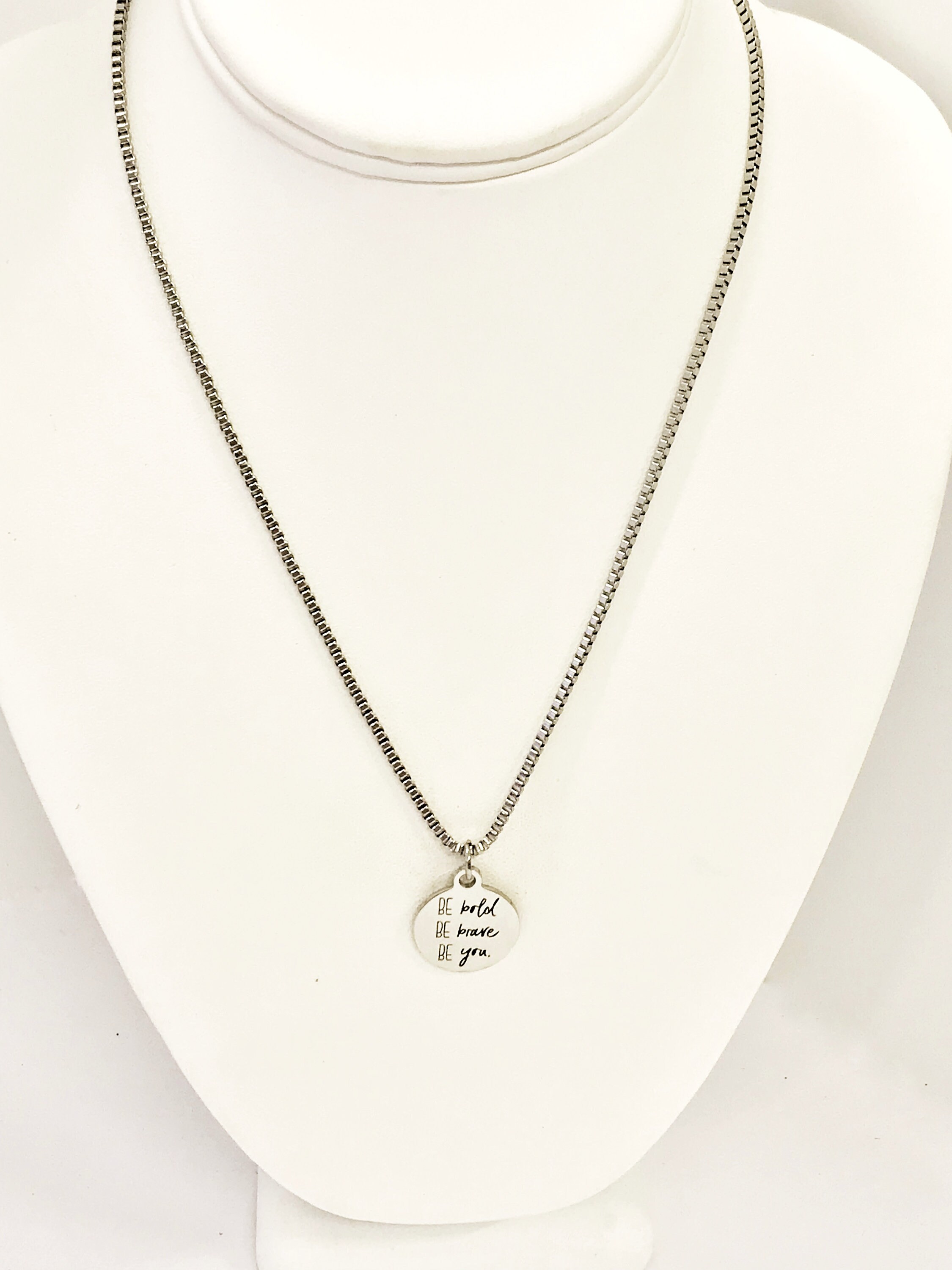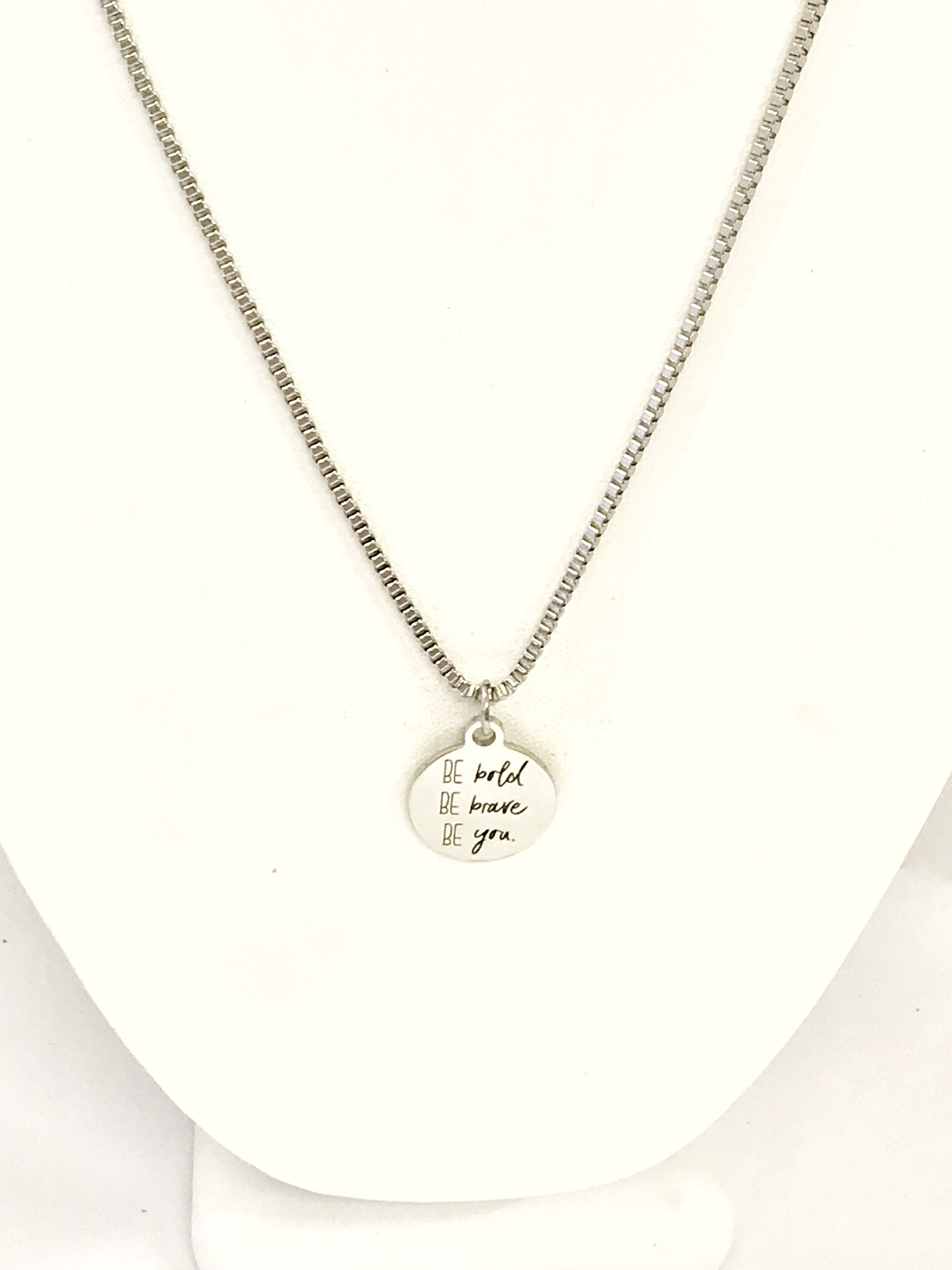 This is great necklace gift to remind the wearer to be themselves. This necklace comes with a stainless steel laser engraved charm pendant on a 22 inch stainless steel box chain. The pendant has “Be bold Be brave Be you” on it.