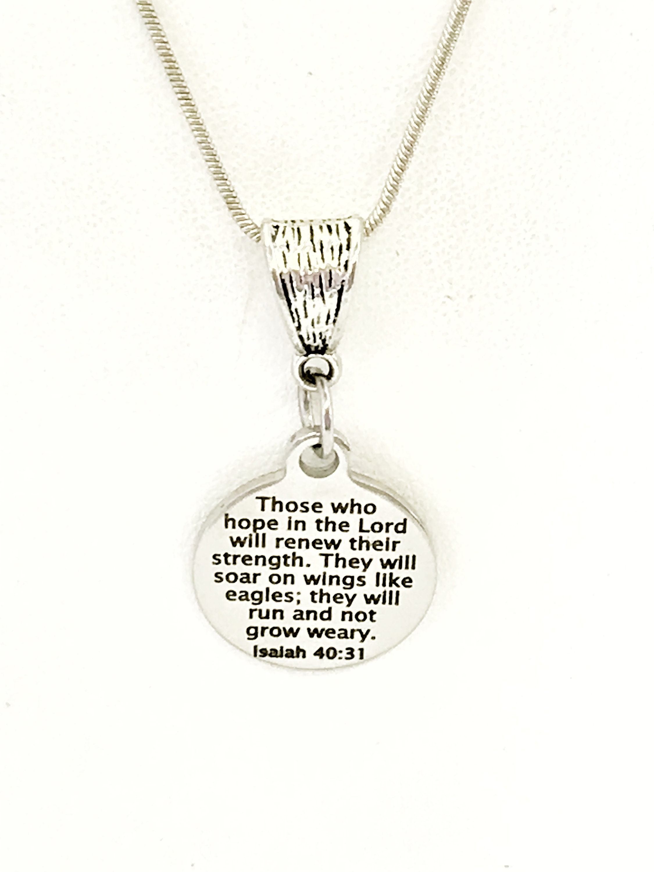 This beautiful encouraging jewelry piece would make an excellent gift to remind someone to always place their hope in the Lord. It has a stainless steel laser engraved charm with “Those who hope in the Lord will renew their strength. They will soar on wings like eagles; they will run and not grow weary” from Isaiah 40:31 on it.