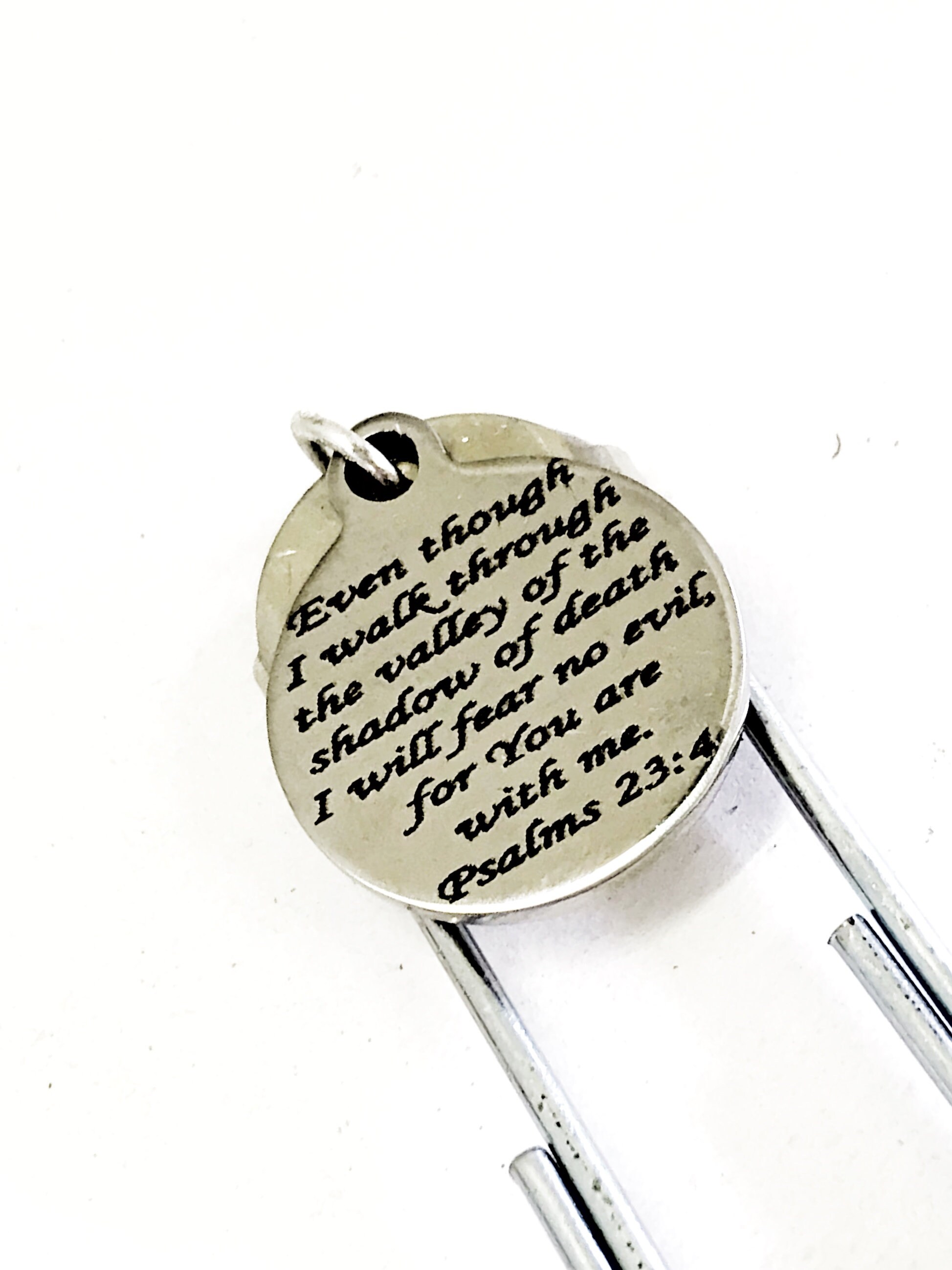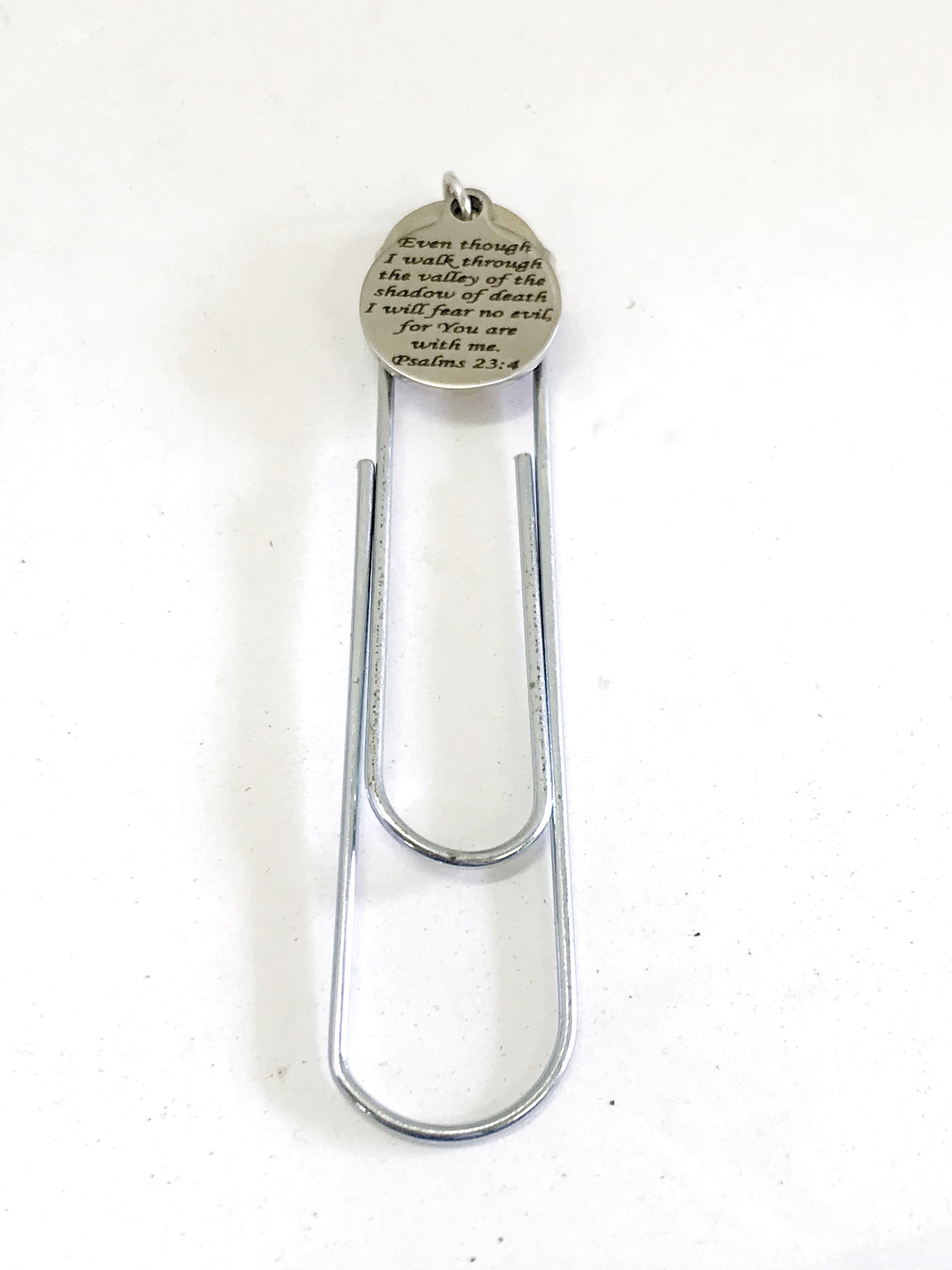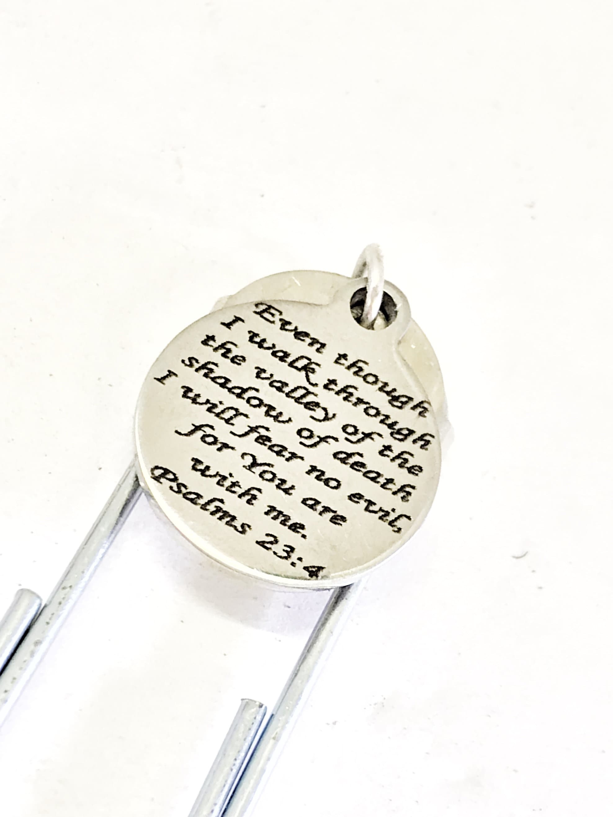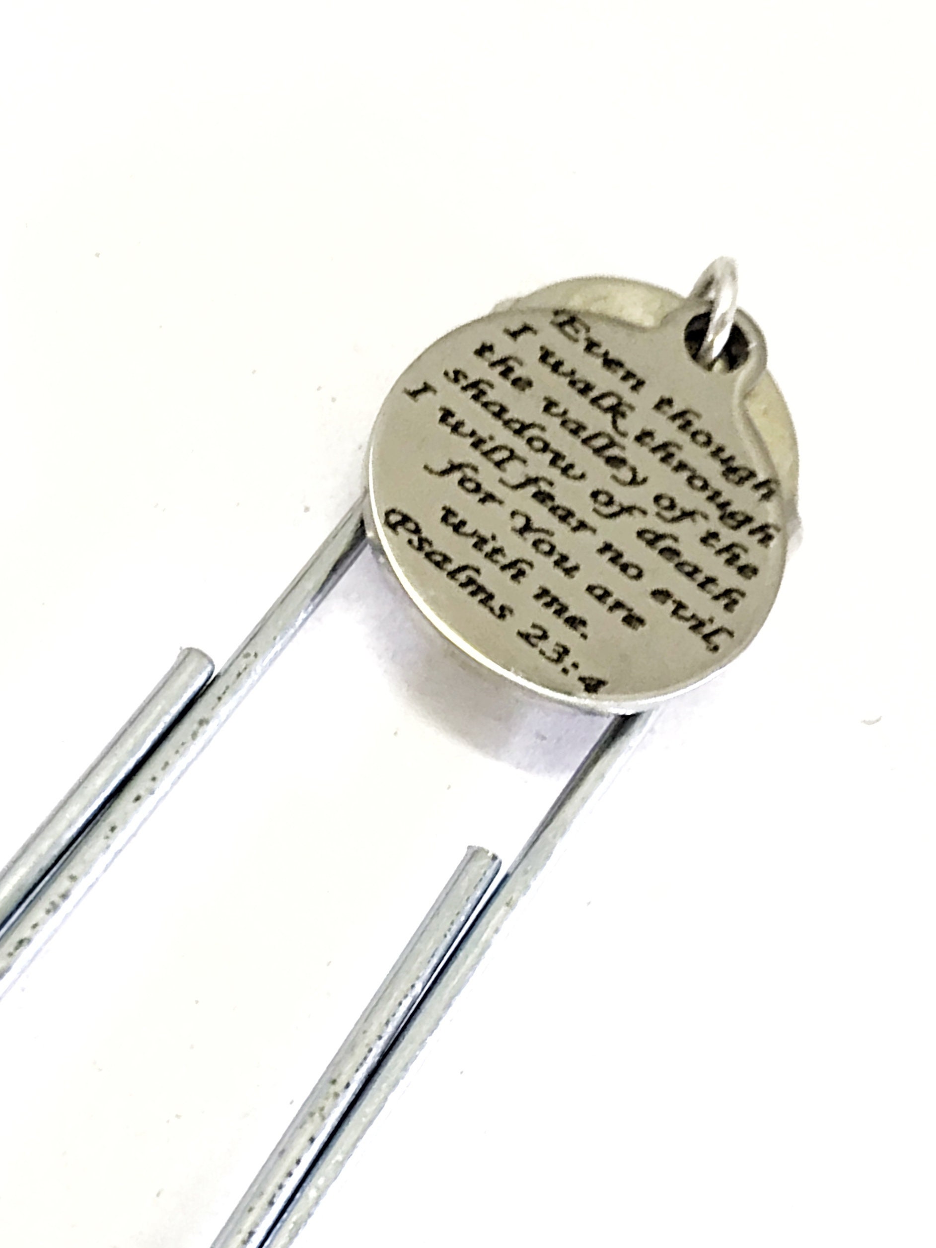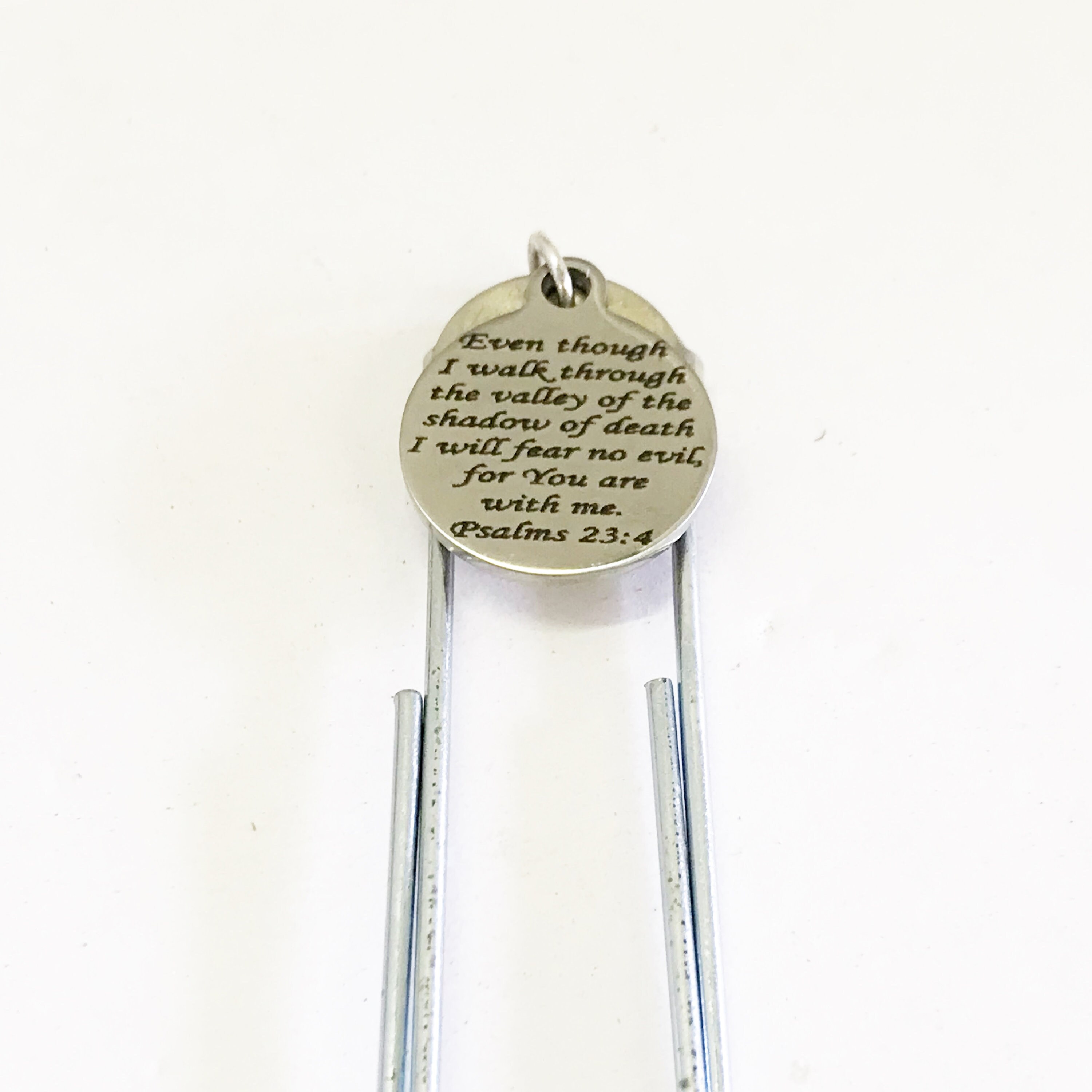 This is a great Christian planner paper clip bookmark to remind us that we should fear no evil for the Lord is our shepherd and is with us no matter where we go. This paper clip bookmark has a stainless steel laser engraved charm with “Even though I walk through the shadow of the valley of death I will fear no evil for You are with me” from Psalm 23:4 on it.