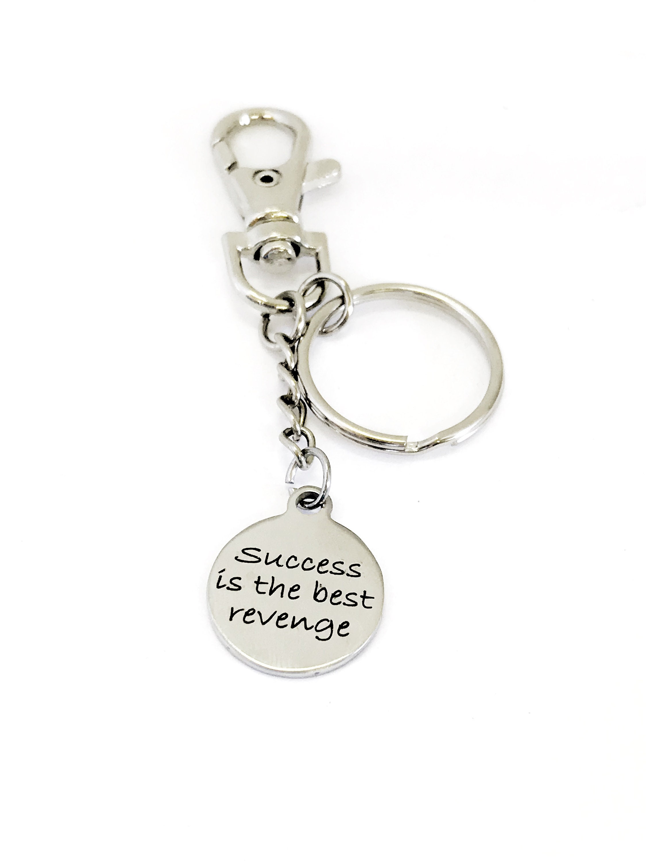 This is a great motivating success keychain gift. It has a stainless steel laser engraved charm with “Success is the best revenge” on it.