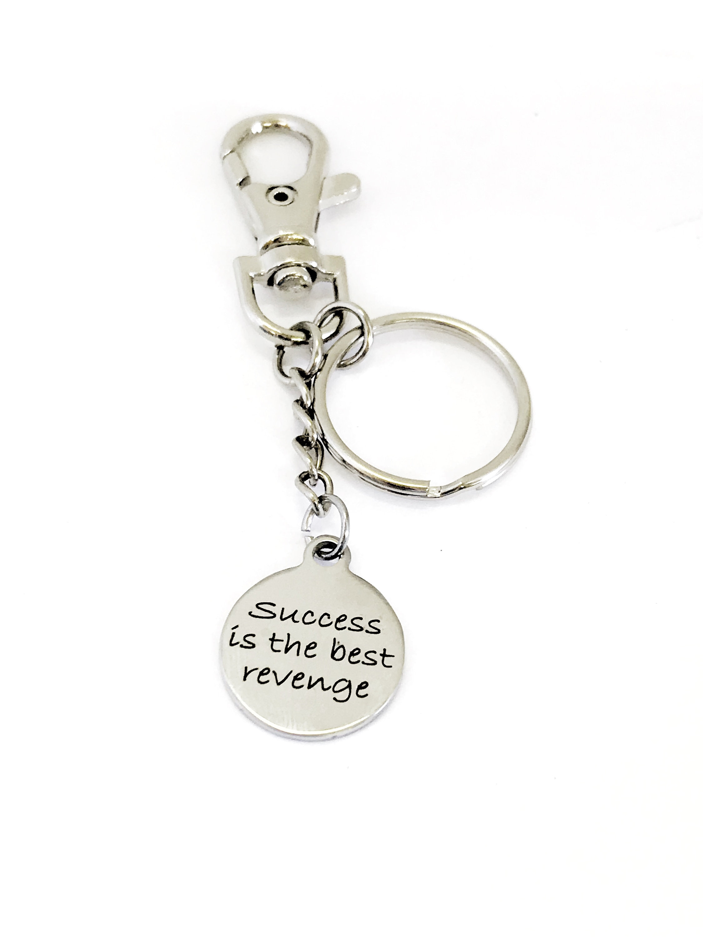 This is a great motivating success keychain gift. It has a stainless steel laser engraved charm with “Success is the best revenge” on it.