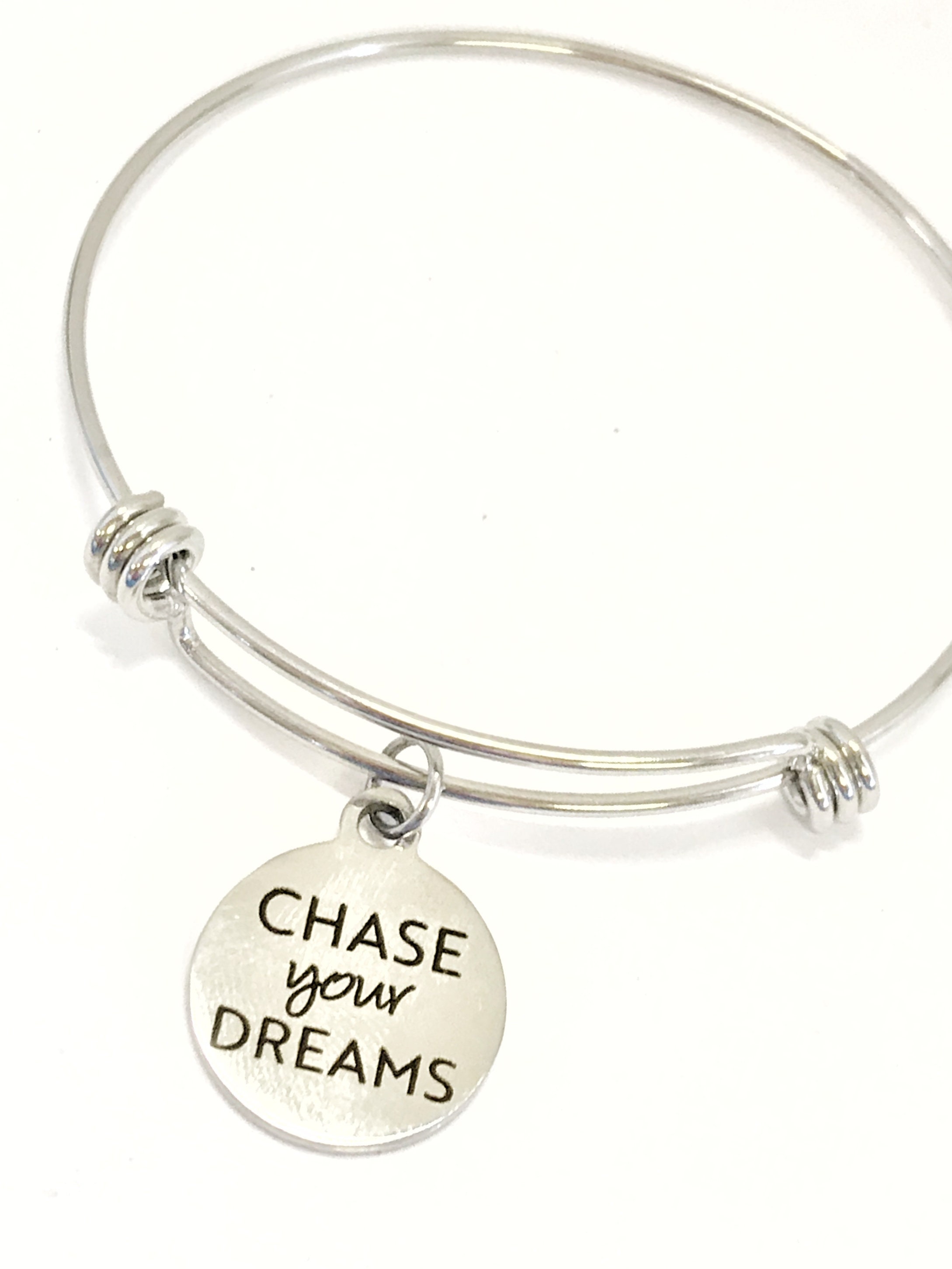 This expanding bangle charm bracelet would make a wonderful encouraging gift. This is a beautiful bangle bracelet with a laser engraved stainless steel charm that has “Chase Your Dreams” on it.