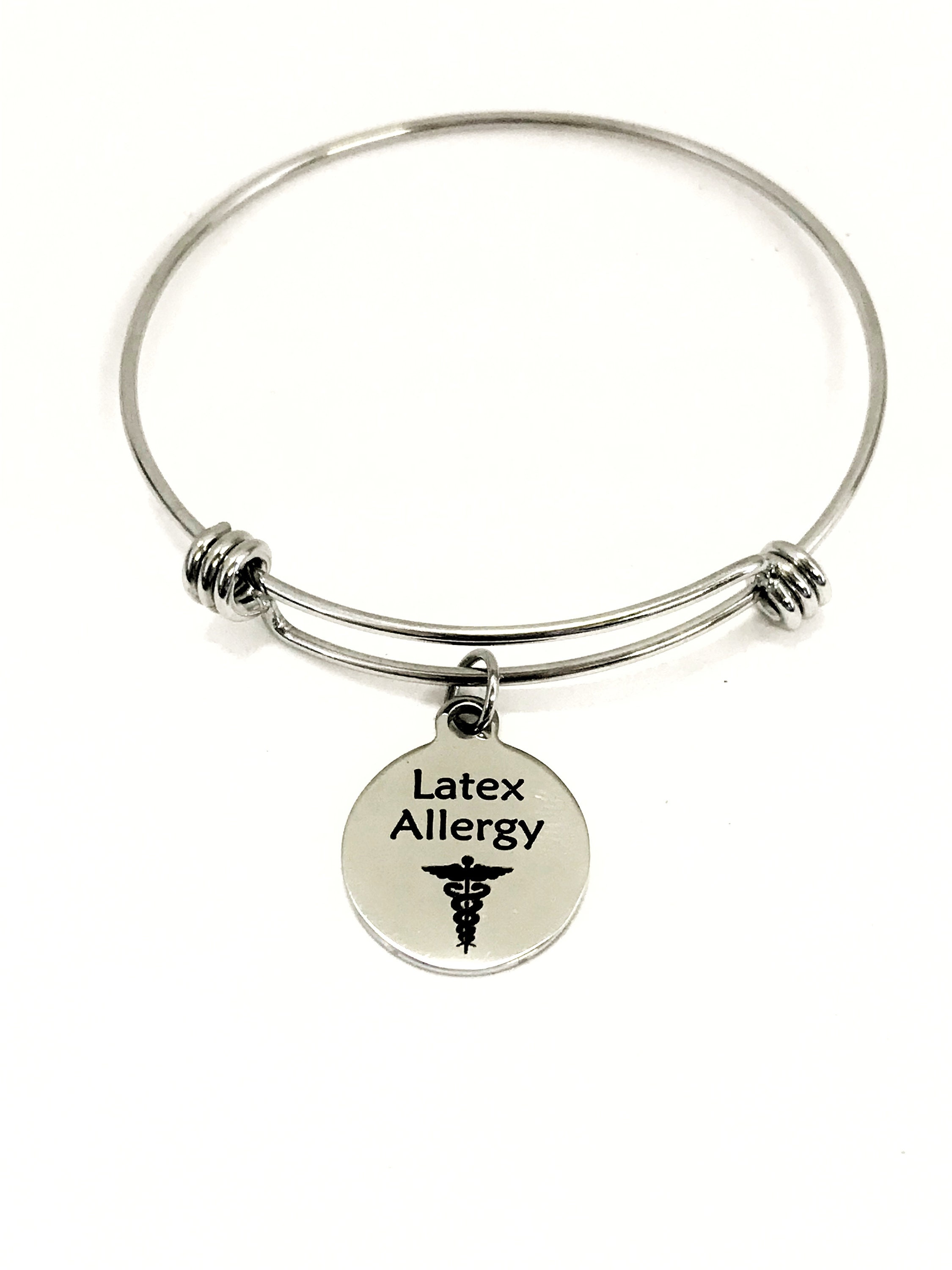 This is a beautiful bangle bracelet with a laser engraved stainless steel charm that has an “Latex Allergy” notification on it.