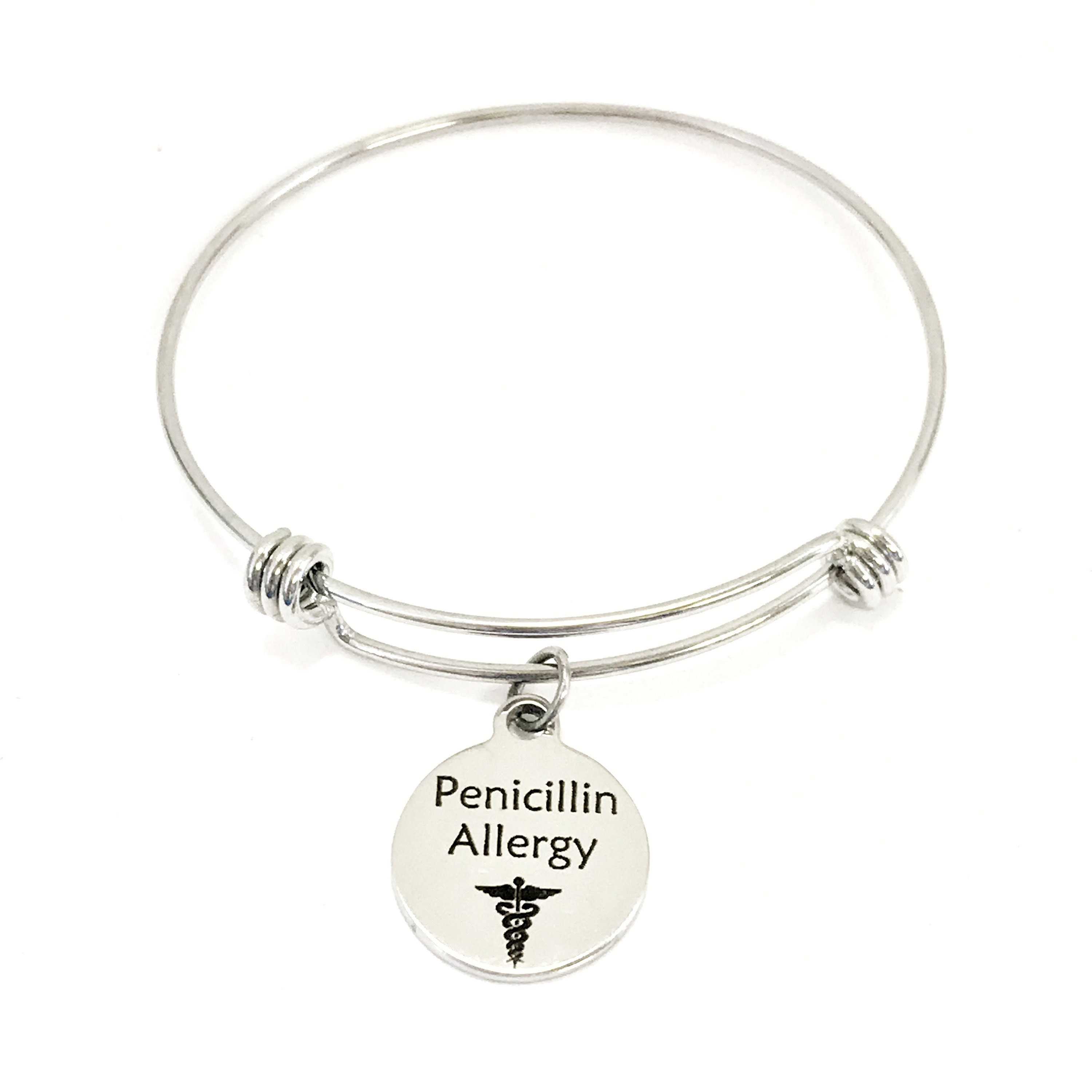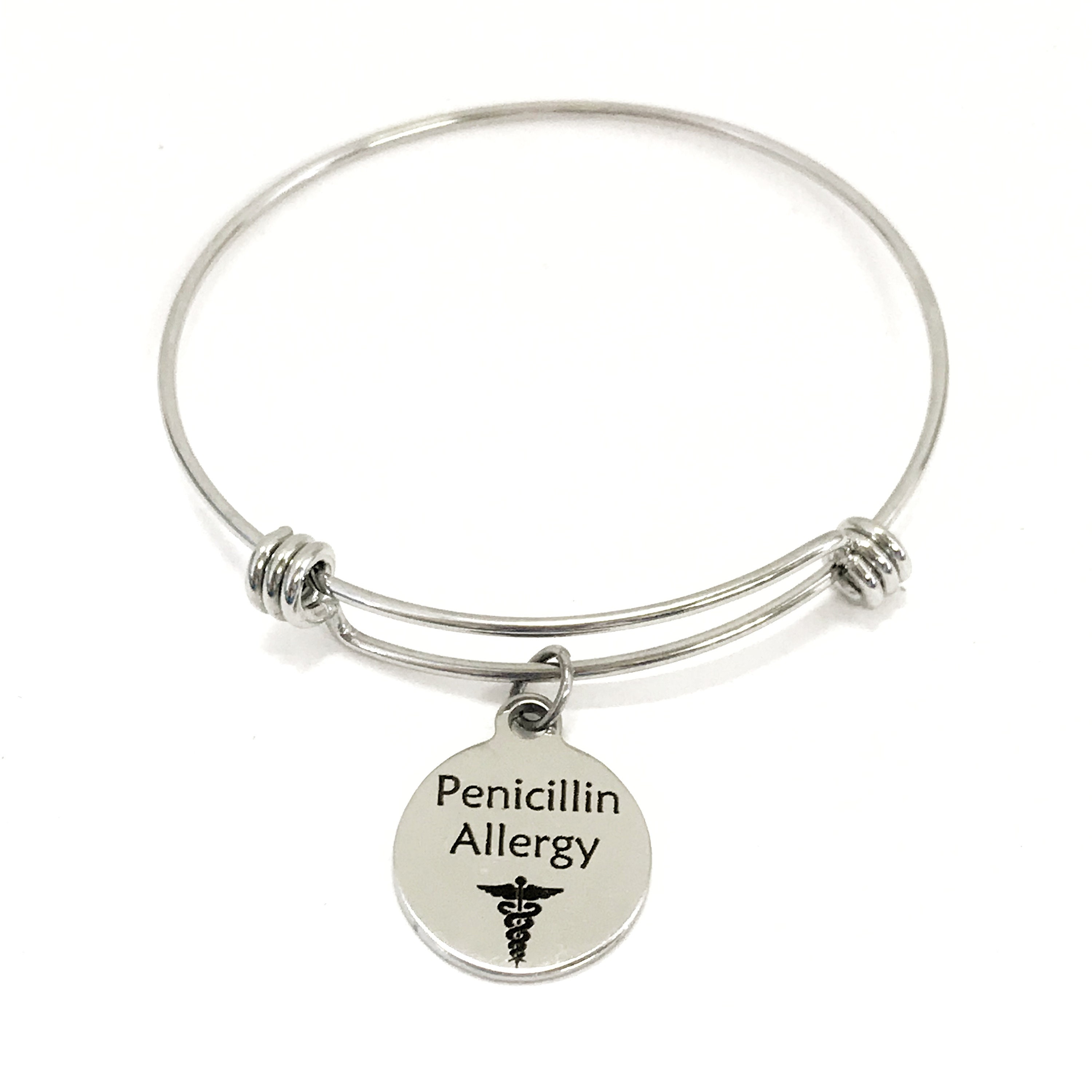 This is a beautiful bangle bracelet with a laser engraved stainless steel charm that has an “Penicillin Allergy” notification on it.