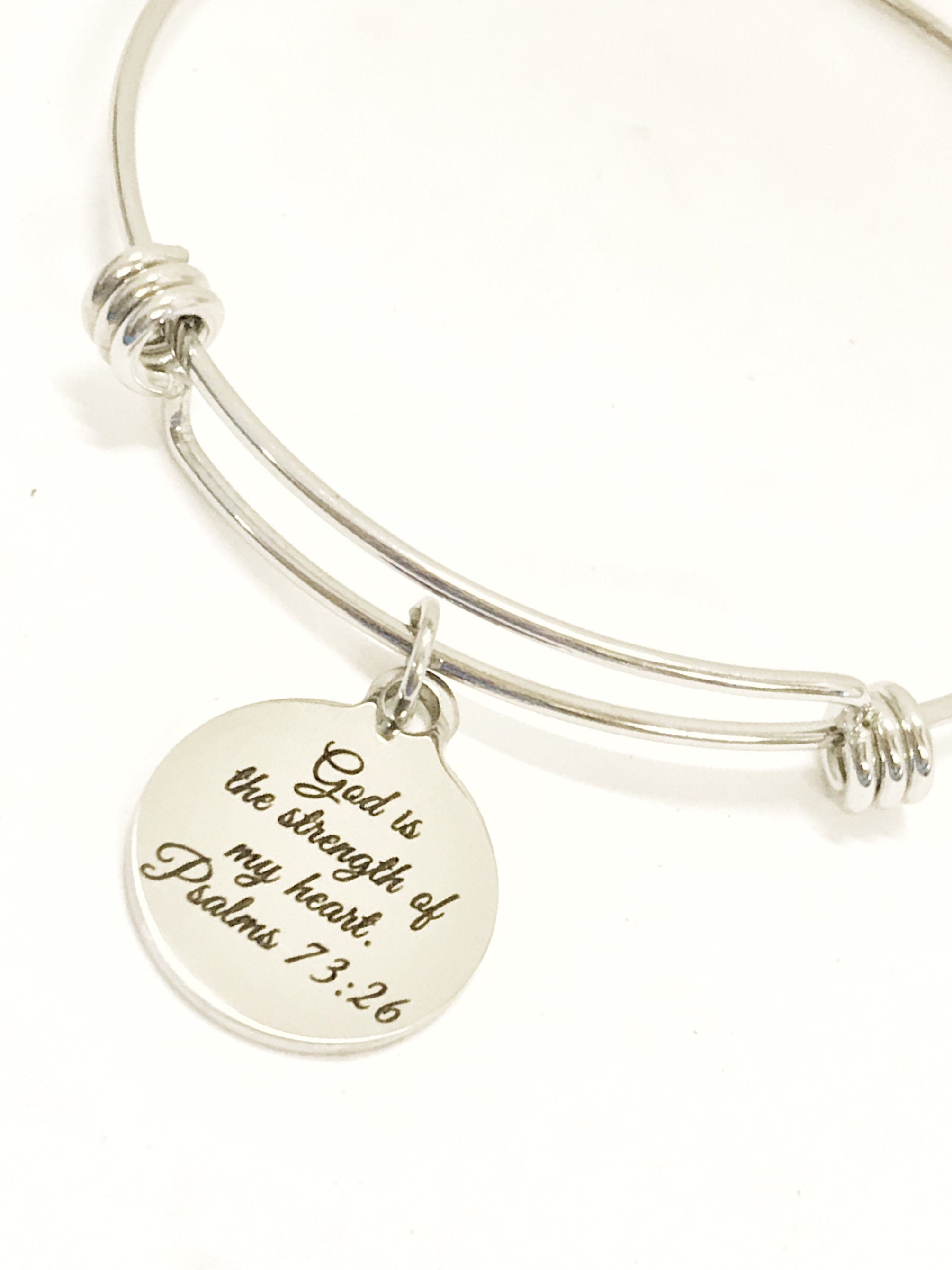 This beautiful expanding bangle has a stainless steel laser engraved charm that has "God is the strength of my heart" from Psalms 73:26 on it. The bracelet is made of stainless steel to stand up to regular wear without changing color or tarnishing.