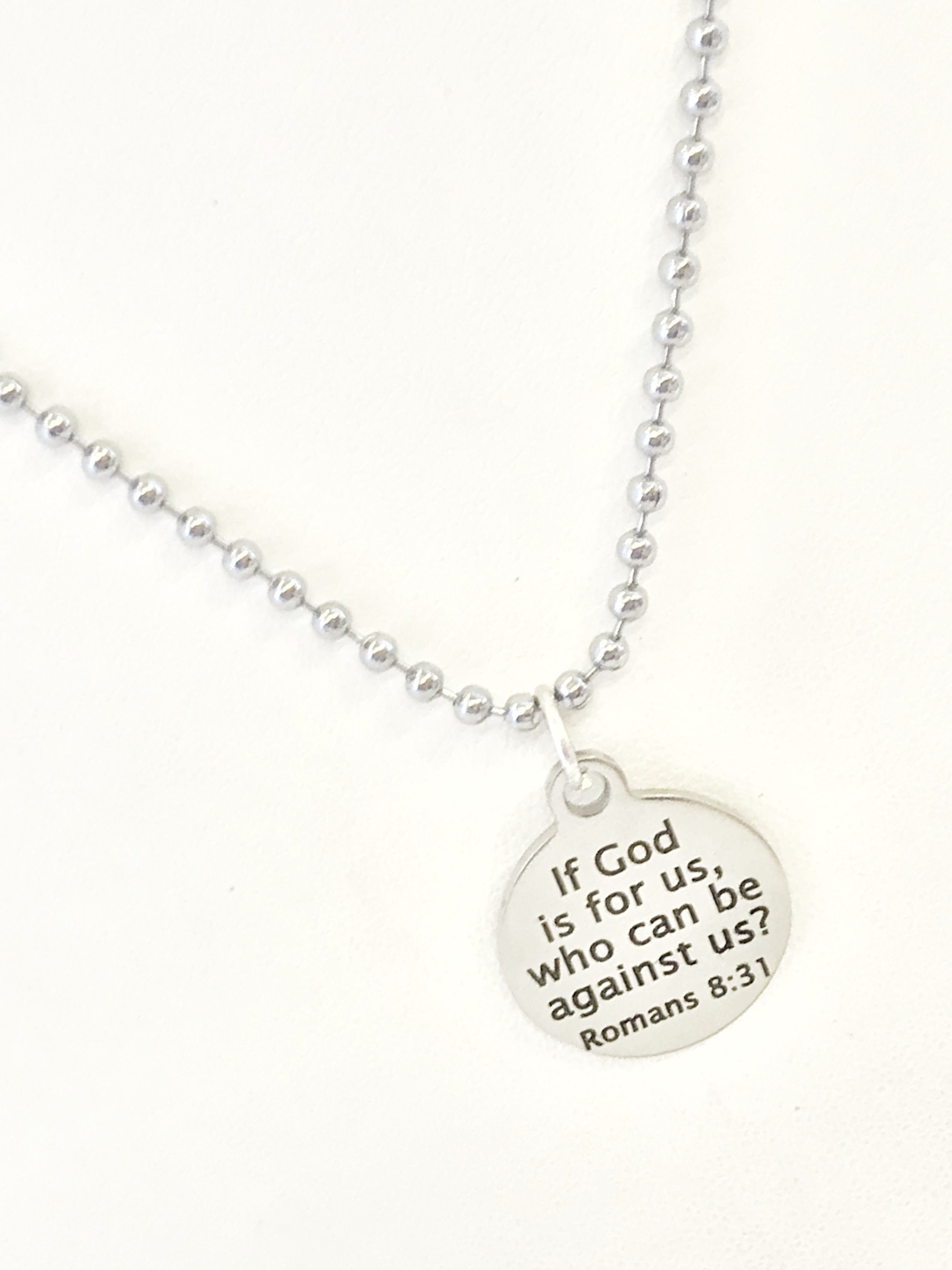 This necklace would make a great gift to remind someone that if God is for us, it doesn’t matter who is against us. The pendant is stainless steel laser engraved pendant on a 24 inch stainless steel ball chain. The pendant has “If god is for us, who can be against us” from Romans 8:31 on it.