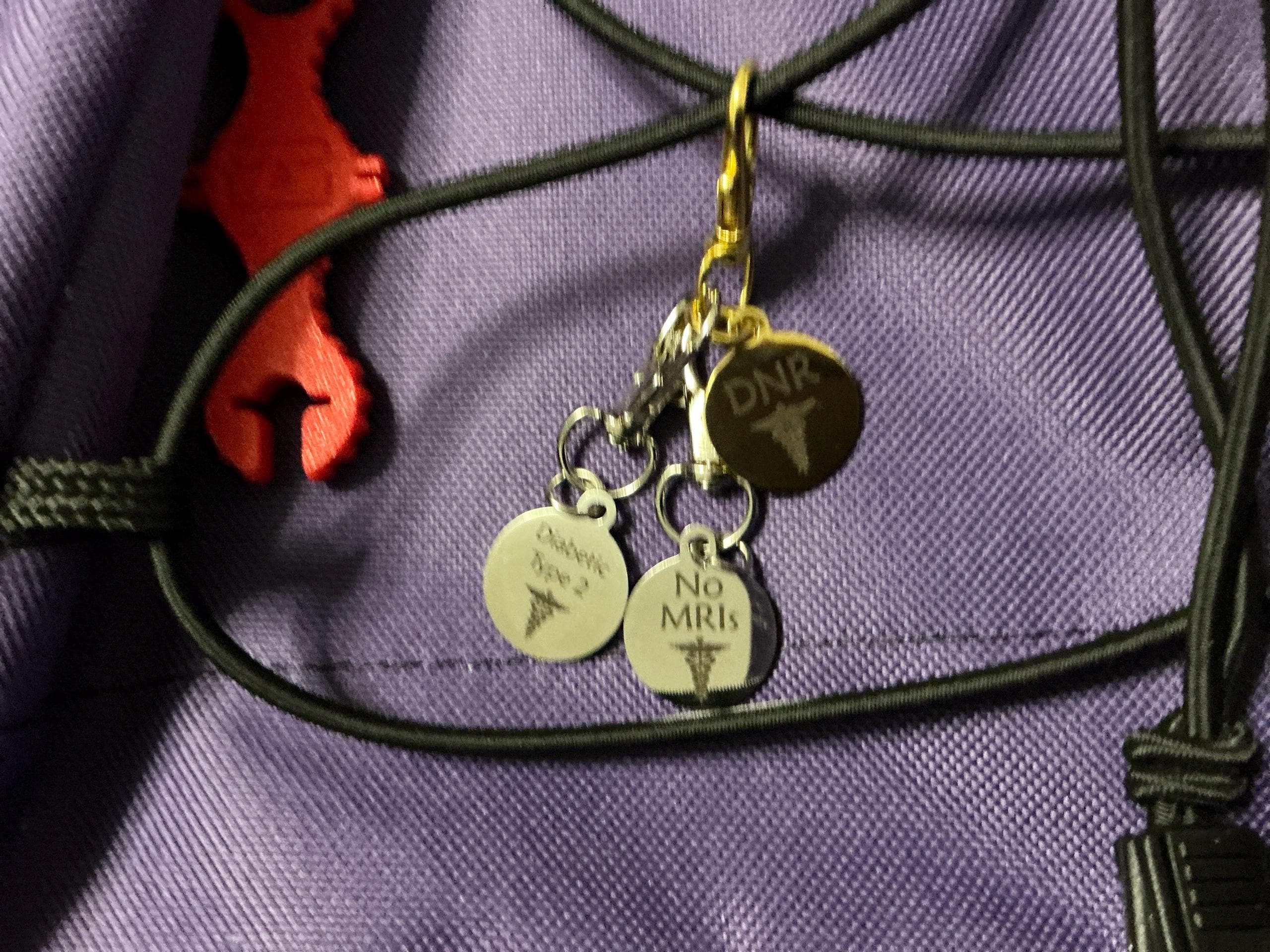 This is a zipper pull or bag charm that can be used as a medical notification piece on a bag or piece of clothing. It has a “Diabetic Type 2” notification charm on it. The charm measures approx. 3/4 inch across