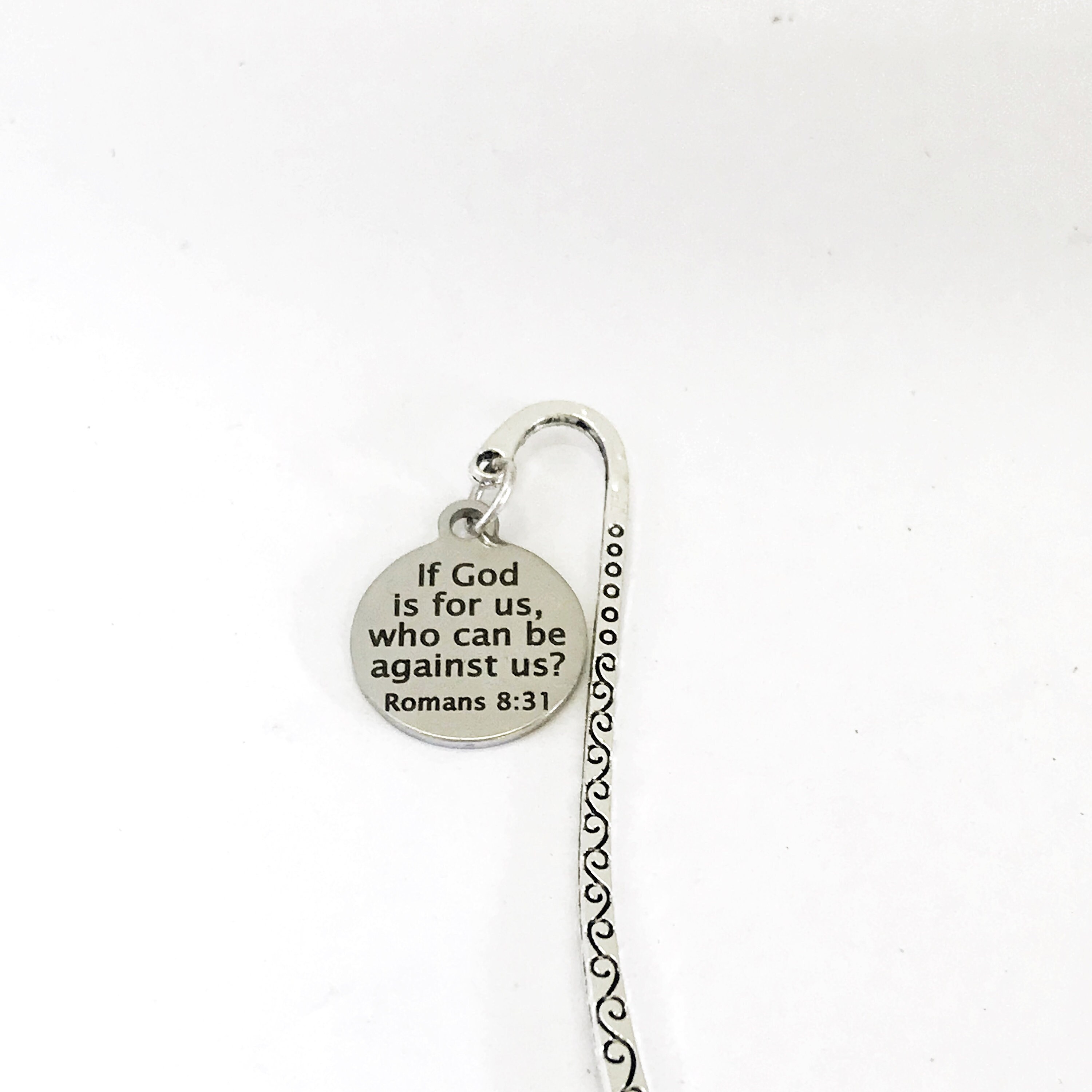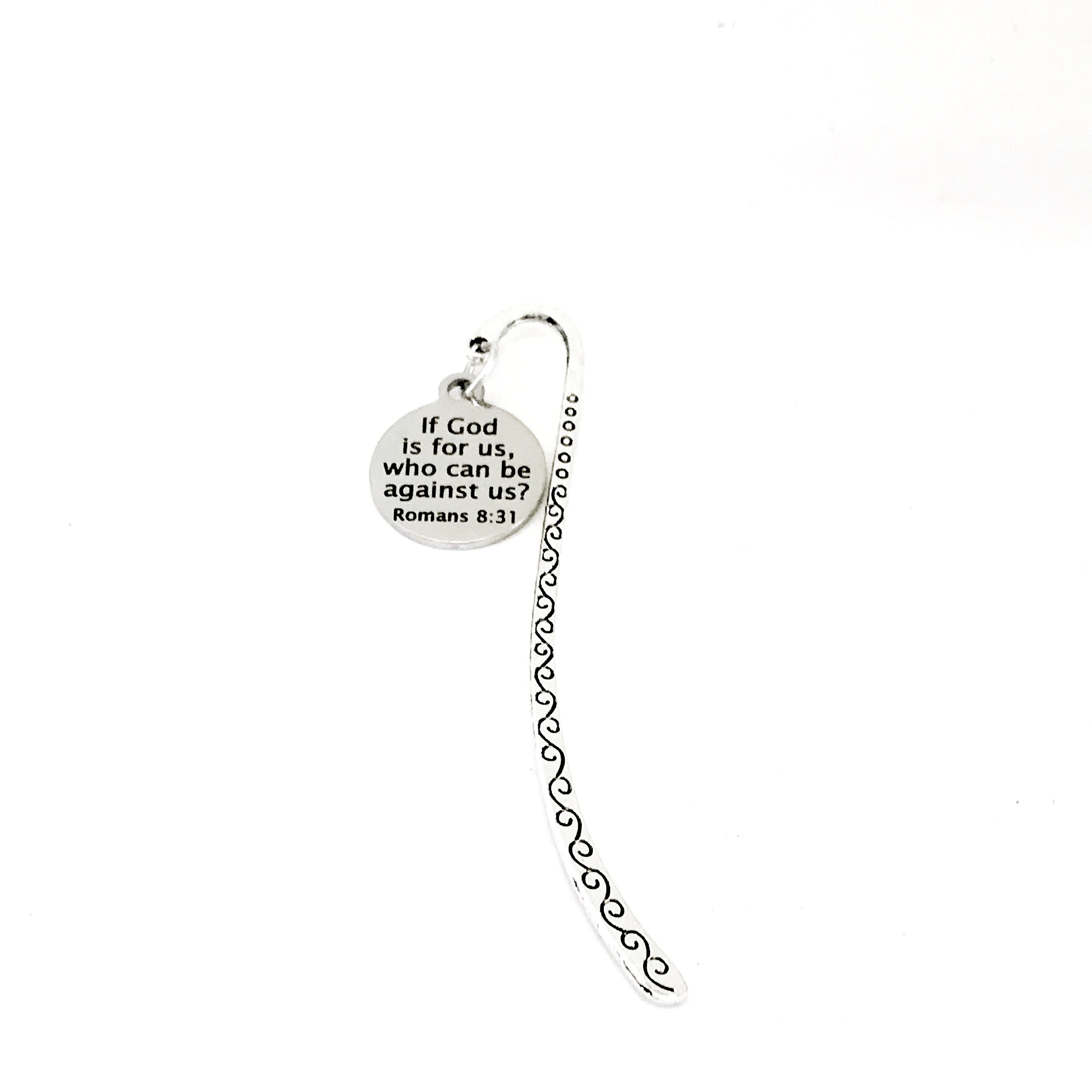 This is a great Christian bookmark gift. It is a bookmark with a stainless steel laser engraved charm with “if God is for us, who can be against us” from Romans 8:31 on it.