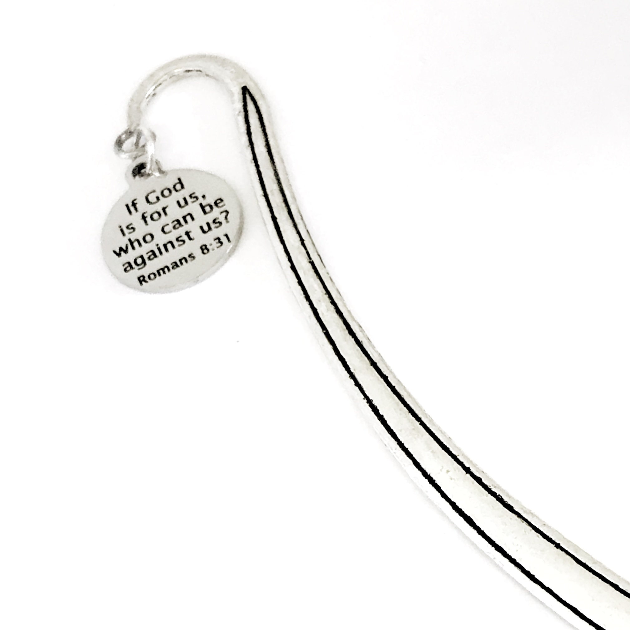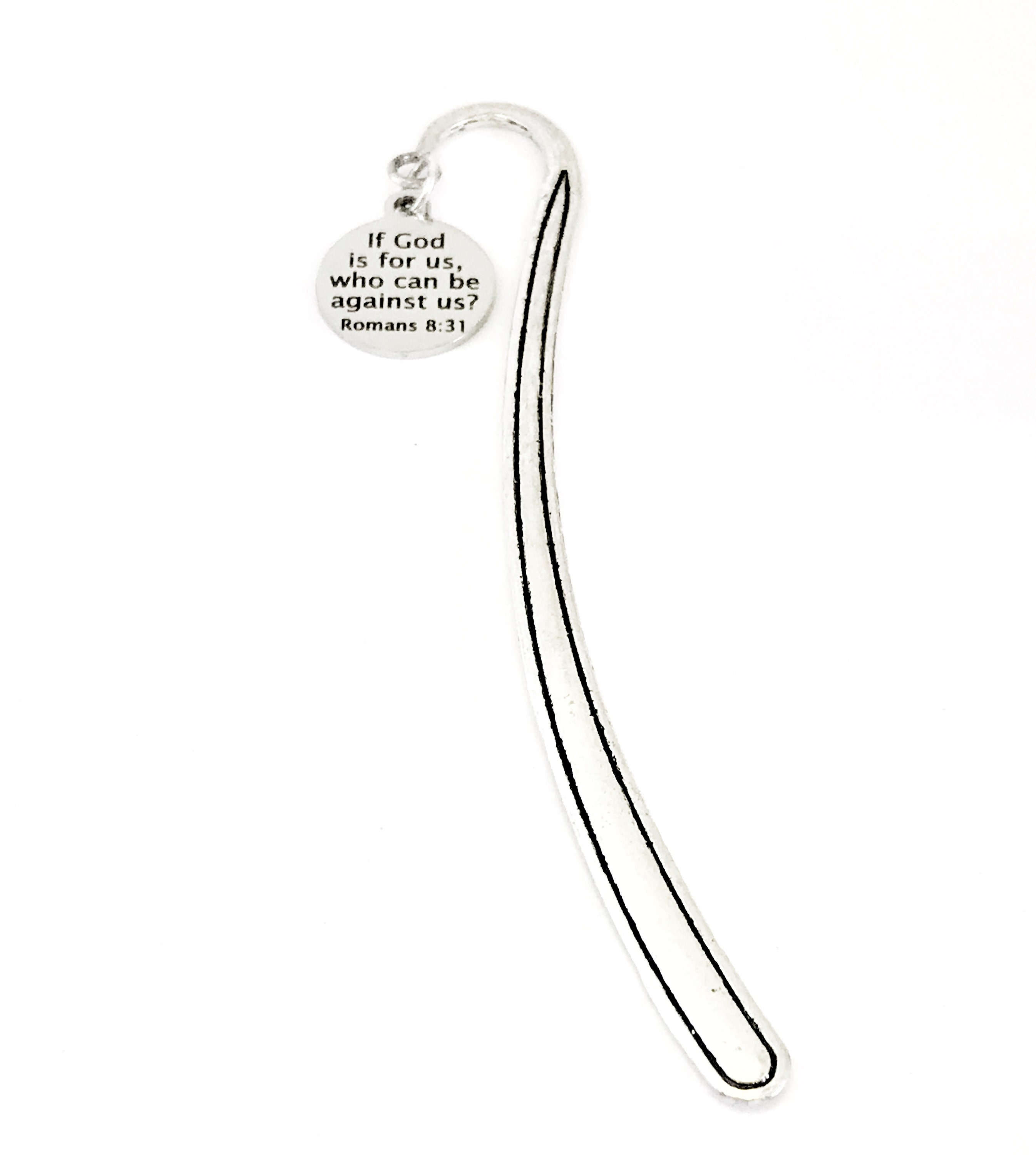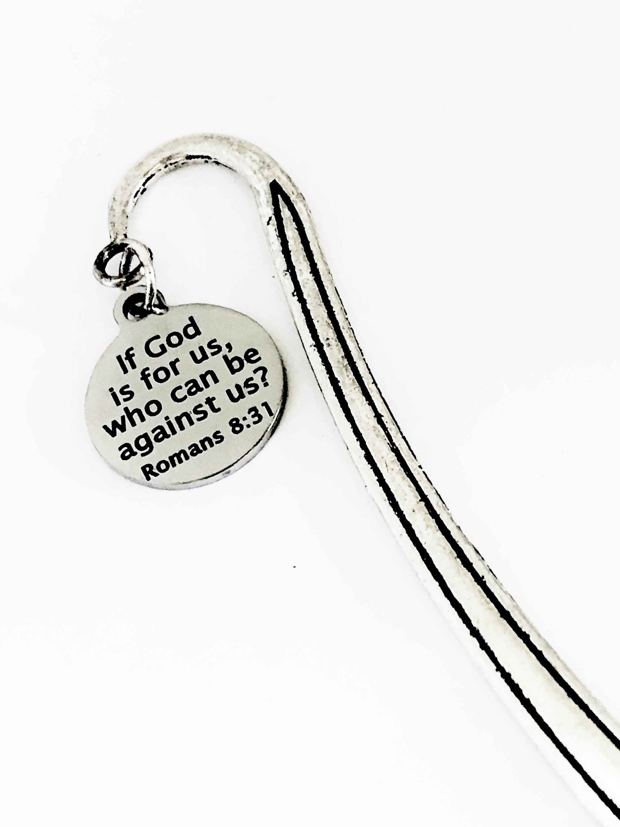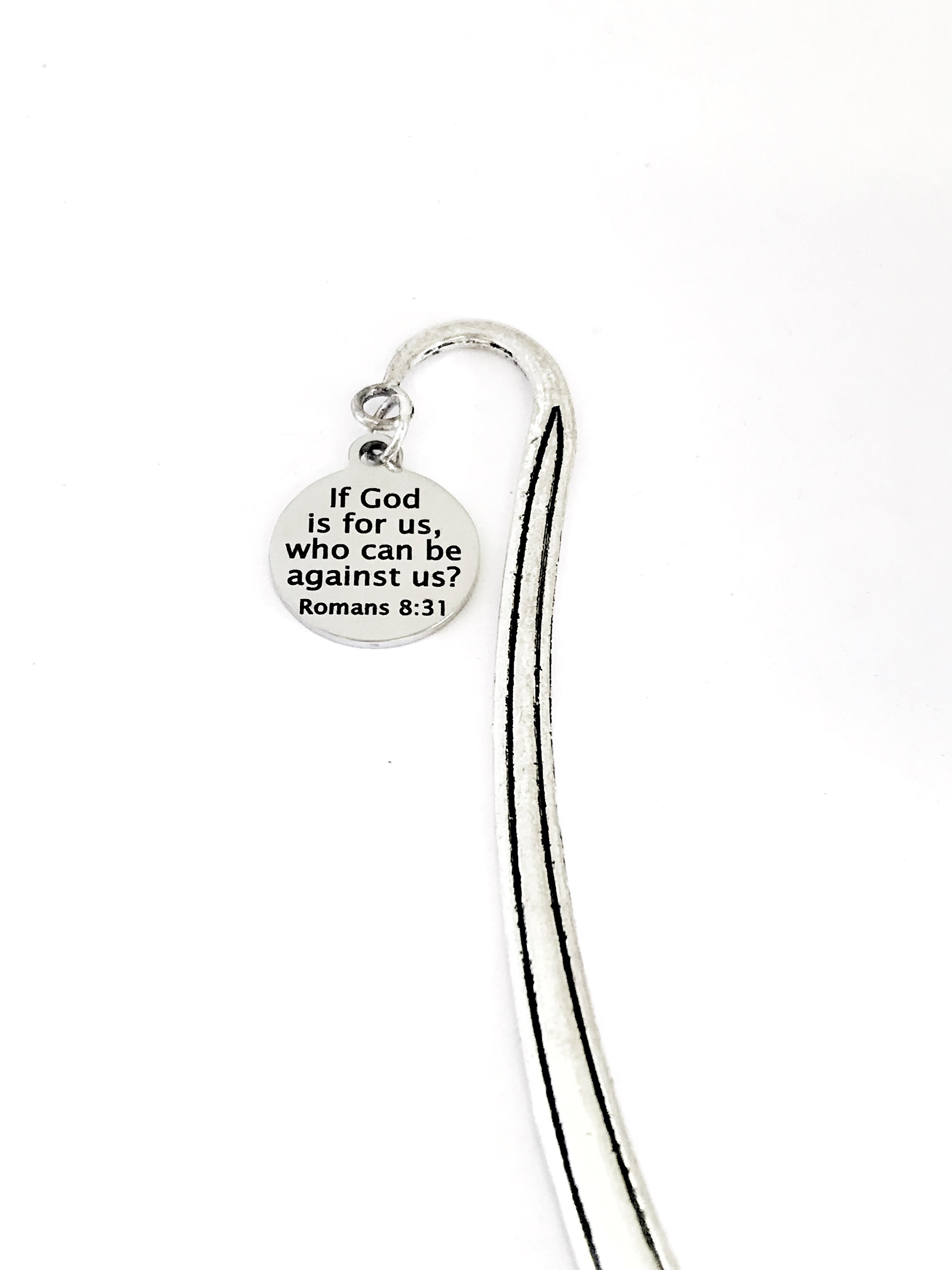 This bookmark would be a great gift to remind someone that no matter who may be against them in life, if God is on their side, that is all that matters. It has a stainless steel laser engraved charm with “If God is for us, who can be against us” from Romans 8:31 on it.
