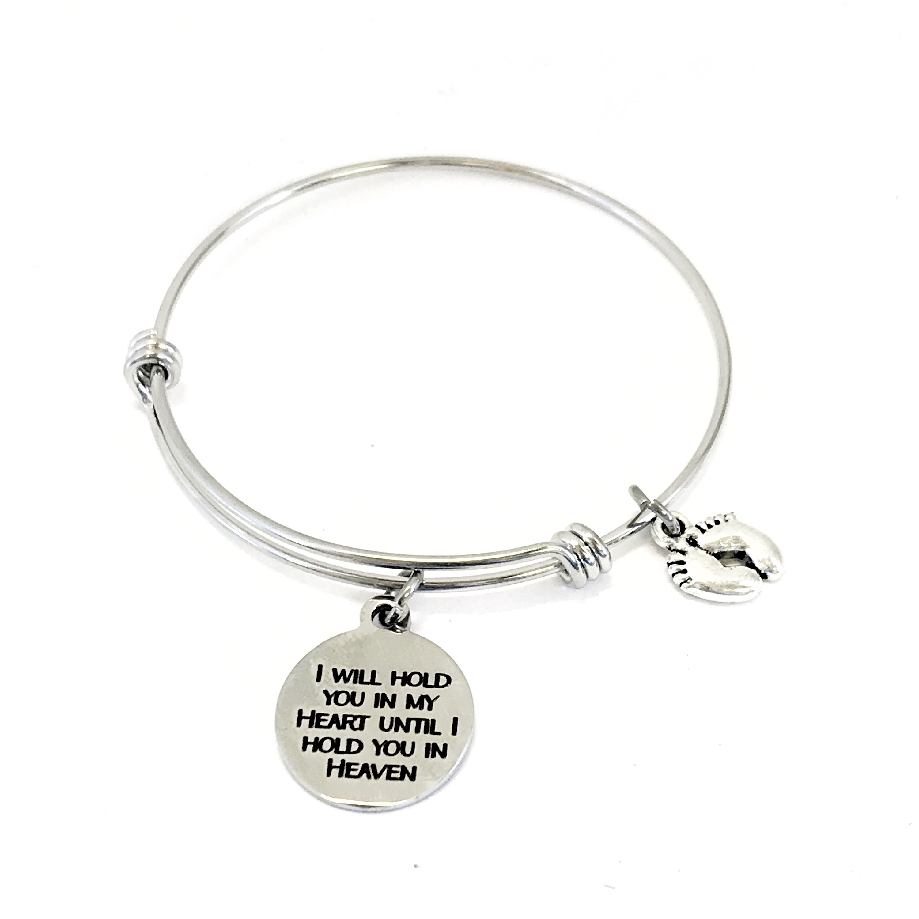 This stacking bangle bracelet would be a great gift way to memorialize a pregnancy loss. It has a stainless steel laser engraved charm that says “I will hold you in my heart until I hold you in heaven" on it.