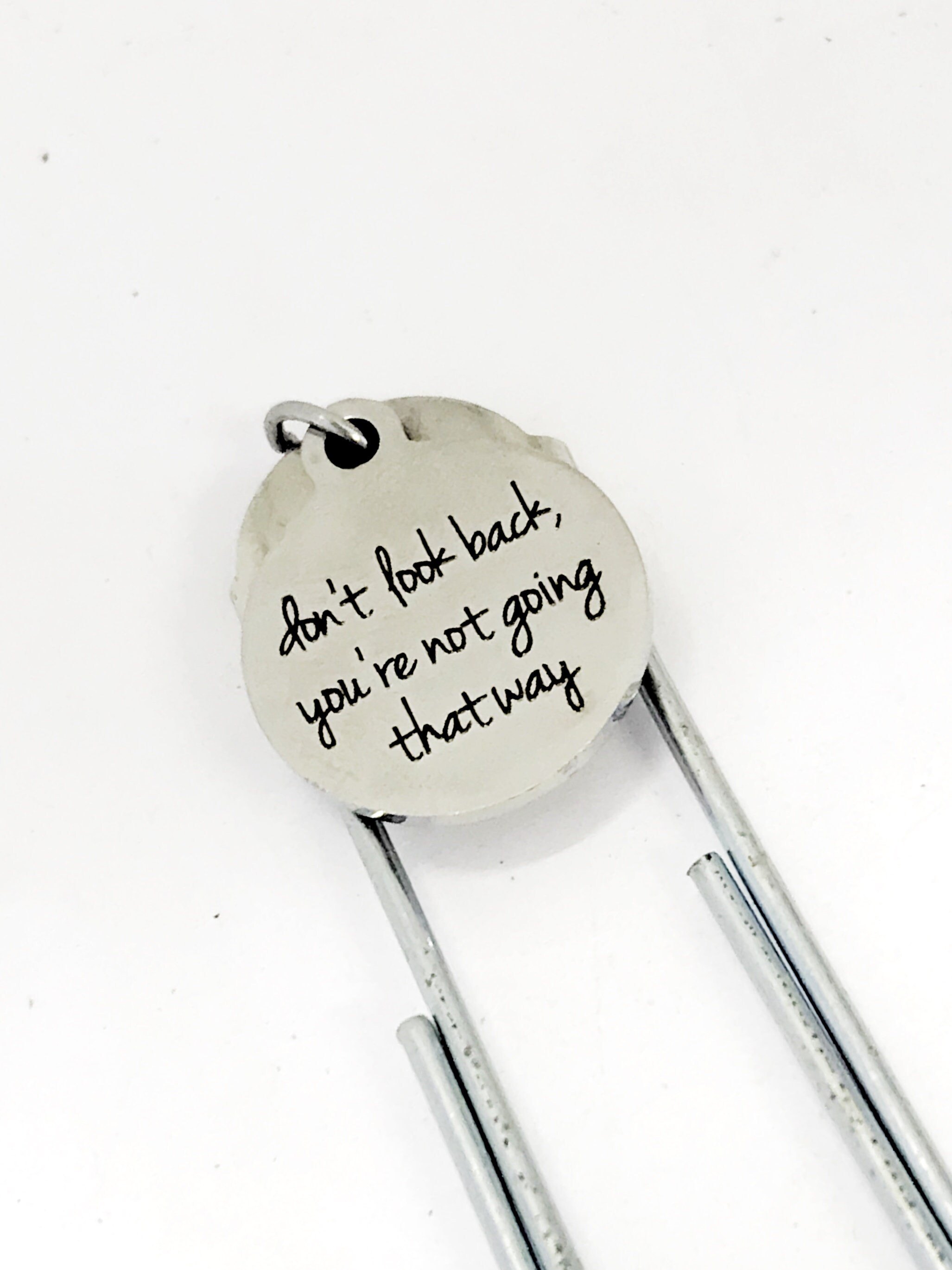 This is a great large paper clip style bookmark that has a stainless steel laser engraved charm with "don’t look back, you’re not going that way" on it. It can be used as a bookmark, page marker, or planner book mark.