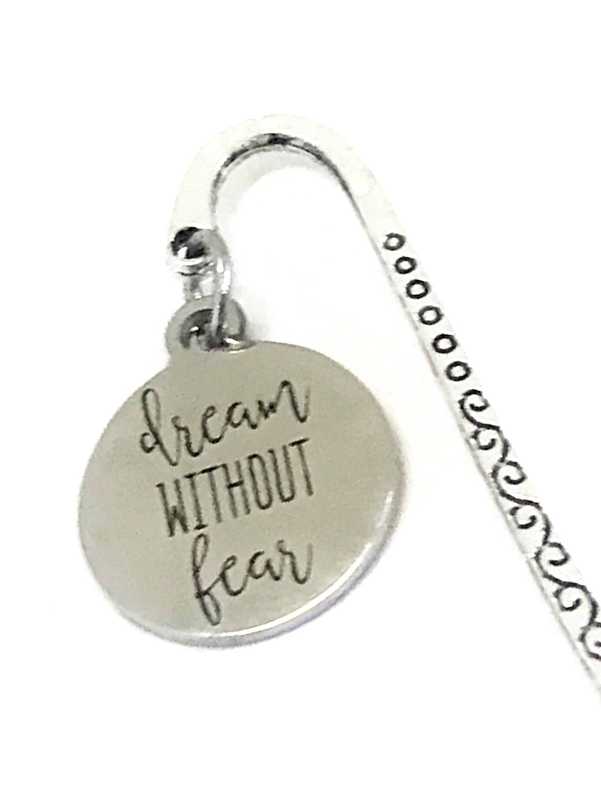 This is a great motivating bookmark gift. It is a bookmark with a stainless steel laser engraved charm with “Dream Without Fear” on it.