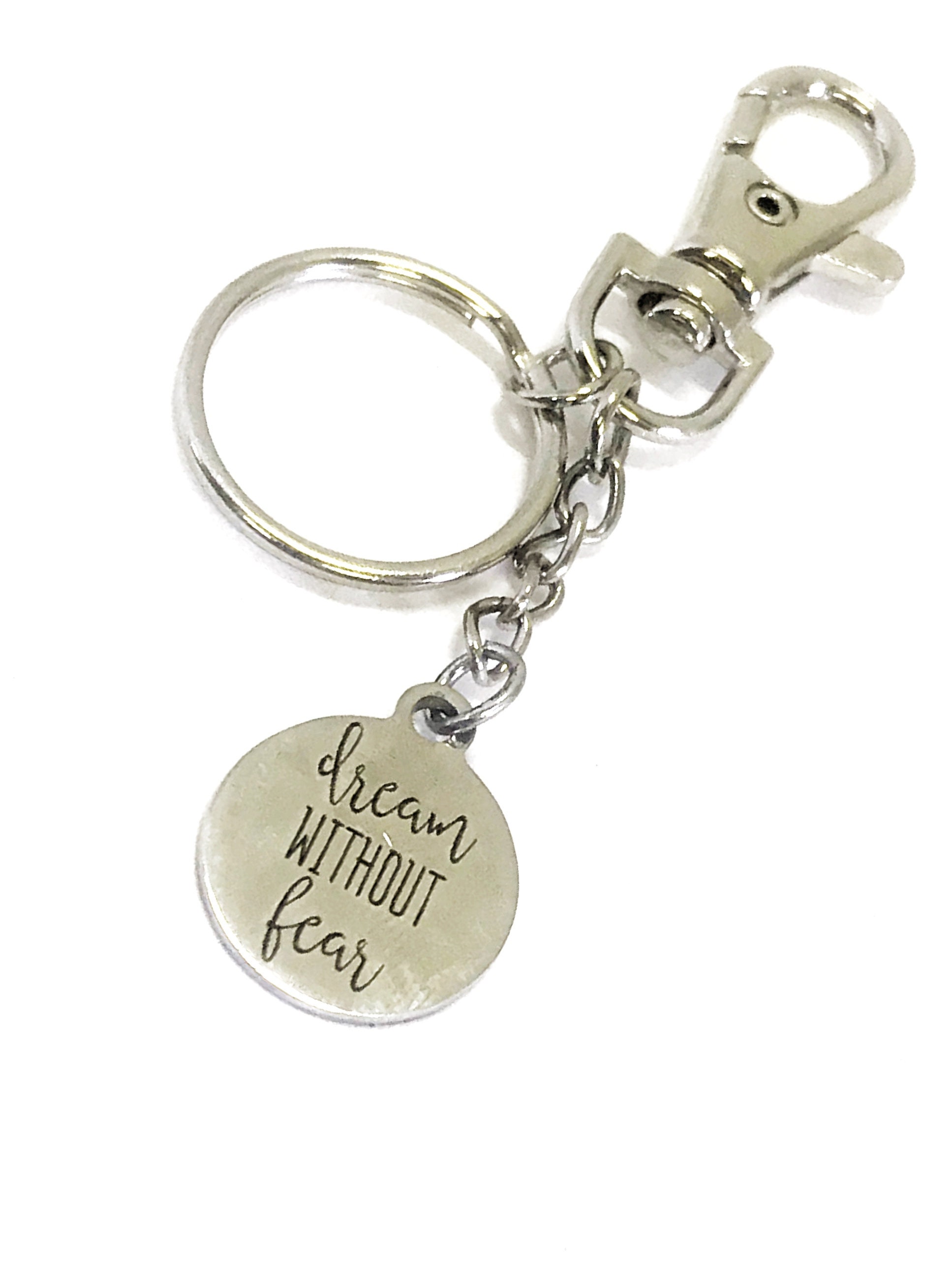 This is a great motivational keychain gift . The keyring can be clipped onto your bag to make it easy to access without digging to the bottom of the bag. It has a stainless steel laser engraved charm with “Dream Without Fear” on it.