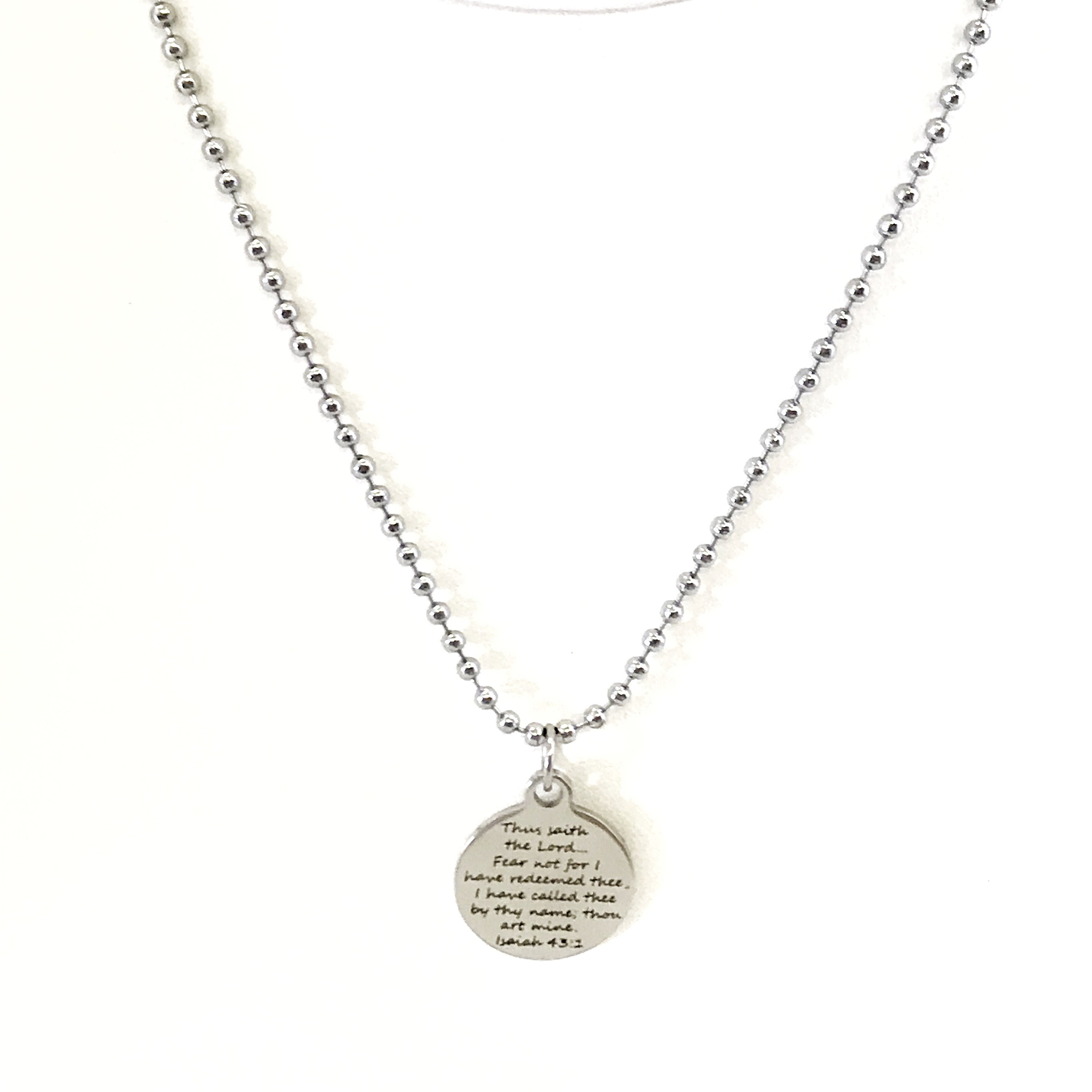 This necklace would make a great gift to remind someone that if God’s love endures forever. The pendant is stainless steel laser engraved pendant on a 24 inch stainless steel ball chain. The pendant has “Thus saith the Lord... Fear not for I have redeemed thee, I have called thee by thy name; thou art mine.” from Isaiah 43:1 on it.