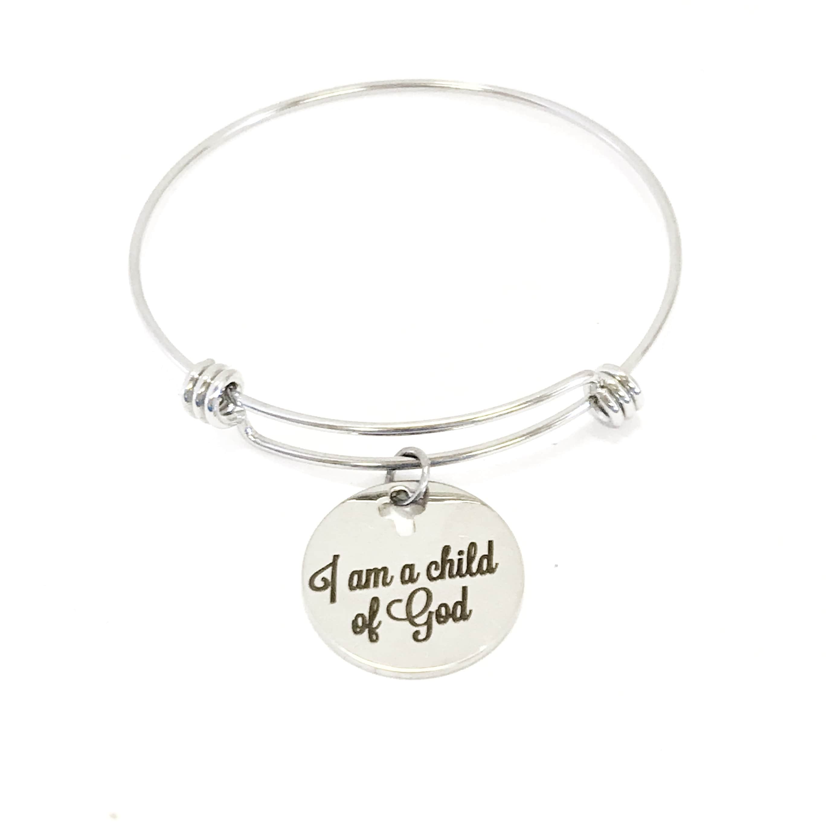 This stacking bangle bracelet is a beautiful Christian jewelry gift to remind someone of their worth. It has a stainless steel laser engraved charm that says “I am a child of God" on it.