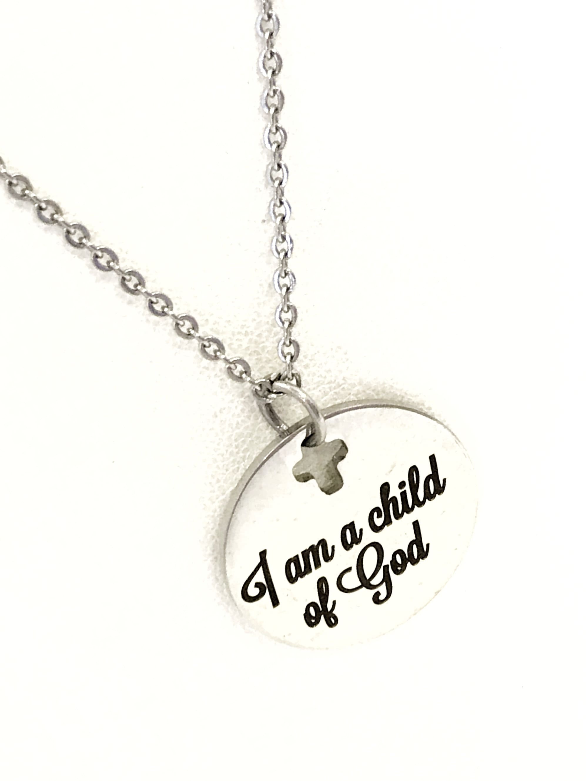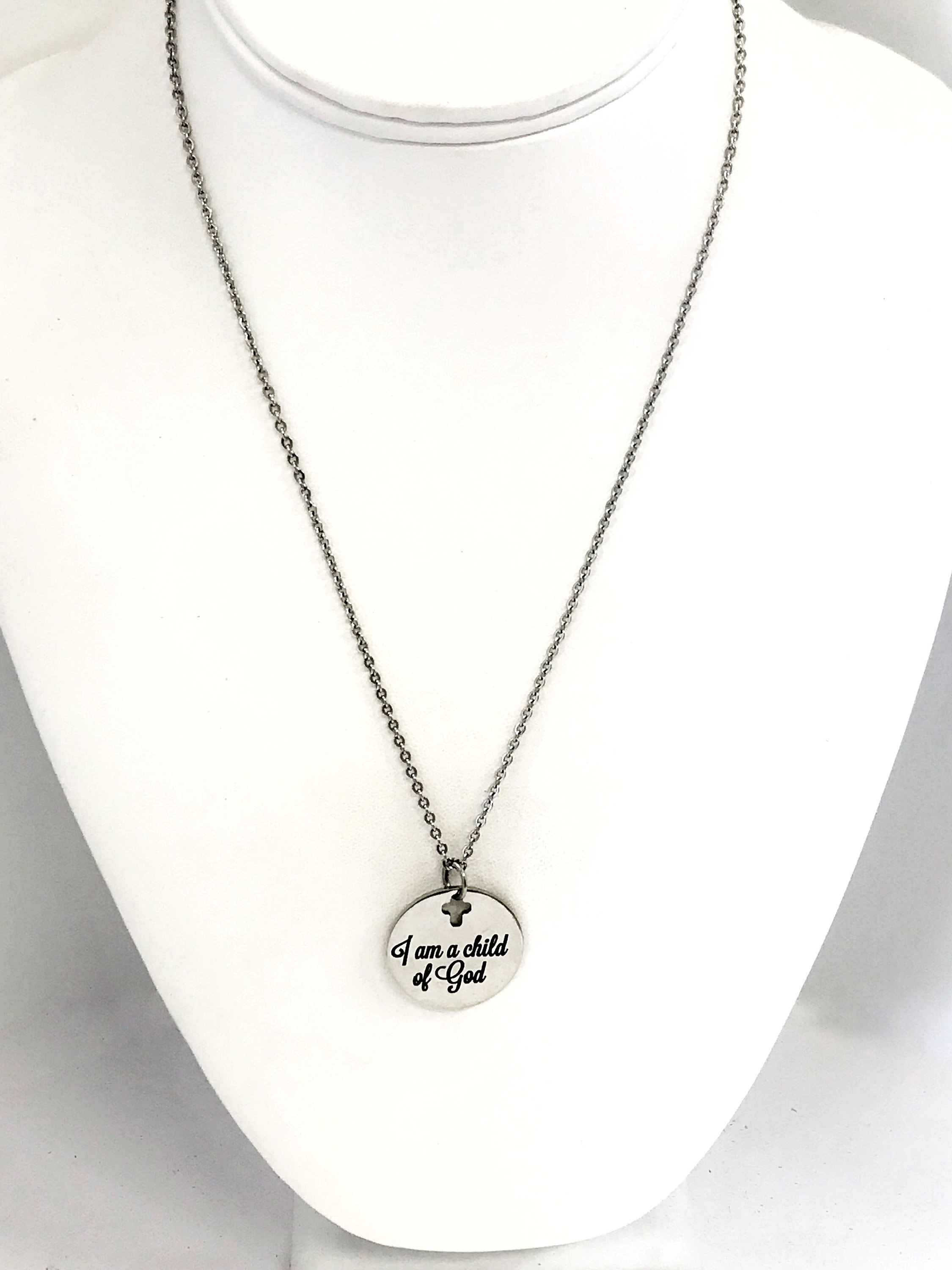 This beautiful necklace is a wonderful Christian necklace to remind the wearer that she is a child of God. The pendant is a stainless steel laser engraved charm with “I am a child of God” on it.