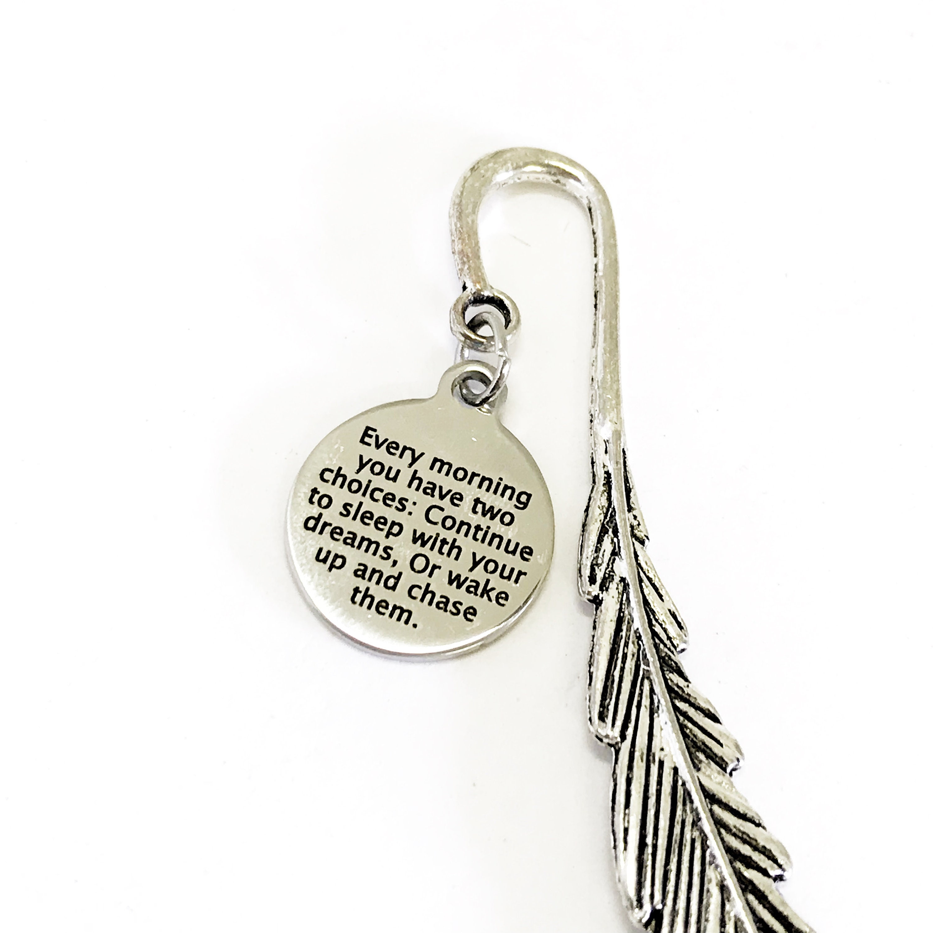 This bookmark would be a great gift to remind someone to be chase their dreams daily. It has a stainless steel laser engraved charm with “Every morning you have two choices: Continue to sleep with your dreams, Or wake up and chase them” from on it.
