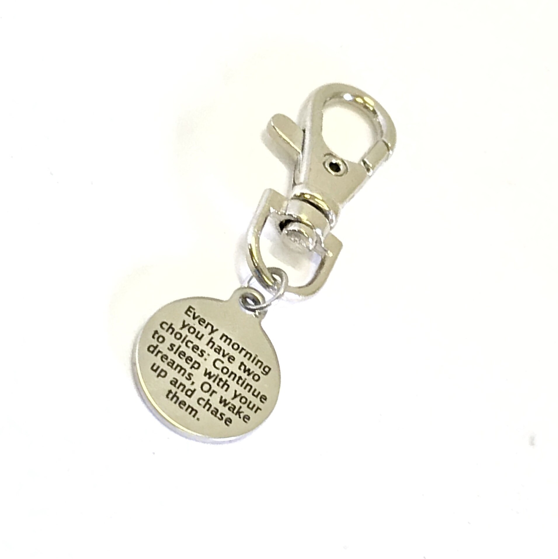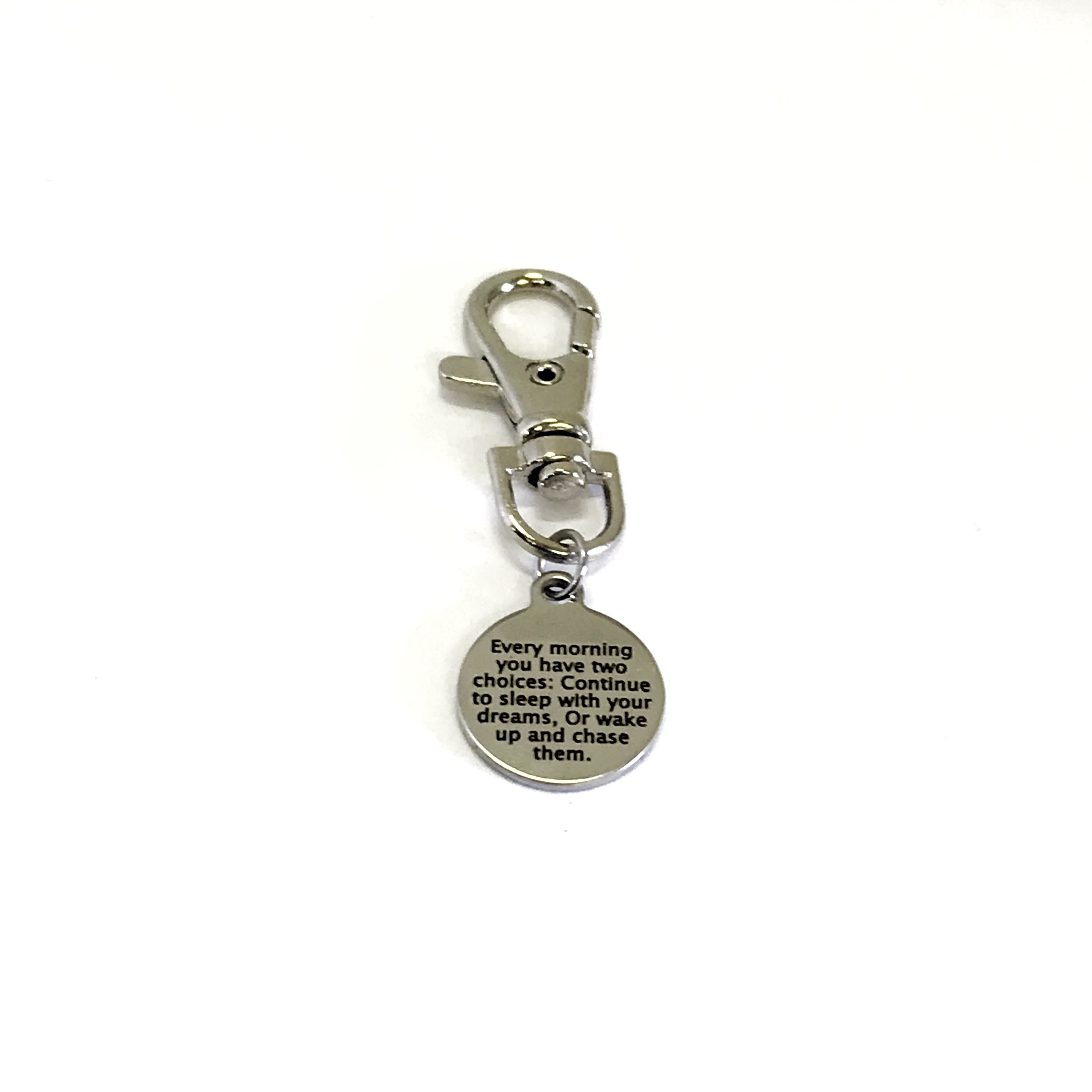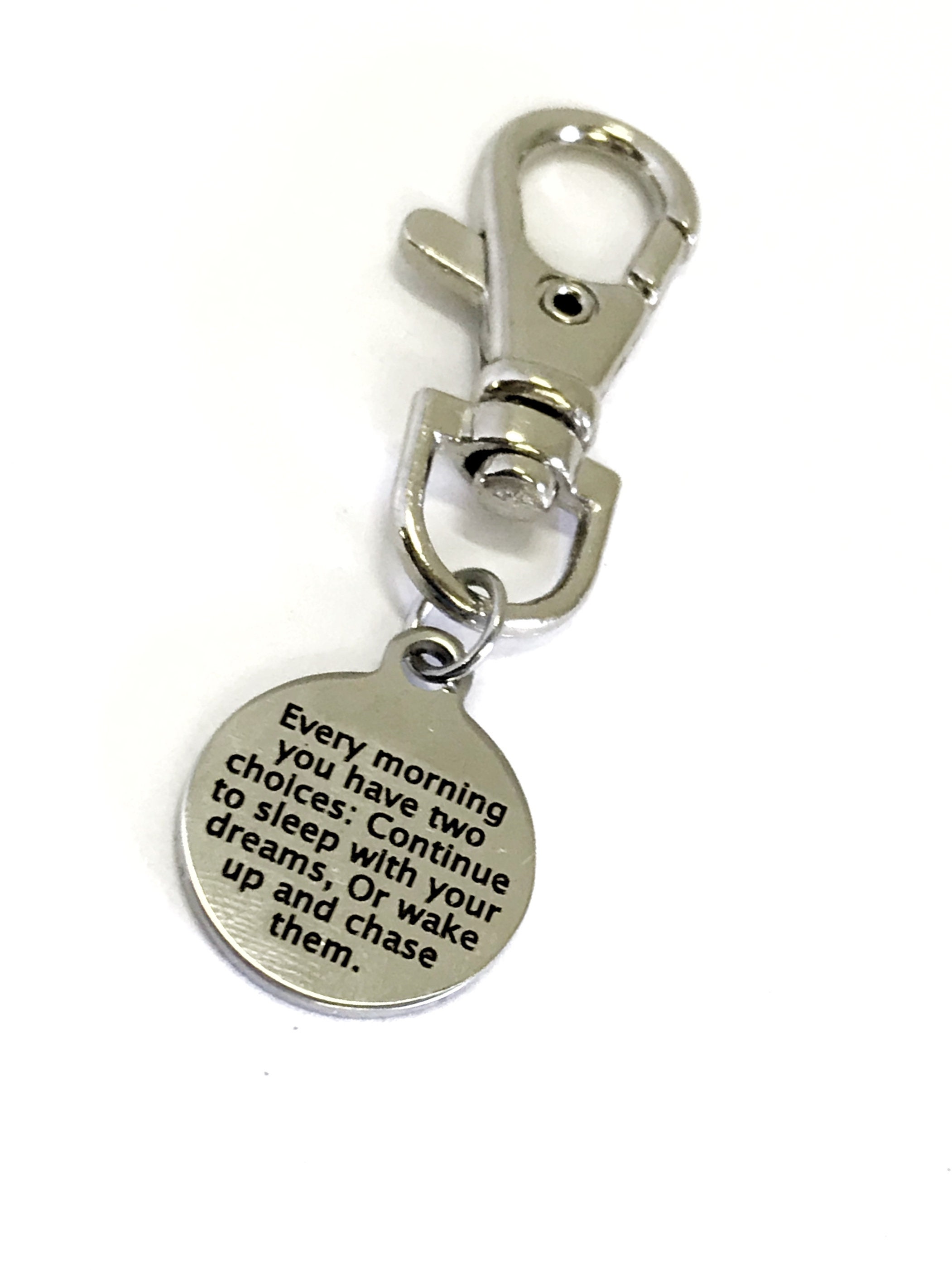 This is a great zipper pull or bag charm gift that would be a perfect reminder to chase your dreams daily. It has “Every morning you have two choices: Continue to sleep with your dreams, Or wake up and chase them” on it.