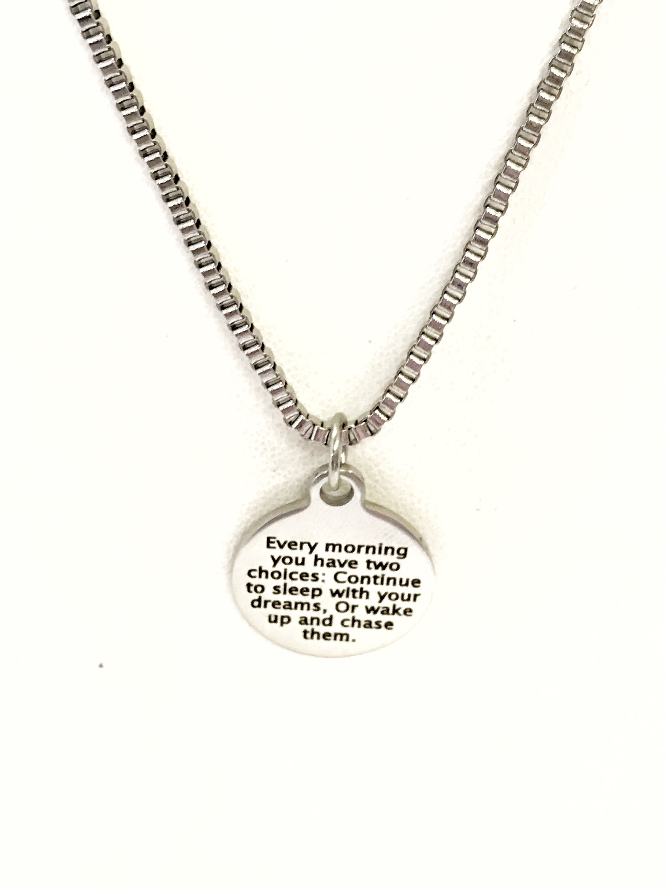 This is great necklace gift to remind the wearer to chase dreams daily. This necklace comes with a stainless steel laser engraved charm pendant on a 22 inch stainless steel box chain. The pendant has “Each morning you have two choices: Continue to sleep with your dreams, Or wake up and chase them” on it.