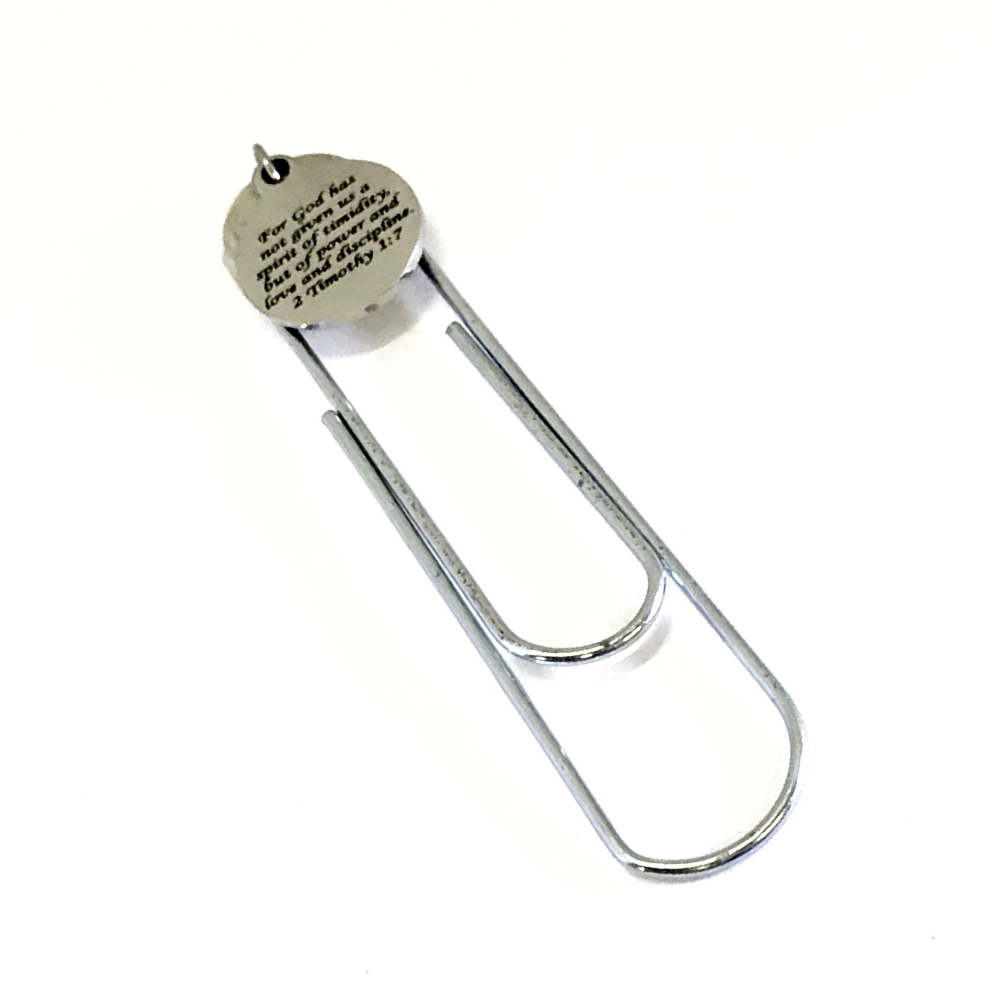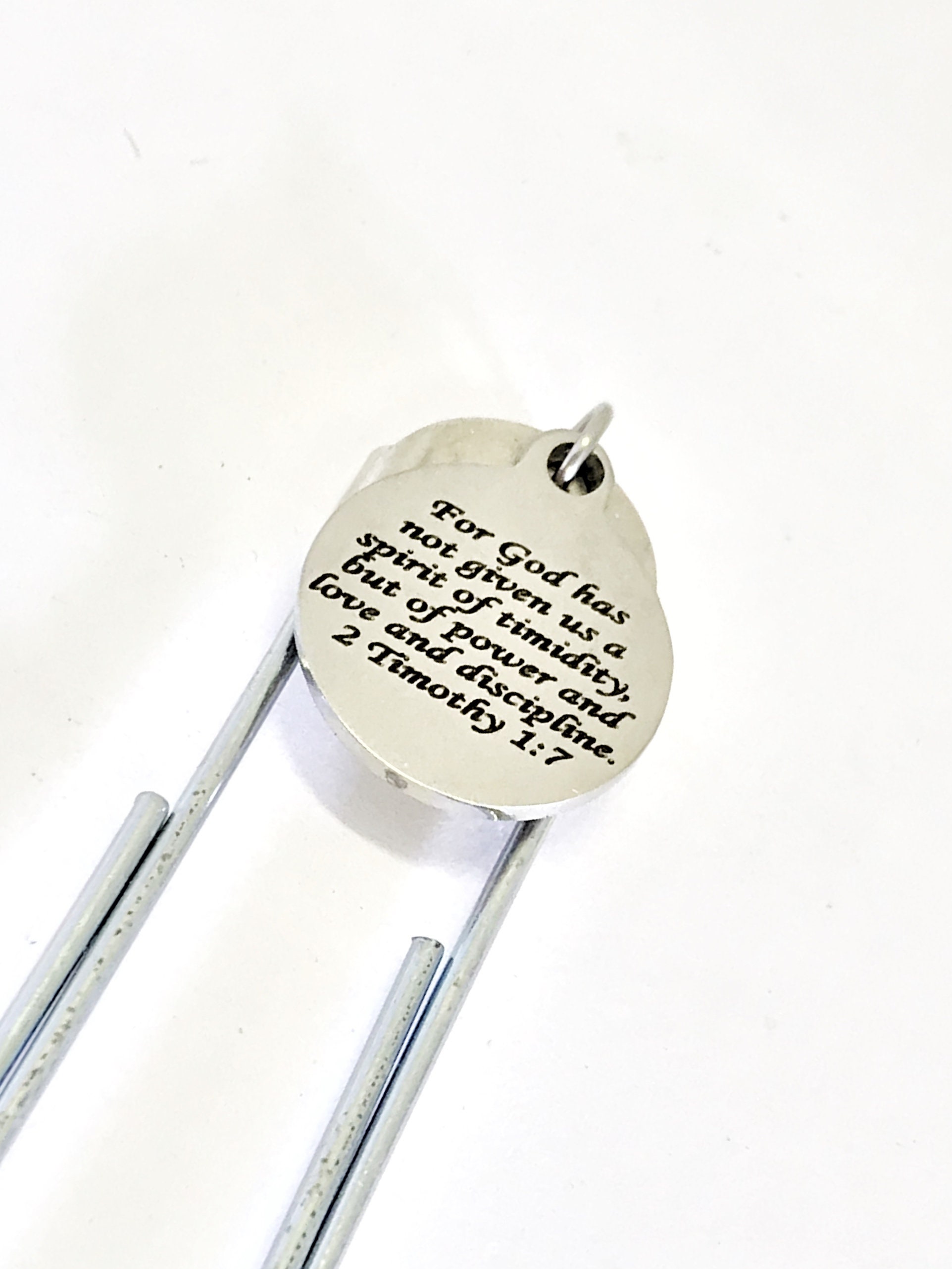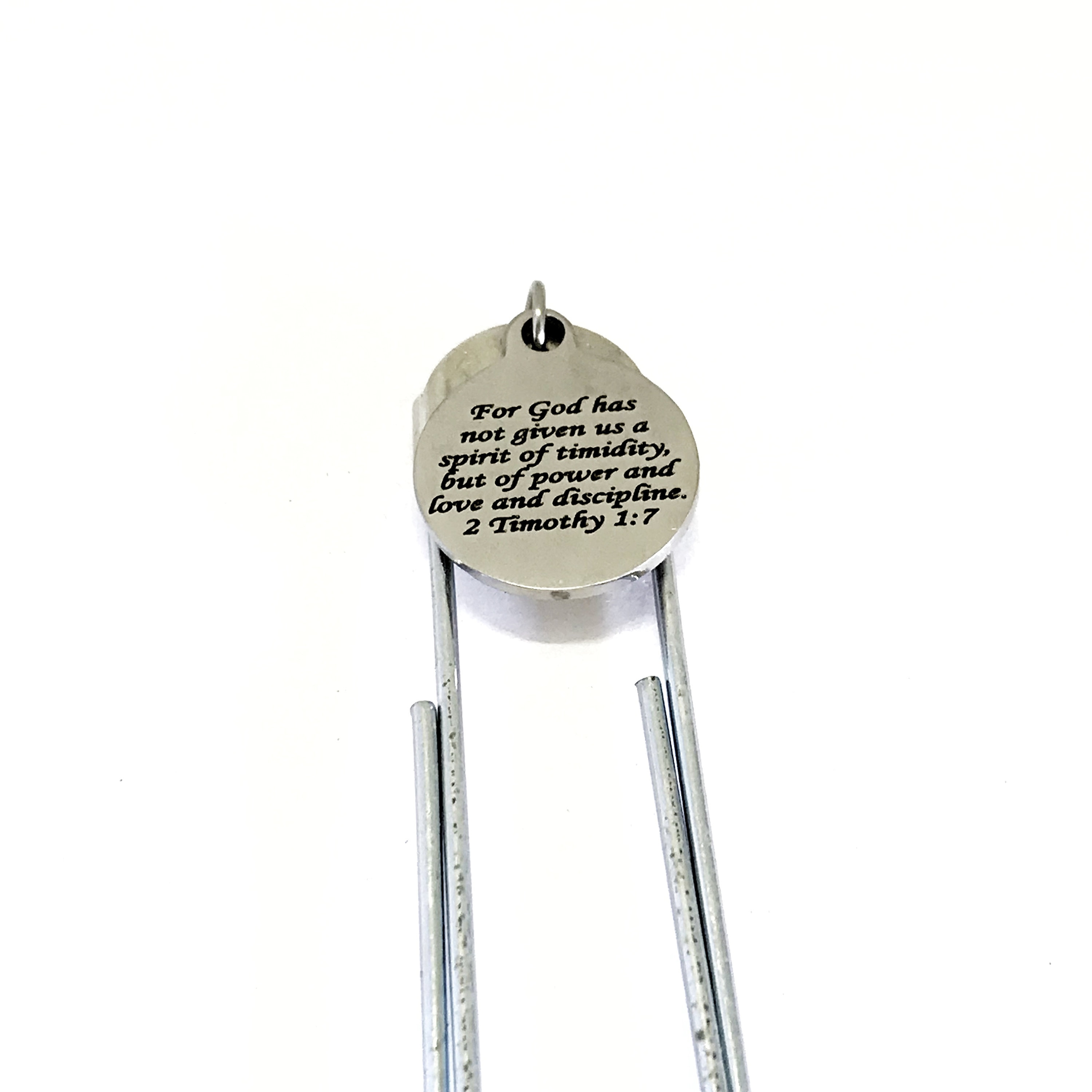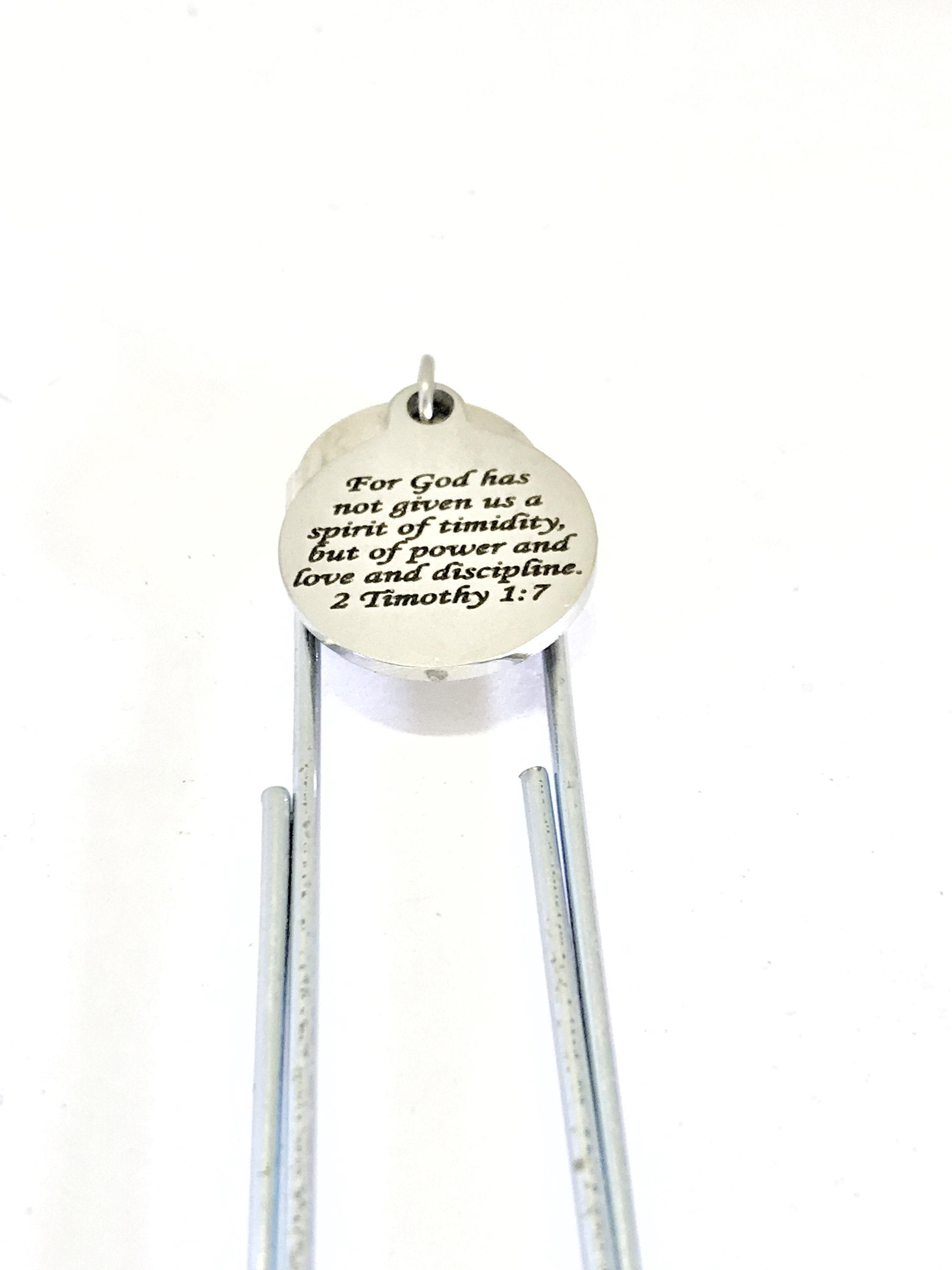 This is a great planner paper clip bookmark that would make a great gift to remind someone that God has given them a spirit of power, not timidity. This paper clip bookmark has a stainless steel laser engraved charm with “For God has not given us a spirit of timidity, but of power and love and discipline” from 2 Timothy 1:7 on it.