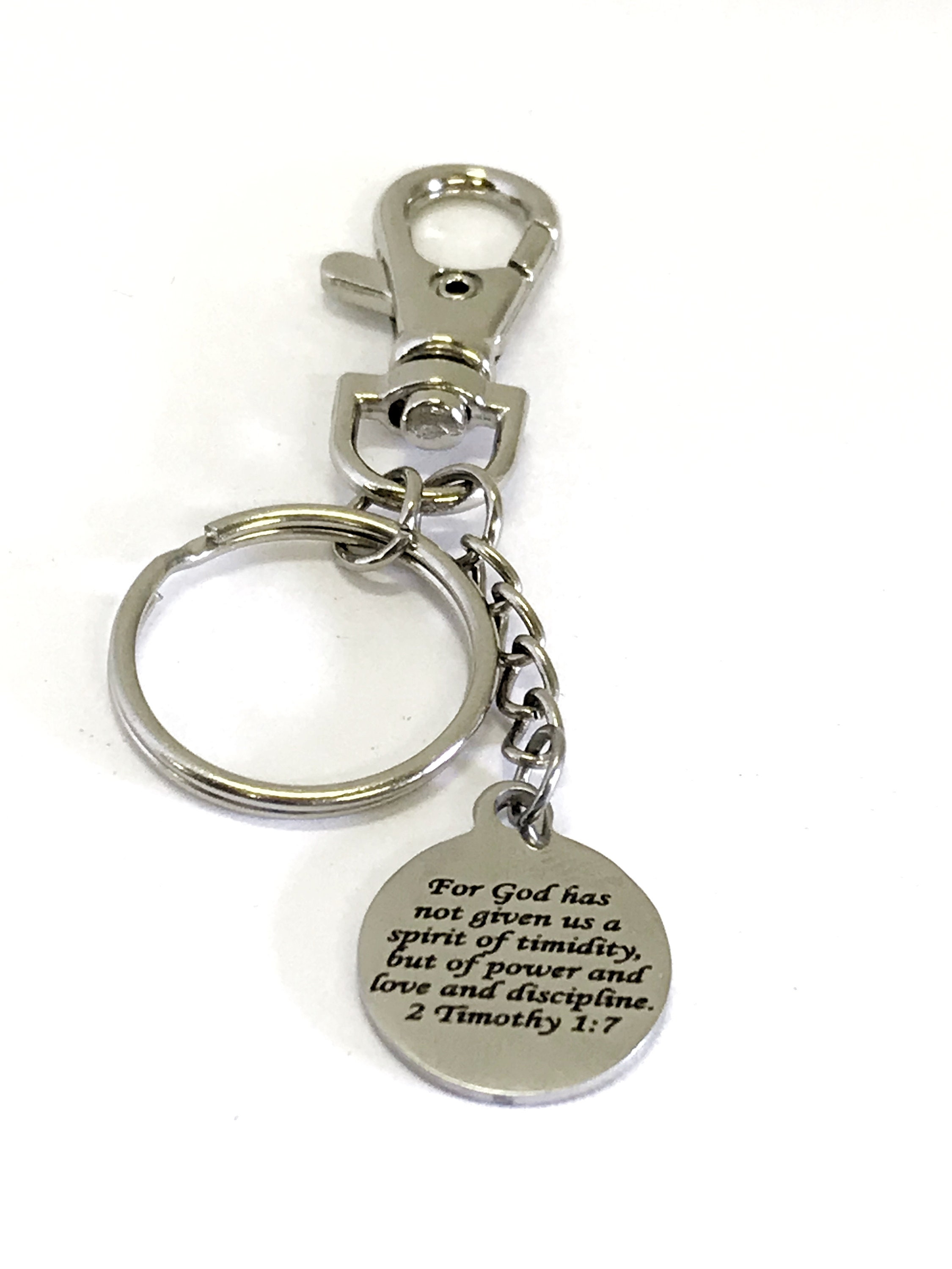 This is a great Christian keychain gift . The keyring can be clipped onto your bag to make it easy to access without digging to the bottom of the bag. It has a stainless steel laser engraved charm with “For God has not given us a spirit of timidity, but of power and love and discipline” from 2 Timothy 1:7 on it.