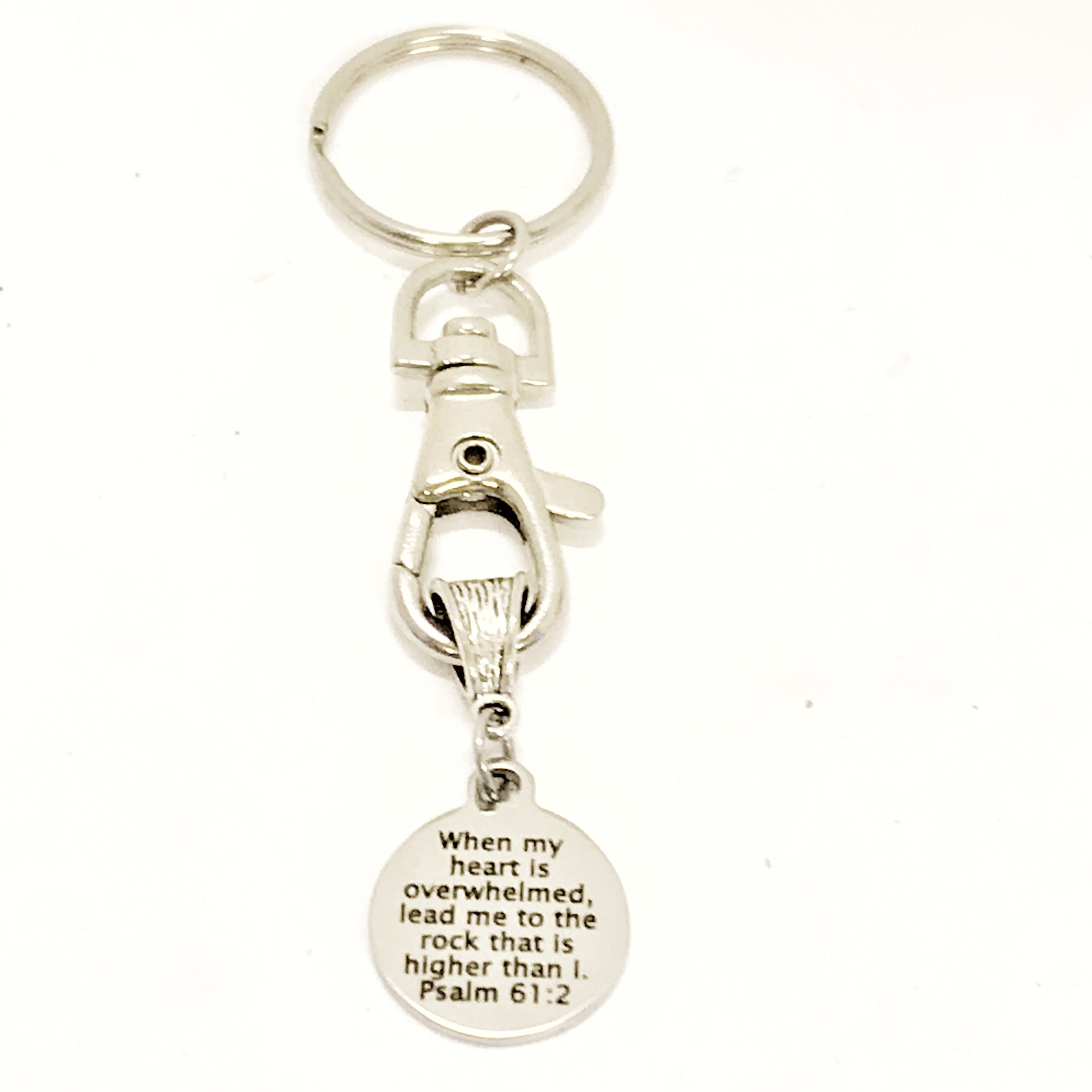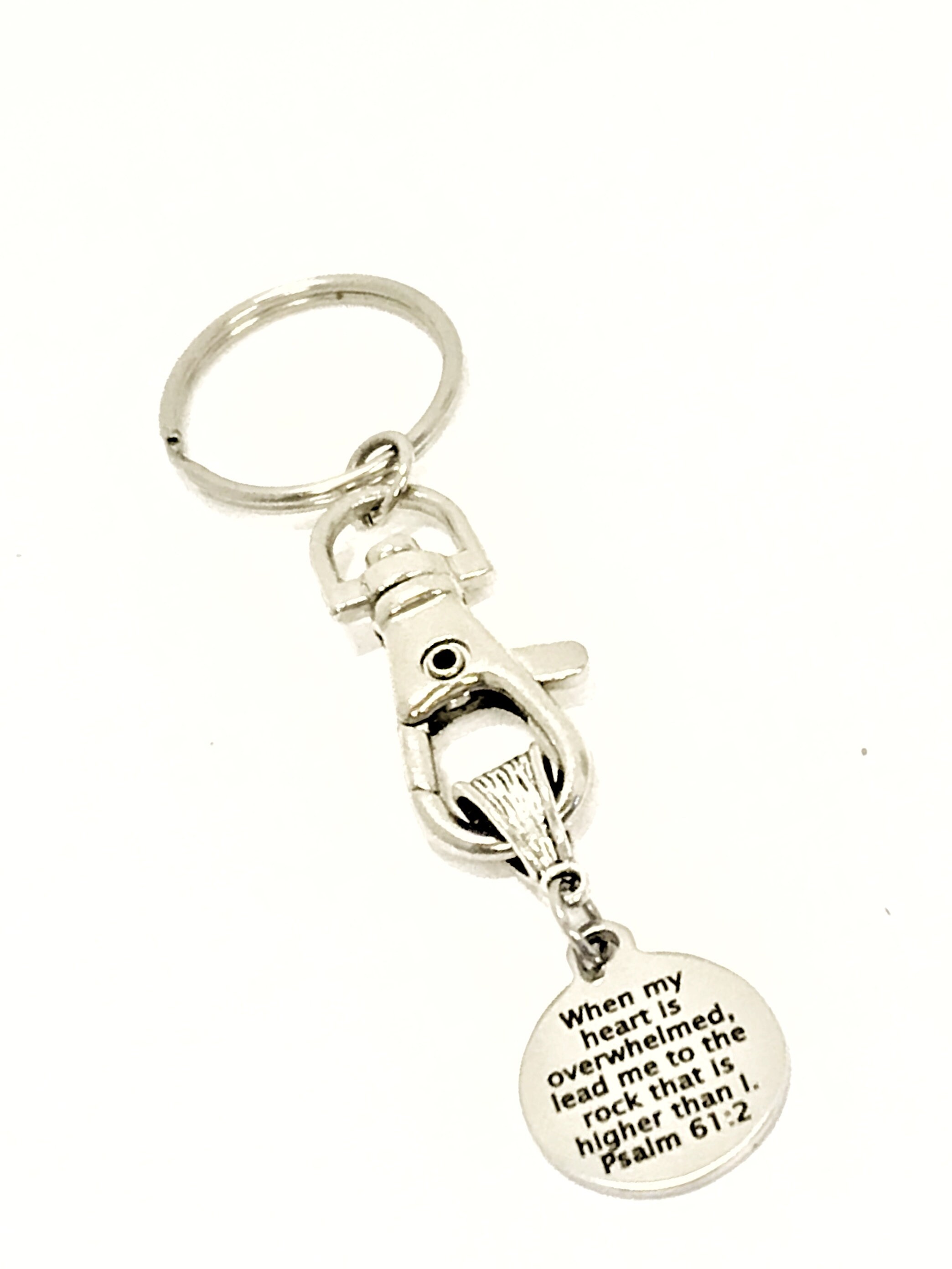 This Christian keychain gift is a great reminder that Jesus is our rock when we are overwhelmed. It has a stainless steel laser engraved charm with “When my heart is overwhelmed, lead me to the rock that is higher than I” from Psalms 61:2 on it.