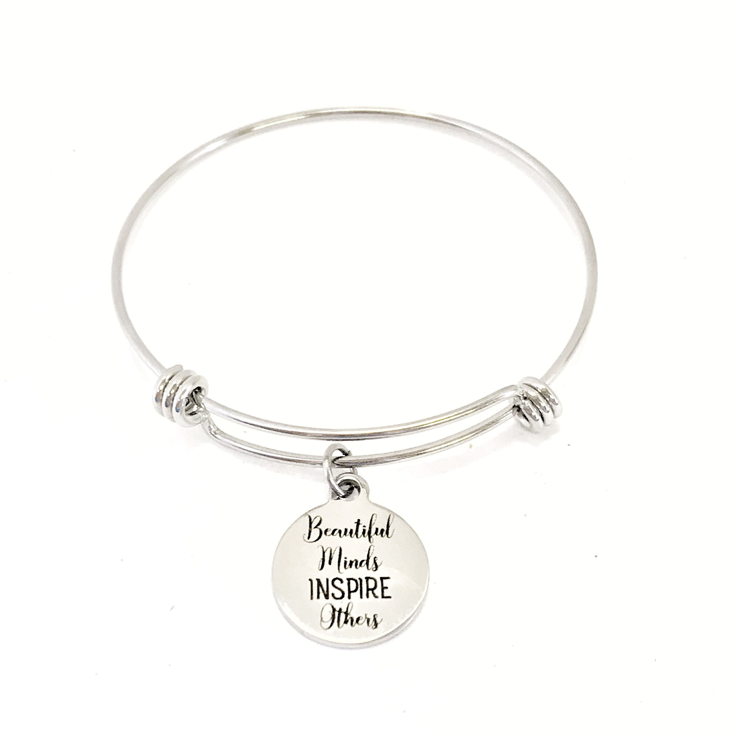 This stacking bangle bracelet is a beautiful gift for a teacher or mentor. It has a stainless steel laser engraved charm that says “Beautiful minds inspire others" on it.