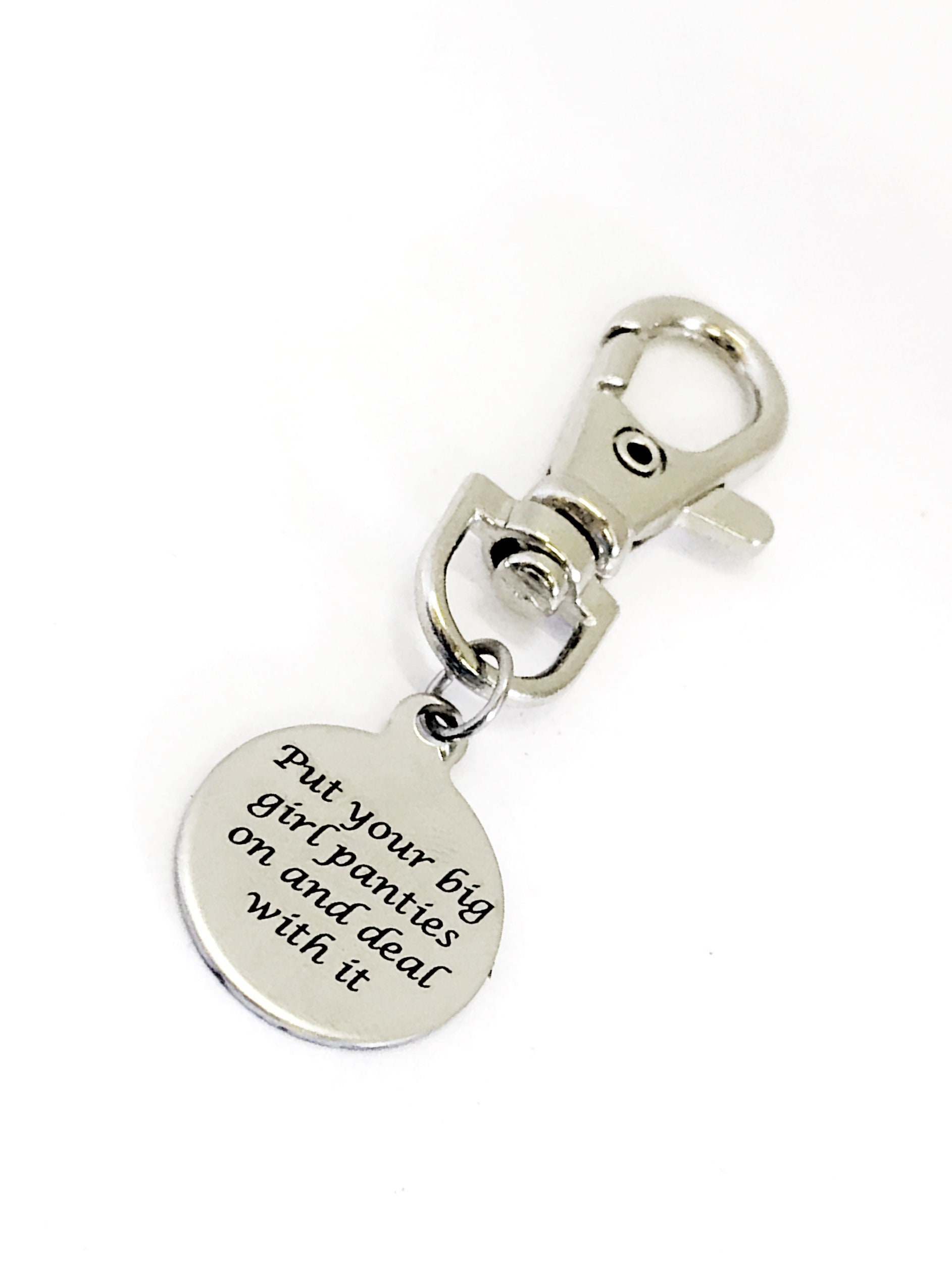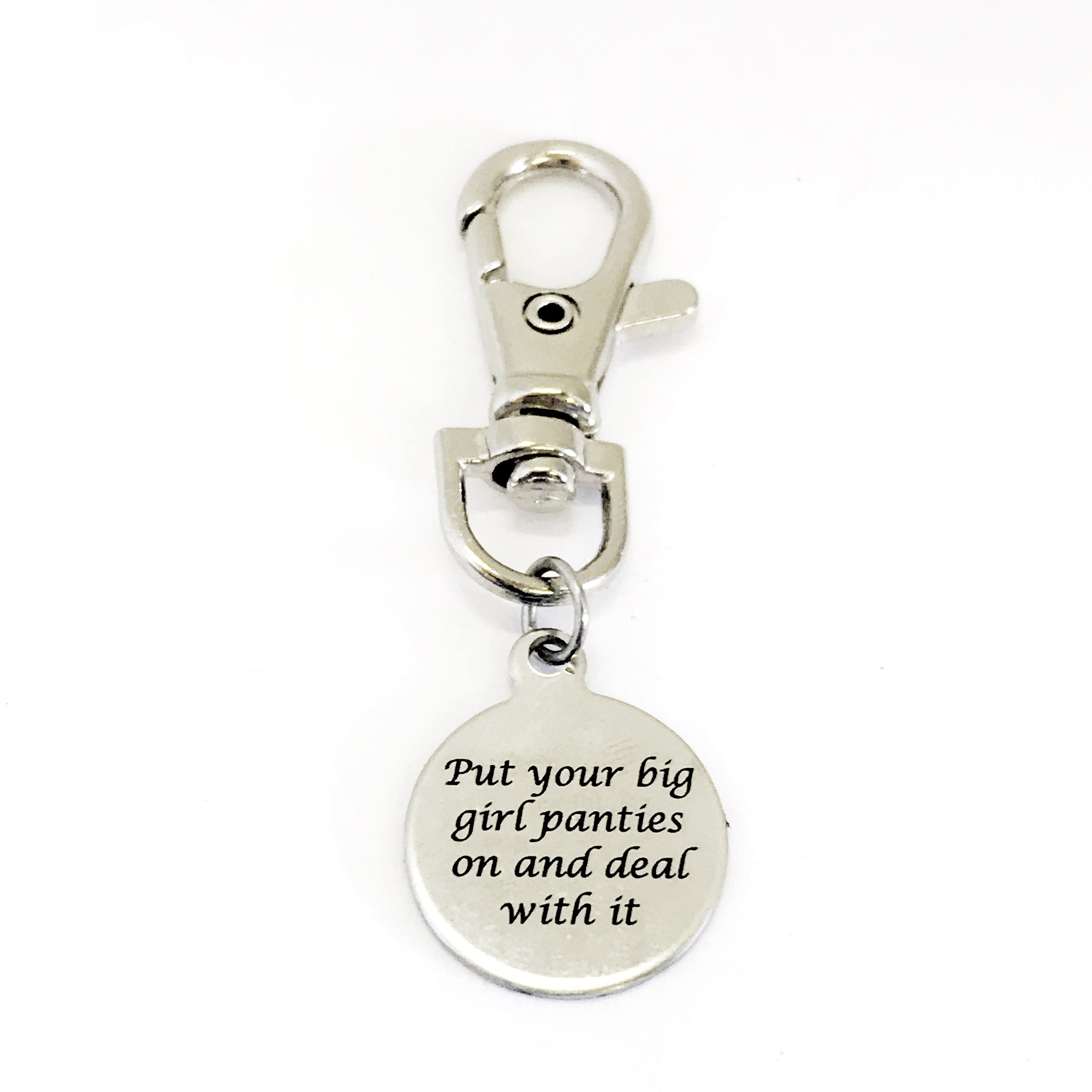 This is a great zipper pull or bag charm gift that would be a perfect reminder to be tough and deal with whatever life throws at you. It has “Put your big girl panties on deal with it” on it.