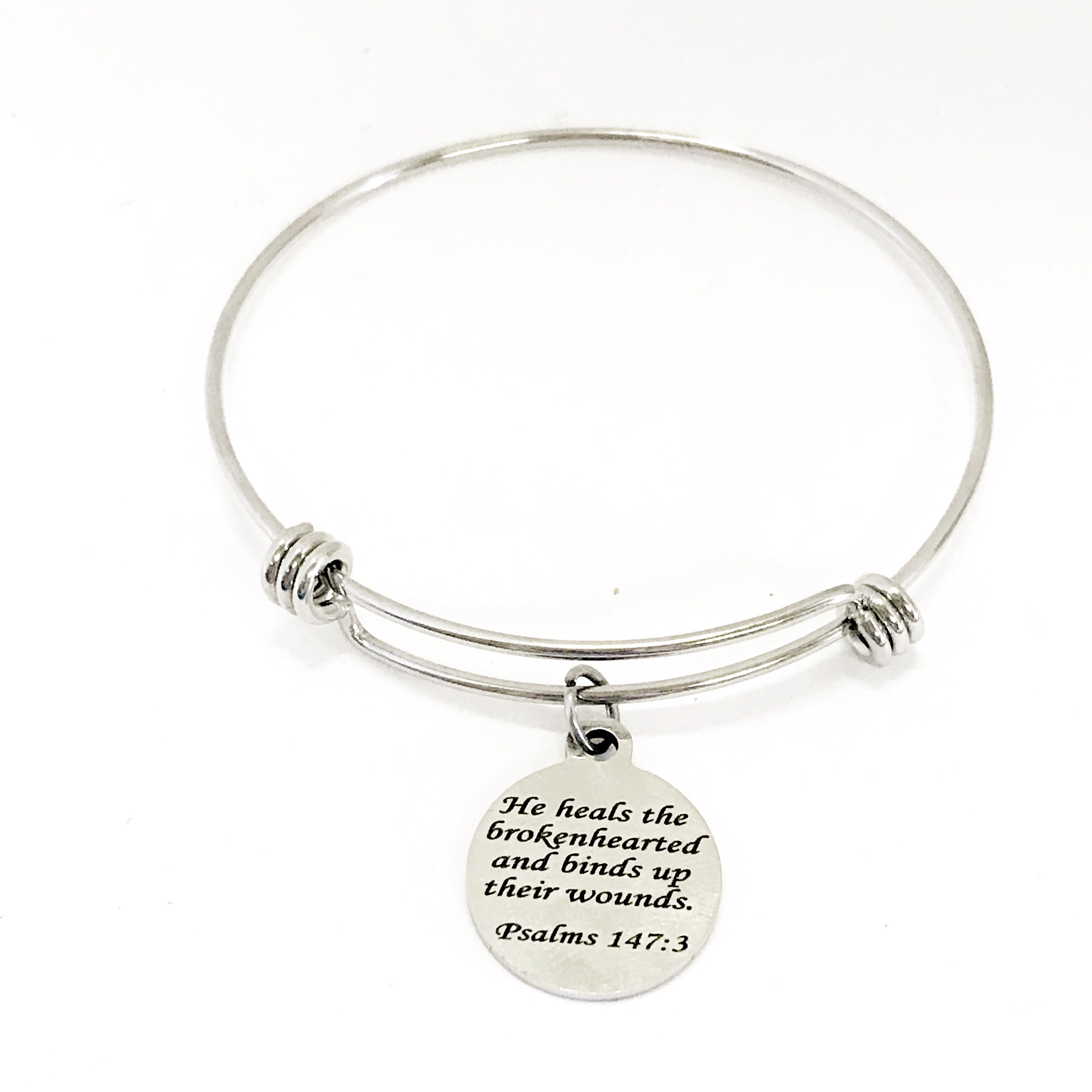 This stacking bangle bracelet is a beautiful Christian gift to remind the wearer that God is our healer when we are brokenhearted. It has a stainless steel laser engraved charm that says “He heals the brokenhearted and binds up their wounds" from Psalms 147:3 on it.