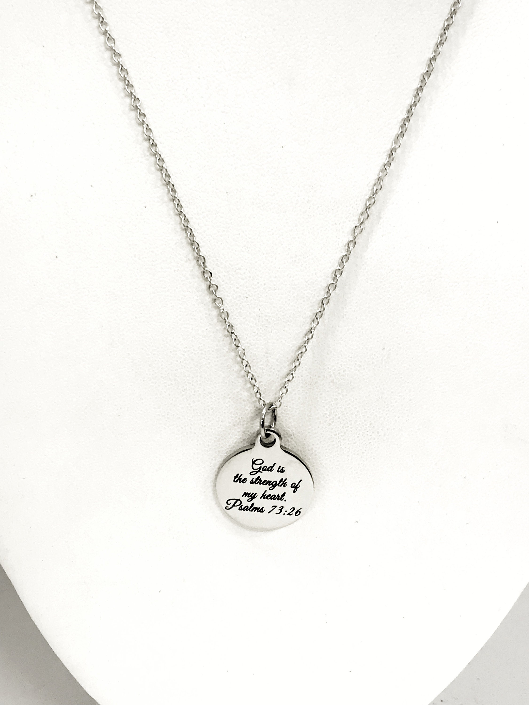 This Christian necklace would make a wonderful reminder that God is our strength even when we don’t feel strong. The pendant is a stainless steel laser engraved pendant with “God is the strength of my heart” from Psalms 73:26 on it.