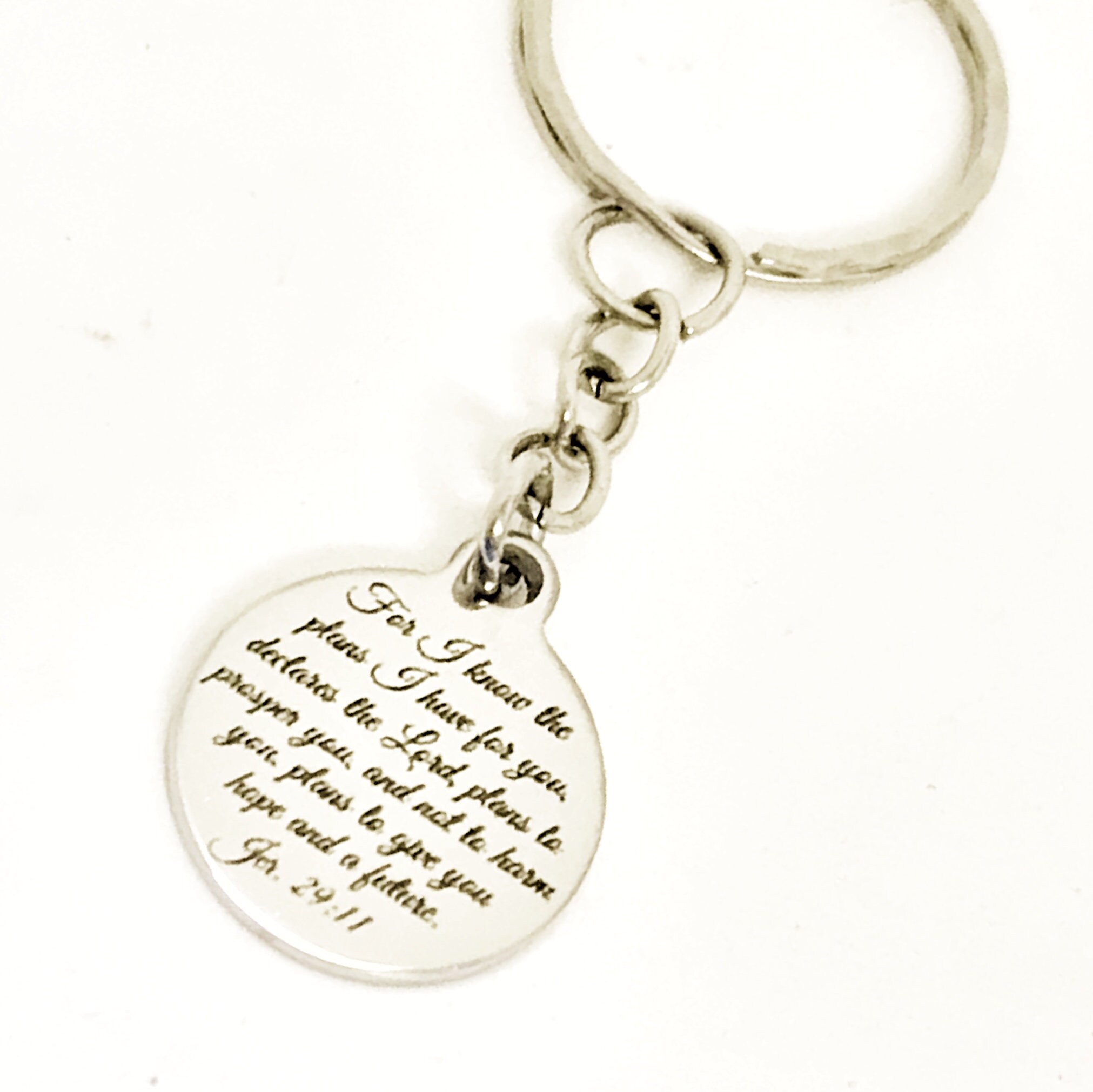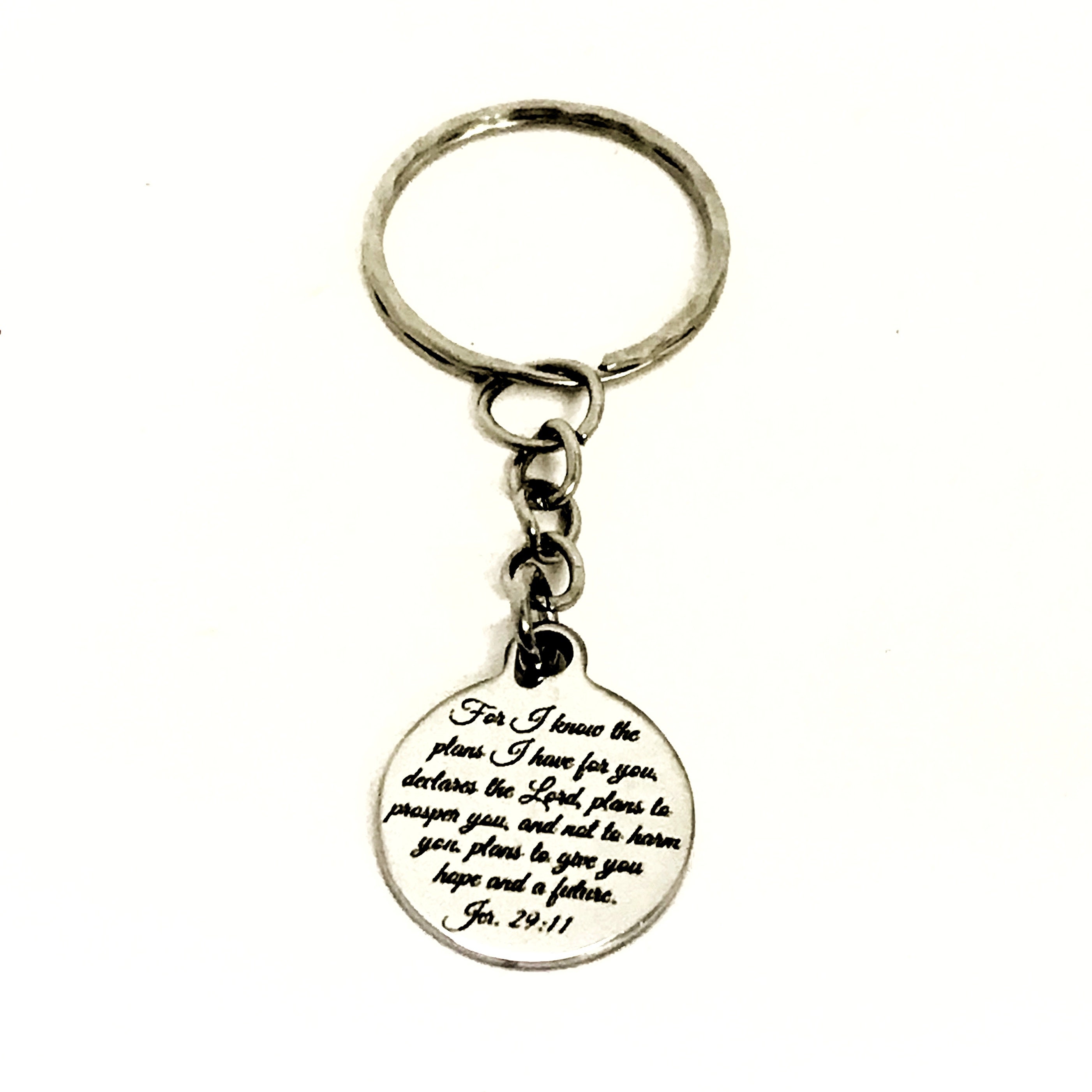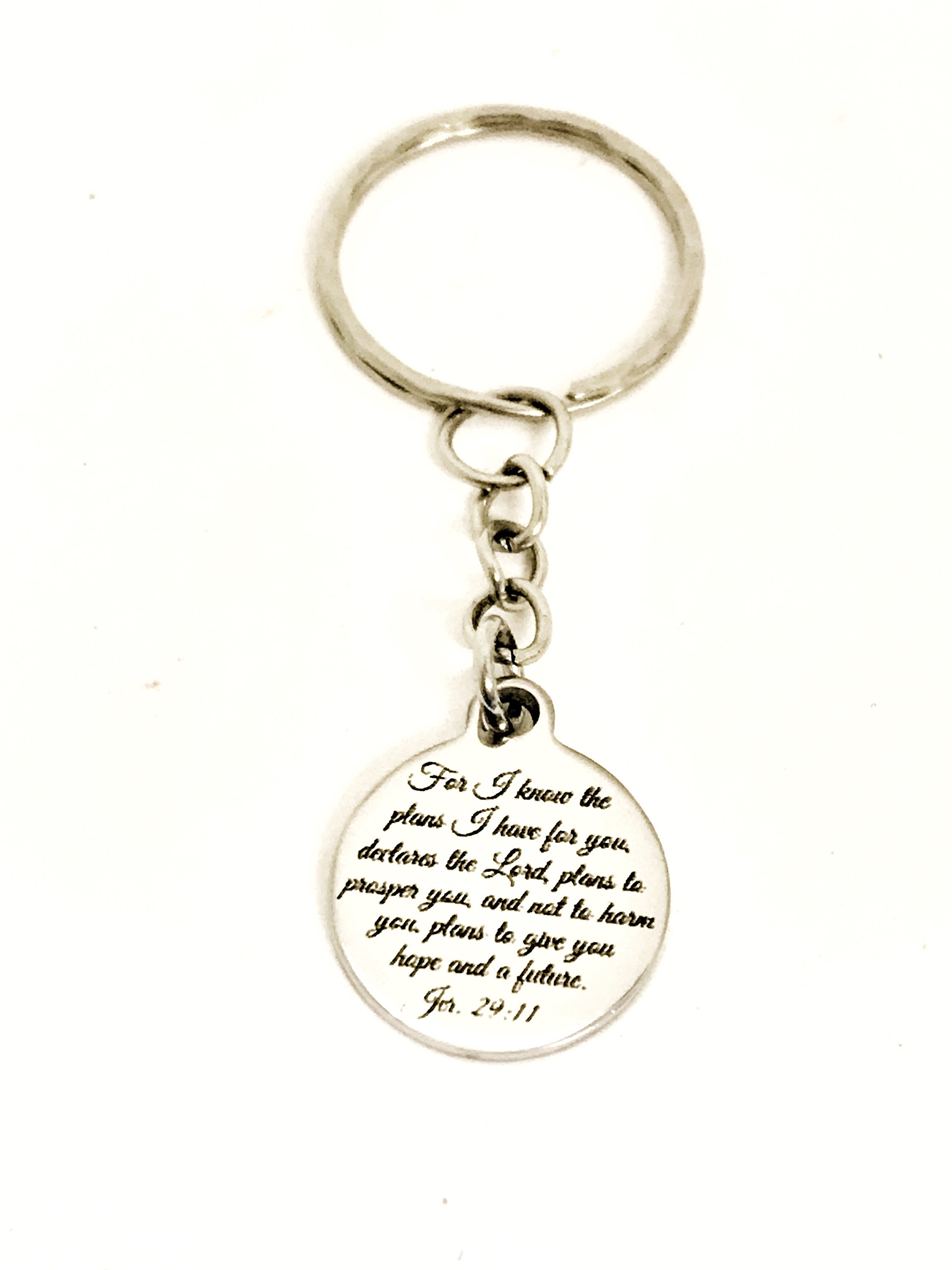 This is a great Christian bible verse keychain gift with a reminder that God’s plans for our lives are to prosper and give us the best life possible. It has a stainless steel laser engraved charm with the following verse from Jeremiah 29:11 on it: