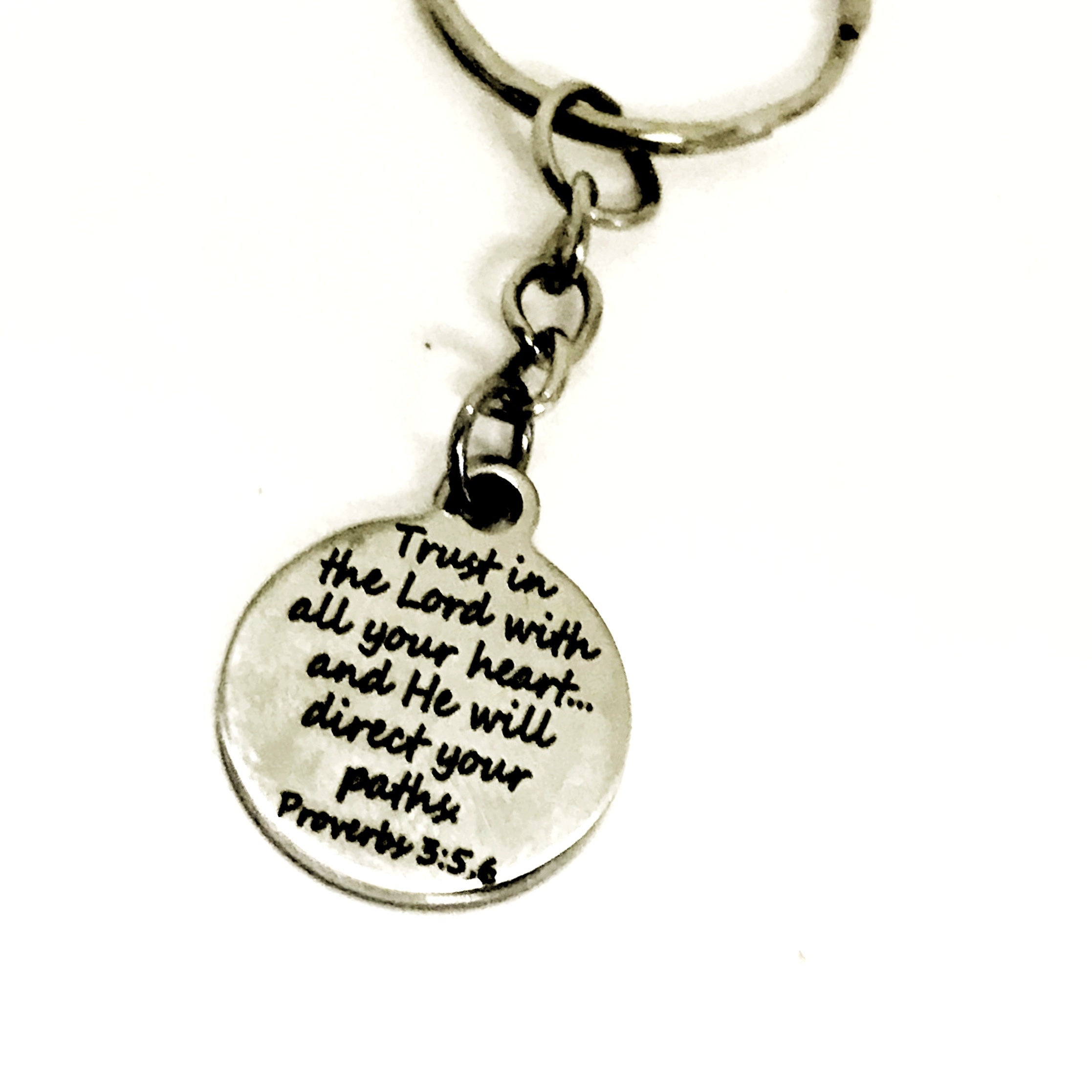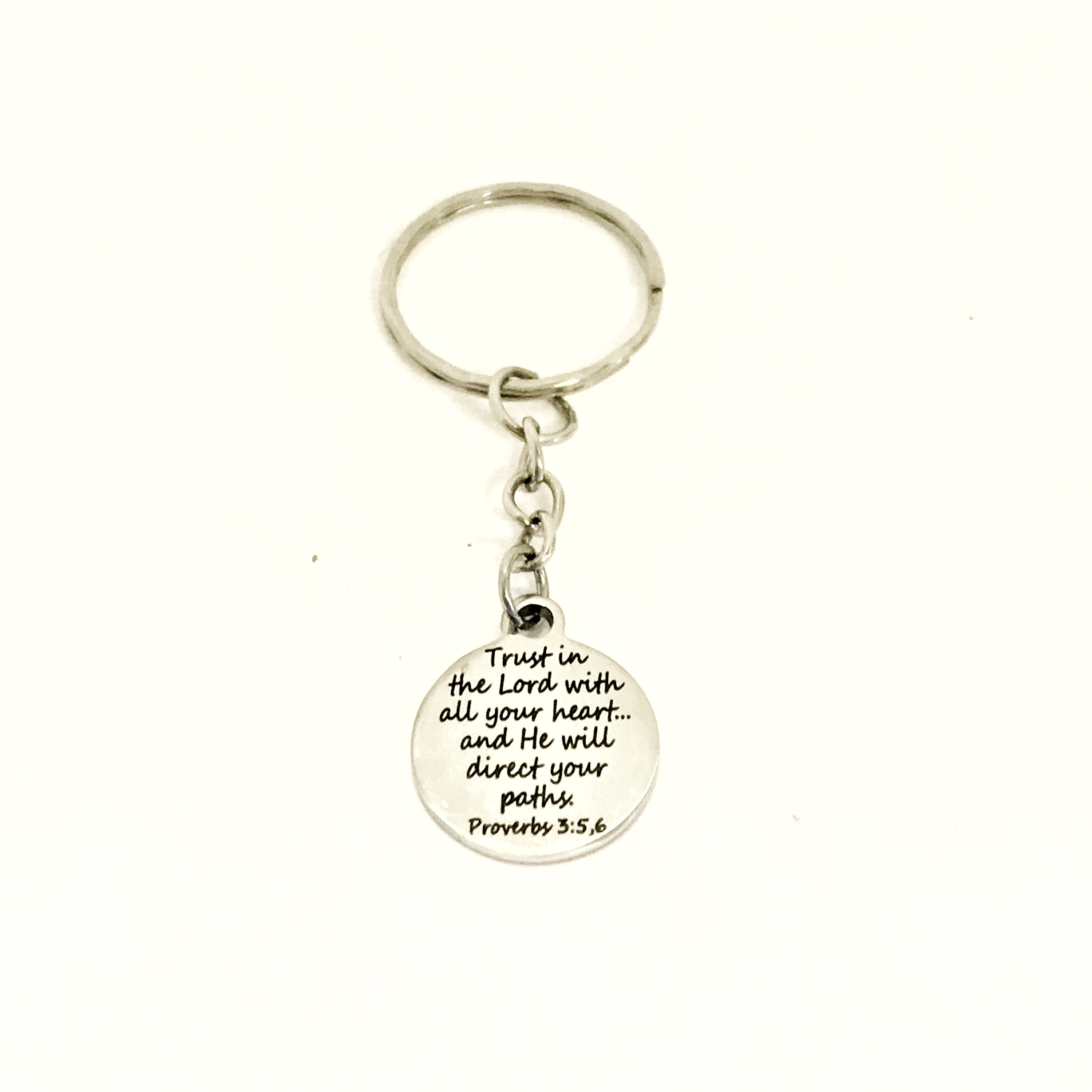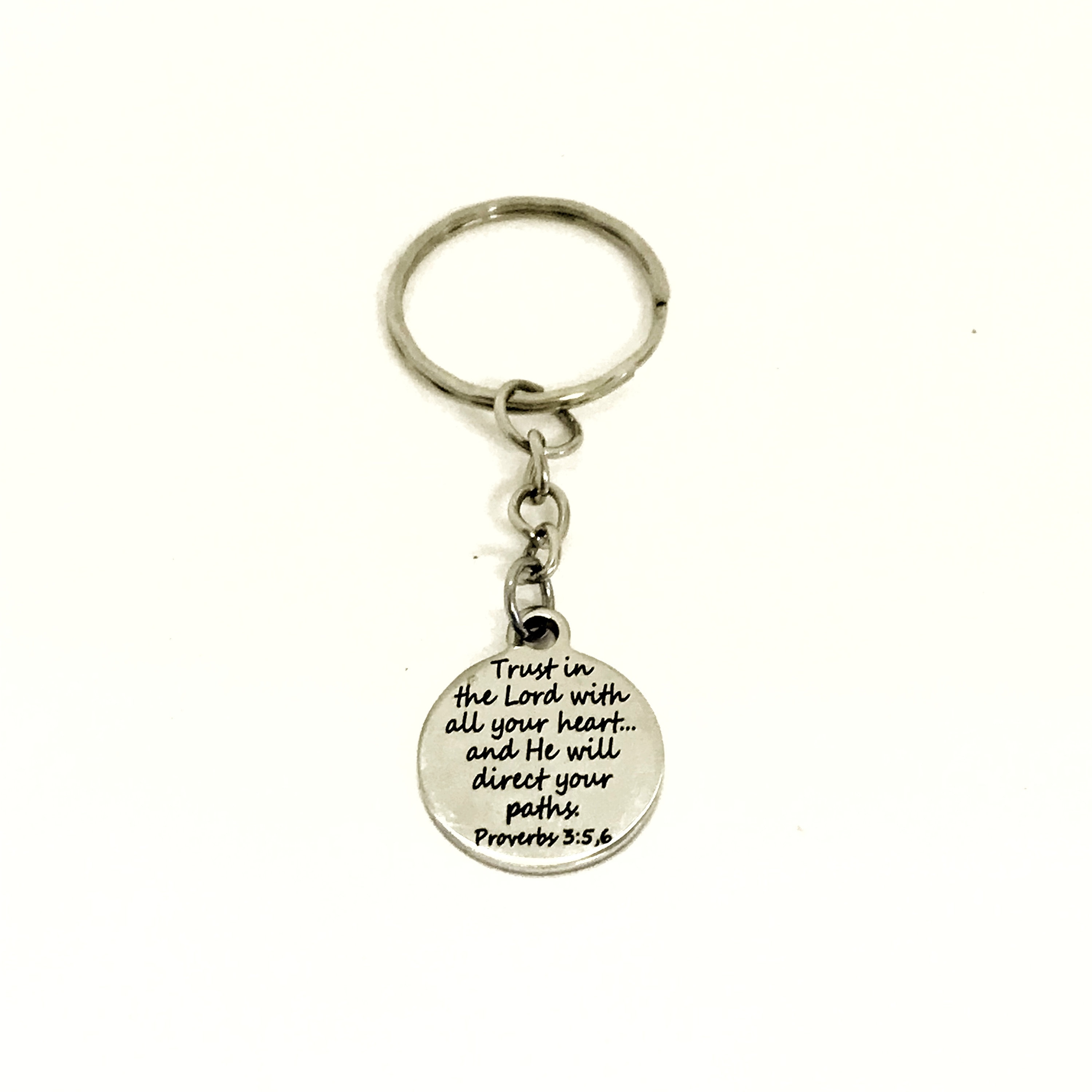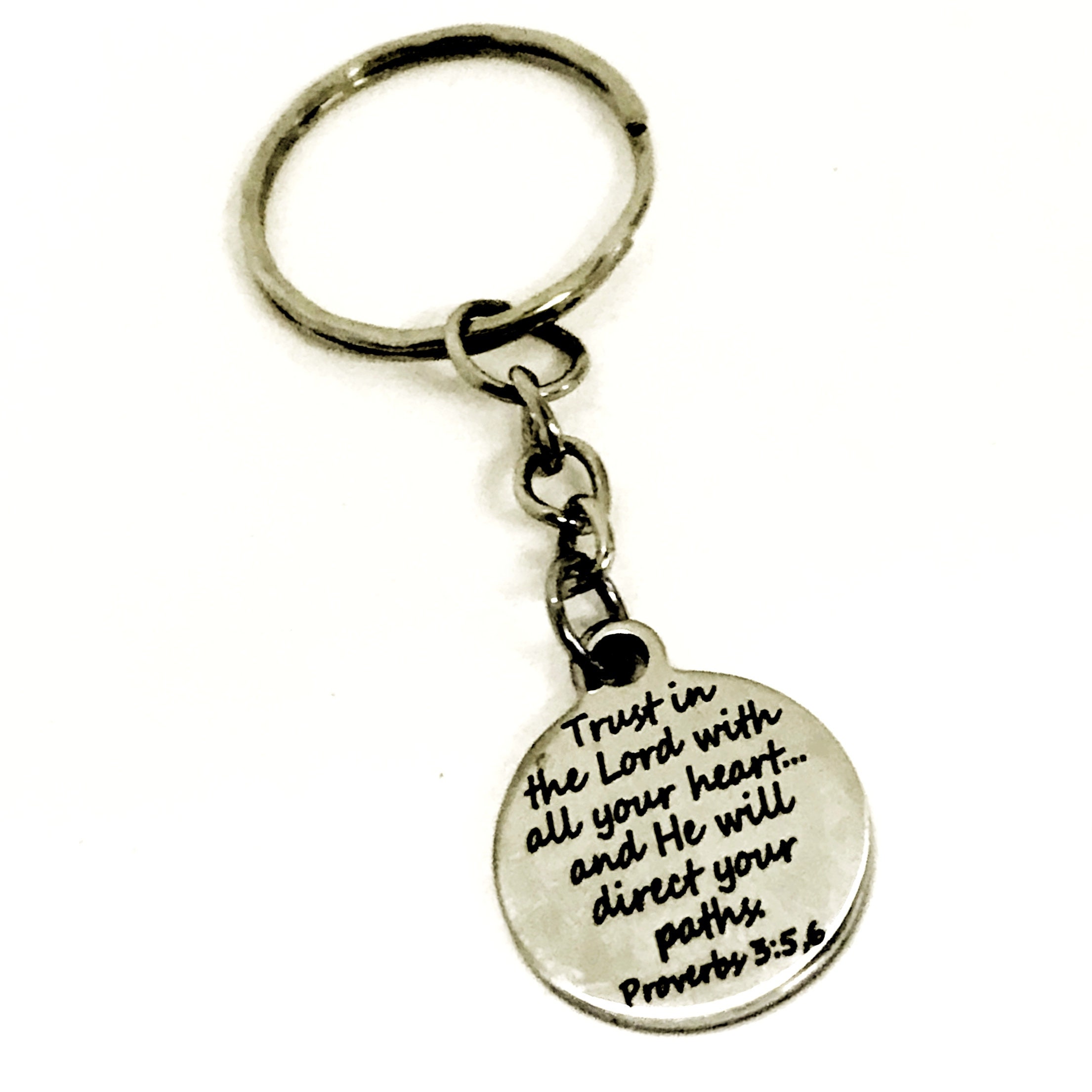 This is a great Christian bible verse keychain gift reminding us to pur our trust in the Lord for Him to guide our paths. It has a stainless steel laser engraved charm with the following verse from Proverbs 3:5 and 6 on it: