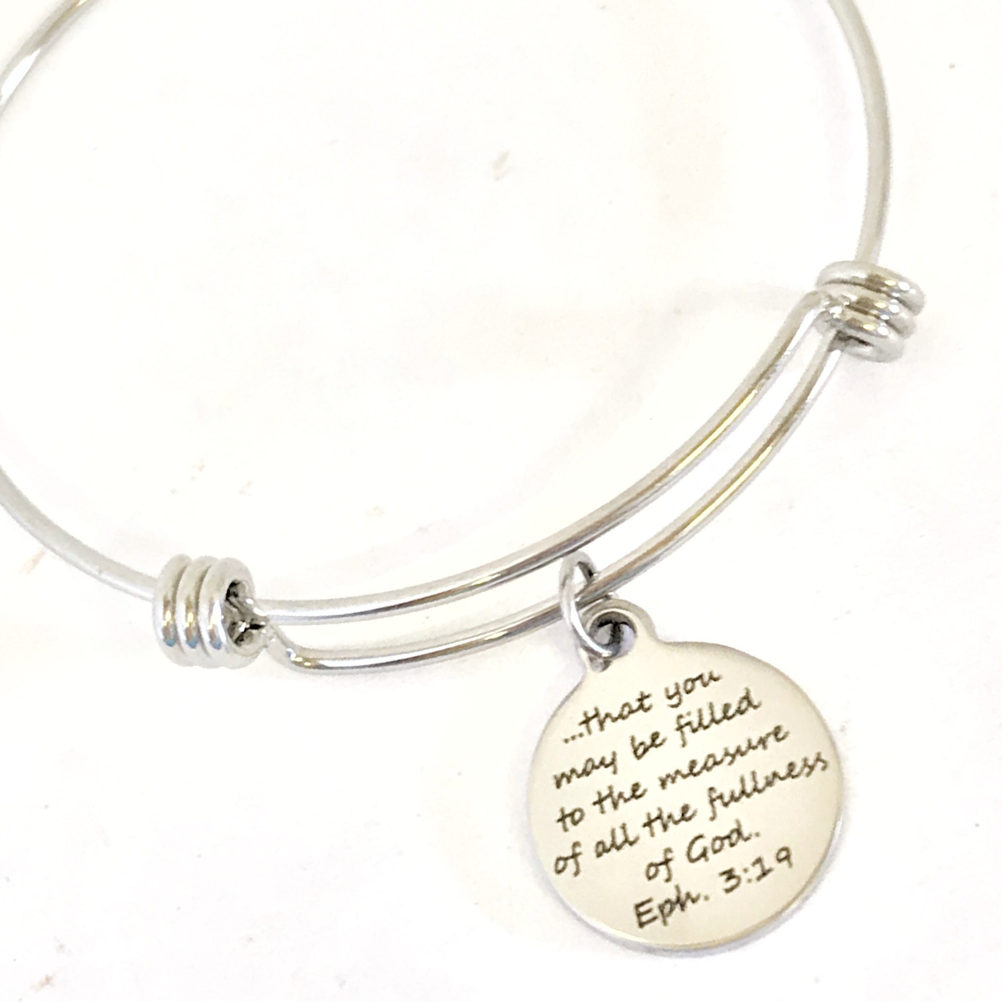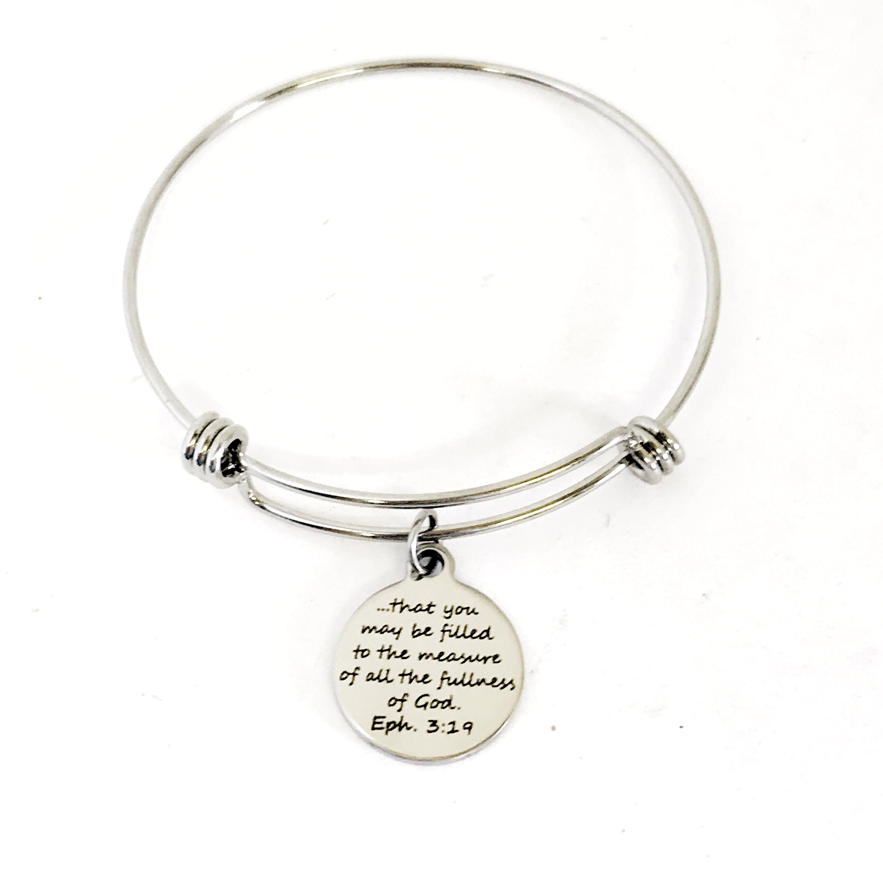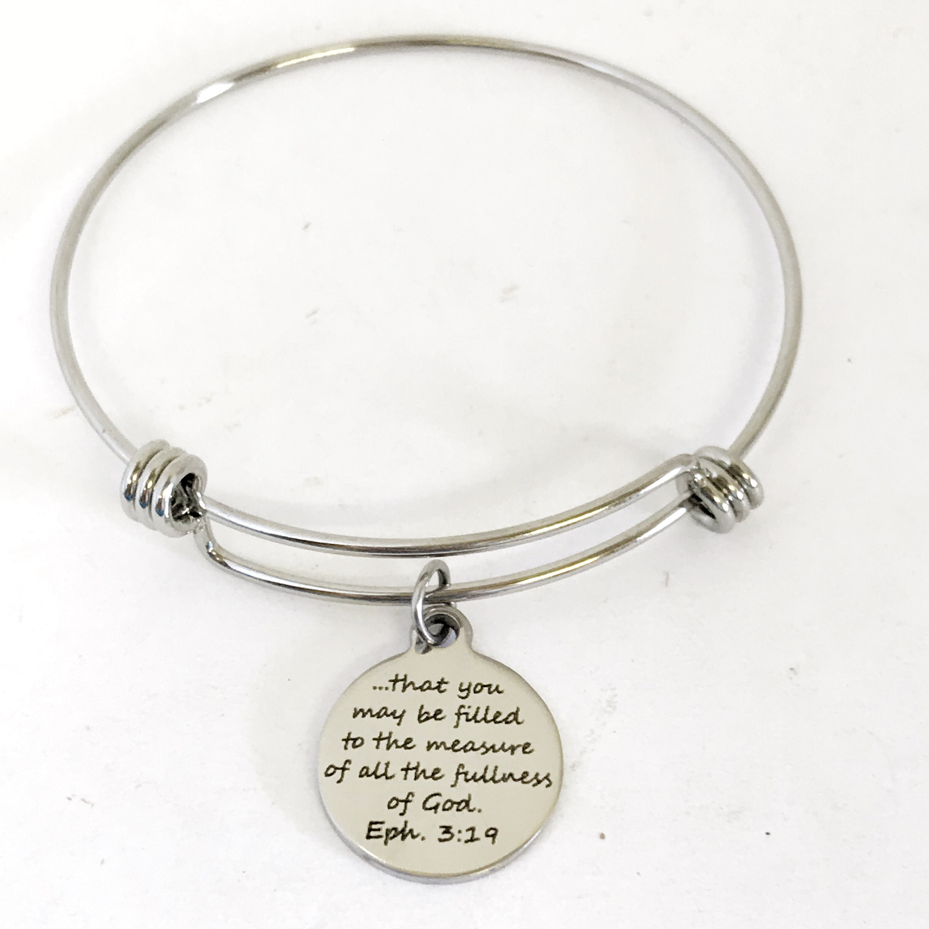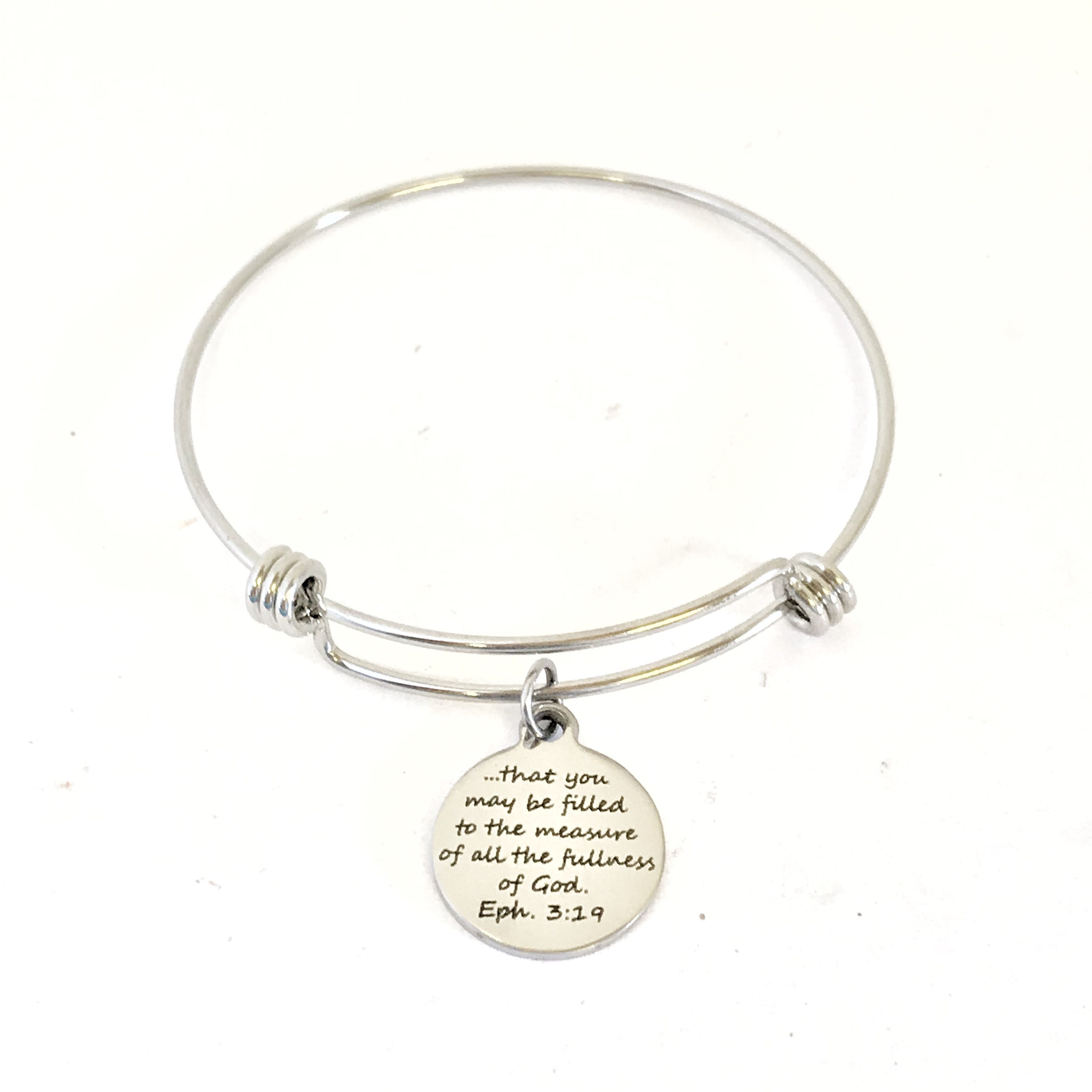 This stacking bangle bracelet is a beautiful Christian gift that reminds us that the love of Christ passes all understanding. It has a stainless steel laser engraved charm with “that you may be filled to the measure of all the fullness of God” from Ephesians 3:19 on it.