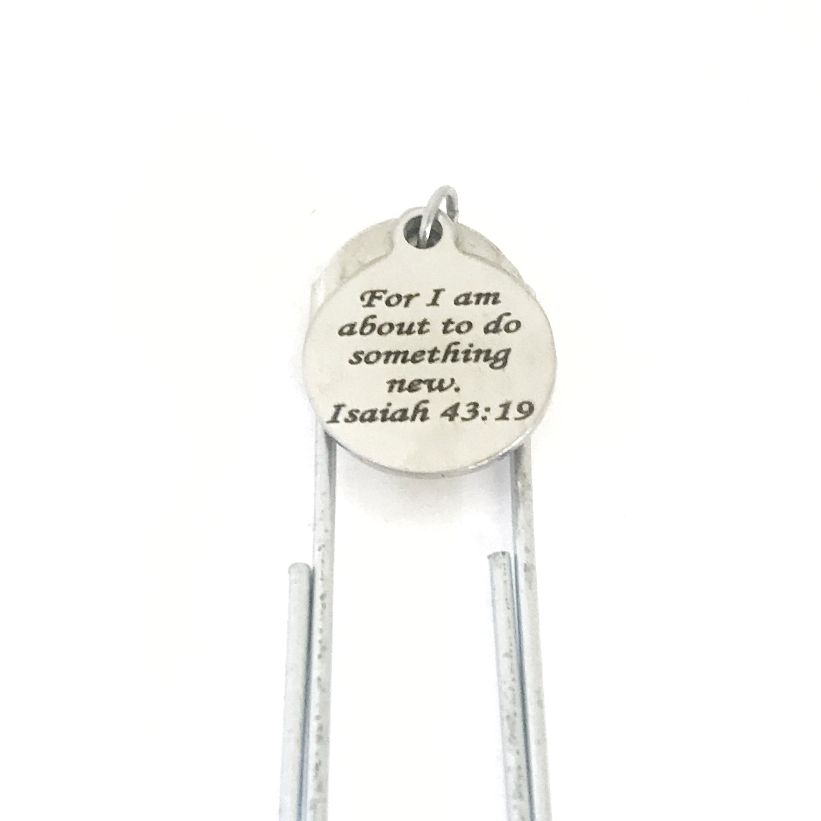 This is a great encouraging bookmark to remind someone that God can do something new in their lives to make it better than it has ever been before. This paper clip bookmark has a stainless steel laser engraved charm with “For I am about to do something new” from Isaiah 43:19 on it. It can be used as a bookmark, page marker, or planner book mark.