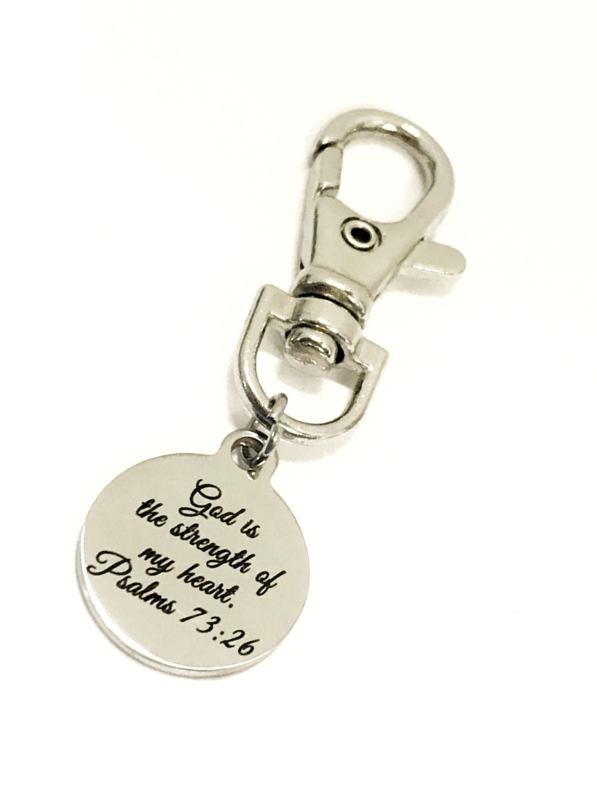 This is a great zipper pull or bag charm gift that would be a perfect reminder of the Bible verse of Psalms 73:26 that tells us that “God is the strength of my heart”.