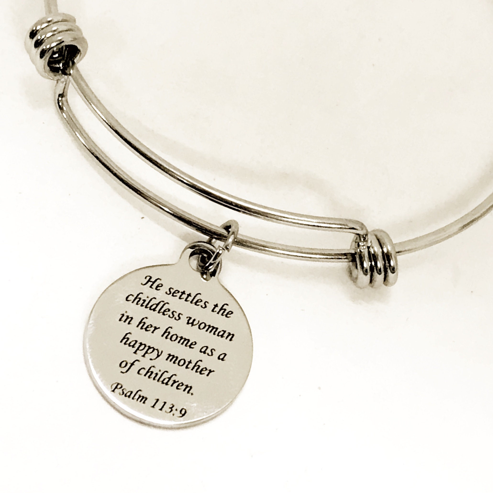 This stacking bangle bracelet would be a great Christian jewelry gift for someone that is leaning on God’s promise when enduring the pain of infertility. It would also be a great gift for someone building their family through the miracle of adoption. It has a stainless steel laser engraved charm with “He settles the childless woman in her home as the happy mother of children” from Psalms 113:9 on it.